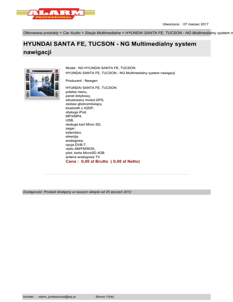 Utworzono : 07 marzec 2017 Oferowane produkty > Car Audio > Stacje Multimedialne > HYUNDAI SANTA FE, TUCSON - NG Multimedialny system n HYUNDAI SANTA FE, TUCSON - NG Multimedialny system nawigacji Model : NG HYUNDAI SANTA FE, TUCSON HYUNDAI SANTA FE, TUCSON - NG Multimedialny system nawigacji Producent : Newgen HYUNDAI SANTA FE, TUCSON polskie menu, panel dotykowy, wbudowany moduł GPS, zestaw głośnomówiący, bluetooth z A2DP, obsługa iPod, MP3/MP4, USB, obsługa kart Micro SD, zegar, kalendarz, elewizja analogowa, opcja DVB-T, radio AM/FM/RDS, pilot, karta MicroSD 4GB antena analogowa TV Cena : 0,00 zł Brutto ( 0,00 zł Netto) Dostępność: Produkt dostępny w naszym sklepie od 25 styczeń 2012 kontakt : - [email protected] Strona 1/{nb}