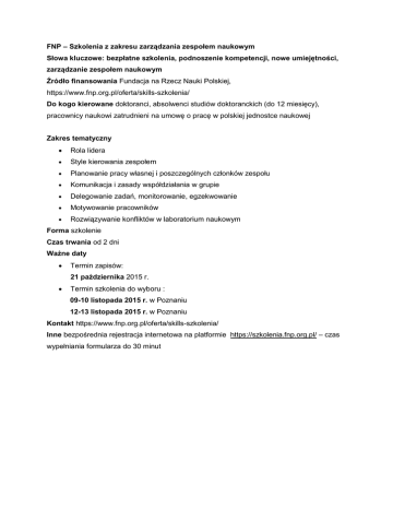 FNP – Szkolenia z zakresu zarządzania zespołem naukowym Słowa kluczowe: bezpłatne szkolenia, podnoszenie kompetencji, nowe umiejętności, zarządzanie zespołem naukowym Źródło finansowania Fundacja na Rzecz Nauki Polskiej, https://www.fnp.org.pl/oferta/skills-szkolenia/ Do kogo kierowane doktoranci, absolwenci studiów doktoranckich (do 12 miesięcy), pracownicy naukowi zatrudnieni na umowę o pracę w polskiej jednostce naukowej Zakres tematyczny Rola lidera Style kierowania zespołem Planowanie pracy własnej i poszczególnych członków zespołu Komunikacja i zasady współdziałania w grupie Delegowanie zadań, monitorowanie, egzekwowanie Motywowanie pracowników Rozwiązywanie konfliktów w laboratorium naukowym Forma szkolenie Czas trwania od 2 dni Ważne daty Termin zapisów: 21 października 2015 r. Termin szkolenia do wyboru : 09-10 listopada 2015 r. w Poznaniu 12-13 listopada 2015 r. w Poznaniu Kontakt https://www.fnp.org.pl/oferta/skills-szkolenia/ Inne bezpośrednia rejestracja internetowa na platformie https://szkolenia.fnp.org.pl/ – czas wypełniania formularza do 30 minut