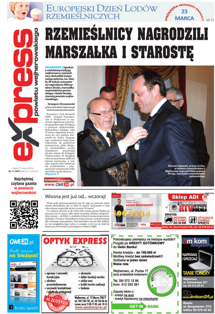 RZEMIEŚLNICY NAGRODZILI MARSZAŁKA I STAROSTĘ WEJHEROWO | Zgodnie z wieloletnią tradycją wejherowscy rzemieślnicy obchodzili święto swego patrona, św. Józefa. W trakcie uroczystości nagrodzono Mieczysława Struka, marszałka województwa pomorskiego i Józefa Reszke, starostę powiatu wejherowskiego. Grzegorz Bryszewski [email protected] Piątek, 21 marca 2014 r. Nr 11 (341) NAKŁAD 12 000 EGZ. Najchętniej czytana gazeta w powiecie wejherowskim Powiatowy Cech Rzemiosł MiSP - Związek Pracodawców w Wejherowie to najstarsza organizacją samorządu gospodarczego działającą w powiecie wejherowskim. Rzemieślnicy każdego roku 19 marca organizują uroczystości ku czci patrona Rzemiosła św. Józefa. Program tego wydarzenia tradycyjnie rozpoczyna się grupowym przemarszem, gdzie delegacje rzemieślników, poczty sztandarowe przechodzą ulicami miasta do Kolegiaty Wejherowskiej. W ubiegłym roku ten przemarsz zakłóciła śnieżna zawierucha, w tym roku pogoda była łaskawsza dla rzemieślników i przemarszowi towarzyszyły tylko niewielkie opady deszczu. Więcej str. 3 Wiosna jest już od... wczoraj! Wiele osób przyzwyczajonych jest do tego, że pierwszy dzień wiosny obchodzony jest co roku 21 marca. Tymczasem w tym roku wiosna rozpoczęła się już wczoraj, 20 marca! Co ciekawe od teraz aż do 2102 roku wiosna zawsze będzie się zaczynać nie 21 marca, tylko dzień wcześniej. Później nastąpi kolejna zmiana – od 2044 r. w niektórych latach wiosna rozpoczynać się będzie 19 marca. Wszystkiemu winny jest tzw. ruch precesyjny, jaki wykonuje nasza planeta. Nasz kalendarz nie jest zbyt dokładny, nie uwzględnia tego ruchu, w związku z tym raz na wiele lat konieczna jest korekta i przesunięcia w datach. (raf) Brunon Gajewski, prezes Cechu, w imieniu rzemieślników z Wejherowa nagrodził Mieczysława Struka, marszałka województwa pomorskiego www.gwe24.pl WYDARZENIA | KULTURA | SPORT 3 Świętował Cech Rzemiosł WEJHEROWO | W dzień św. Józefa, patrona rzemieślników, tradycyjnie już świętowali członkowie zrzeszeni w Powiatowym Cechu Rzemiosł MiSP - Związku Pracodawców w Wejherowie. Fot. KBS w Wejherowie Nasze umiejętności widziane przez dzieci Zwycięska praca Amelii Roczyniewskiej KONKURS | Obrady komisji, mające na celu wyłonić najciekawszą pracę w konkursie „Nasze Umiejętności”, niedawno się odbyły. W konkursie organizowanym przez Kaszubski Bank Spółdzielczy w Wejherowie wzięło udział łącznie 14 Szkół Podstawowych z powiatu wejherowskiego oraz powiatu kartuskiego. Są to szkoły: SP w Ciekocinie, SP w Choczewie, SSP im. Księdza Galasa w Kostkowie, SSP im. Gabriela Narutowicza w Gniewinie, SP w Rozłazinie, SP w Łęczycach, SP nr 3 w Redzie, SP nr 2 w Redzie, SP przy ZKiW w Kamienicy Szlacheckiej, SP w Stężycy, SP w Szymbarku, SP Zgromadzenia Sióstr Zmartwychwstania w Wejherowie, Powiatowy Zespół Kształce- nia Specjalnego w Wejherowie, SP nr 9 w Wejherowie. Szkoły dostarczyły łącznie 142 prace plastyczne wykonane różnymi technikami. Pięcioosobowa komisja, w której skład weszli dyrektorzy wybranych oddziałów Kaszubskiego Banku Spółdzielczego oraz dyrektor ds. handlowych, po burzliwych obradach wybrali w pierwszym etapie najciekawszą pracę z każdej Szkoły Podstawowej. W kolejnym etapie wybrana została “Ta Jedna Jedyna” najciekawsza praca plastyczna, a także przyznane zostało aż 5 wyróżnień. WYNIKI: Nagroda główna (Play Station 3) – Amelia Roczyniewska kl. IIc SP nr 3 w Redzie Wyróżnienia: Wiktoria Karmazy kl. IIa Szkoła Podstawowa w Choczewie, Wojciech i Maciej Kupiszka kl. IIa SP w Szymbarku, Michał Fuhrmann kl. IIb SP w Gniewinie, Wiktoria Krzos kl. IIa SP w Rozłazinie, Oskar Marcinkowski-Okrój kl. IIa SP Sióstr Zmartwychwstanek w Wejherowie. Zwycięską pracę plastyczną oraz prace wyróżnione można oglądać w zewnętrznej gablocie Kaszubskiego Banku Spółdzielczego w Wejherowie przy ul. Puckiej 5. (raf) 30 tys. zł dla Gryfa Wejherowo od powiatu Fot. Daria Dunajska Jeszcze przed rozpoczęciem mszy świętej rzemieślnicy złożyli kwiaty przed obeliskiem na skwerze Jana Pawła II. Mszę święta w kolegiacie odprawił ks. prałat Tadeusz Reszka. W swojej homilii kapelan rzemieślników ks. Tadeusz podkreślił potrzebę rzetelnej i sumiennej pracy na rzecz miasta i potrzeby rodziny. Za wzór dla braci rzemieślniczej stawiał postać św. Józefa, jako patrona rzemiosła i strażnika Świętej Rodziny. W trakcie nabożeństwa wystąpił także Chór Camerata Musicale. Po mszy św. uroczystość przeniosła się do wejherowskiej Tawerny, gdzie przedstawiciele cechu nagrodzili współpracujących z nimi samorządowców. Złotą odznakę cechu otrzymał Mieczysław Struk, marszałek województwa pomorskiego i Józef Reszke, starosta powiatu wejherowskiego. Wejherowski starosta jako solenizant otrzymał także od rzemieślników kwiaty i odśpiewano mu „100 lat”. Marszałek Struk otrzymał również statuetkę od kapelana rzemieślników, a podczas swojego wystąpienia podkreślał, że w województwie pomorskim aż 90 procent wszystkich firm stanowią mikrofirmy oraz małe i średnie przedsiębiorstwa. - Dzisiaj chciałbym złożyć Państwu wielki hołd za ciężką pracę. Nie byłoby tak wielu odrestaurowanych zabytków, Uroczystości rozpoczął przemarsz do Kolegiaty Wejherowskiej gdyby nie rzemiosło. Nie byFot. Grzegorz Bryszewski Grzegorz Bryszewski [email protected] łoby tak wielu fantastycznych dóbr, ale nie takich jak Ikea, tylko takich, które mają swoją duszę, które mają swoją atmosferę i konkretny przekaz,.gdyby nie rzemiosło. Za to wszystko chciałbym Państwu gorąco podziękować – mówił marszałek Struk. Marszałek w swojej wypowiedzi nawiązał także do etosu pracy i zaznaczał, że prowadzenie wielopokoleniowych firm to doskonały pomysł na wychowywanie dzieci w szacunku do pracy i wartości wyższych. Podobny temat poruszył także sta