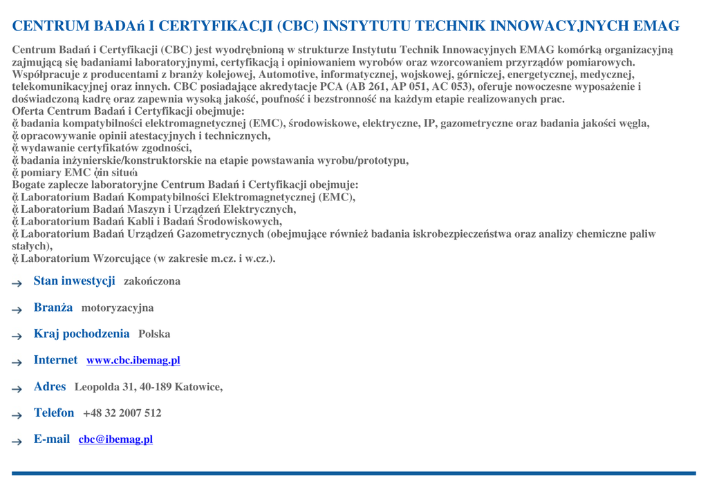 CENTRUM BADAń I CERTYFIKACJI (CBC) INSTYTUTU TECHNIK INNOWACYJNYCH EMAG Centrum Badań i Certyfikacji (CBC) jest wyodrębnioną w strukturze Instytutu Technik Innowacyjnych EMAG komórką organizacyjną zajmującą się badaniami laboratoryjnymi, certyfikacją i opiniowaniem wyrobów oraz wzorcowaniem przyrządów pomiarowych. Współpracuje z producentami z branży kolejowej, Automotive, informatycznej, wojskowej, górniczej, energetycznej, medycznej, telekomunikacyjnej oraz innych. CBC posiadające akredytacje PCA (AB 261, AP 051, AC 053), oferuje nowoczesne wyposażenie i doświadczoną kadrę oraz zapewnia wysoką jakość, poufność i bezstronność na każdym etapie realizowanych prac. Oferta Centrum Badań i Certyfikacji obejmuje: • badania kompatybilności elektromagnetycznej (EMC), środowiskowe, elektryczne, IP, gazometryczne oraz badania jakości węgla, • opracowywanie opinii atestacyjnych i technicznych, • wydawanie certyfikatów zgodności, • badania inżynierskie/konstruktorskie na etapie powstawania wyrobu/prototypu, • pomiary EMC „in situ”. Bogate zaplecze laboratoryjne Centrum Badań i Certyfikacji obejmuje: • Laboratorium Badań Kompatybilności Elektromagnetycznej (EMC), • Laboratorium Badań Maszyn i Urządzeń Elektrycznych, • Laboratorium Badań Kabli i Badań Środowiskowych, • Laboratorium Badań Urządzeń Gazometrycznych (obejmujące również badania iskrobezpieczeństwa oraz analizy chemiczne paliw stałych), • Laboratorium Wzorcujące (w zakresie m.cz. i w.cz.). Stan inwestycji zakończona Branża motoryzacyjna Kraj pochodzenia Polska Internet www.cbc.ibemag.pl Adres Leopolda 31, 40-189 Katowice, Telefon +48 32 2007 512 E-mail [email protected]