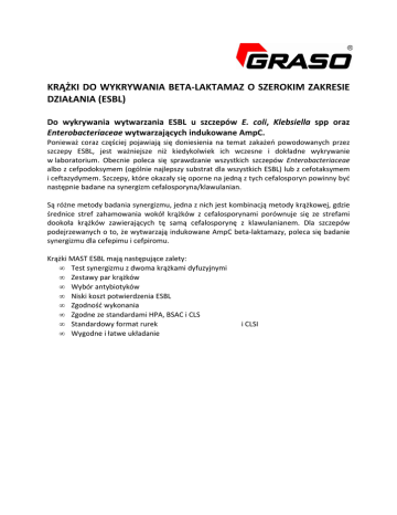 KRĄŻKI DO WYKRYWANIA BETA-LAKTAMAZ O SZEROKIM ZAKRESIE DZIAŁANIA (ESBL) Do wykrywania wytwarzania ESBL u szczepów E. coli, Klebsiella spp oraz Enterobacteriaceae wytwarzających indukowane AmpC. Ponieważ coraz częściej pojawiają się doniesienia na temat zakażeń powodowanych przez szczepy ESBL, jest ważniejsze niż kiedykolwiek ich wczesne i dokładne wykrywanie w laboratorium. Obecnie poleca się sprawdzanie wszystkich szczepów Enterobacteriaceae albo z cefpodoksymem (ogólnie najlepszy substrat dla wszystkich ESBL) lub z cefotaksymem i ceftazydymem. Szczepy, które okazały się oporne na jedną z tych cefalosporyn powinny być następnie badane na synergizm cefalosporyna/klawulanian. Są różne metody badania synergizmu, jedna z nich jest kombinacją metody krążkowej, gdzie średnice stref zahamowania wokół krążków z cefalosporynami porównuje się ze strefami dookoła krążków zawierających tę samą cefalosporynę z klawulanianem. Dla szczepów podejrzewanych o to, że wytwarzają indukowane AmpC beta-laktamazy, poleca się badanie synergizmu dla cefepimu i cefpiromu. Krążki MAST ESBL mają następujące zalety: • Test synergizmu z dwoma krążkami dyfuzyjnymi • Zestawy par krążków • Wybór antybiotyków • Niski koszt potwierdzenia ESBL • Zgodność wykonania • Zgodne ze standardami HPA, BSAC i CLS • Standardowy format rurek • Wygodne i łatwe układanie i CLSI SKŁAD I ZAWARTOŚĆ Nr Kat. Opis D62C 3 x Cefotaksym 30 3 x Cefotaksym 30/Kwas klawulanowy 10 D63C 3 x Cefepim 30 3 x Cefepim 30/kwas klawulanowy 10 D64C 3 x Ceftazydym 30 3 x Ceftazydym/Kwas klawulanowy 10 D65C 3 x Cefpirom 30 3 x Cefpirom 30/Kwas klawulanowy 7,5 D66C 3 x Cefpodoksym 10 3 x Cefpodoksym 10/Kwas klawulanowy 1 D52C 1 x Ceftazydym 30 1 x Ceftazydym 30/Kwas klawulanowy 10 1 x Cefotaksym 30 1 x Cefotaksym 30/Kwas klawulanowy 10 1 x Cefpodoksym 30 1 x Cefpodoksym 30/kwas klawulanowy PRZECHOWYWANIE I TERMIN WAŻNOŚCI Przechowywać w 2 - 8°C w dostarczonych pojemnikach do daty ważności podanej na etykiecie na opakowaniu. Pozwolić na osiągnięcie temperatury pokojowej przed otwarciem. WYKONANIE TESTU 1. Wykonać zawiesinę z czystej, świeżej hodowli badanego drobnoustroju o gęstości 0,5 standardu Mc Farlanda. 2. Nanieść zawiesinę jałowym wymazem na powierzchnię płytki agarowej (np. Mueller Hinton Agar nr. kat. 1170). Alternatywnie można także posiać rozcieńczenie 1:100 zawiesiny o gęstości 0,5 Mc Farlanda na Isotonic Sesitivity Test Agar MAST (DM604), zgodnie z BSAC. 3. Umieścić jałową igłą lub pęsetą po jednym krążku każdego typu (krążek z kombinacją z kwasem klawulanowym oraz krążek z odpowiadającym mu samym antybiotykiem) na posianym podłożu, zapewniając wystarczającą przestrzeń między krążkami, aby pozwolić na utworzenie się wyraźnie odgraniczonych stref zahamowania wzrostu. Na jednej płytce Petriego o średnicy 9 cm można umieścić 3 pary krążków do oznaczania ESBL. Dla wygody można użyć dyspenser MAST (MDD6). 4. Inkubować w 35 - 37°C przez 18 – 24 godz. 5. Zmierzyć i zapisać średnice wszystkich obserwowanych stref zahamowania wzrostu. INTERPRETACJA WYNIKÓW Porównać strefę zahamowania wzrostu dla krążka z samym antybiotykiem do strefy dla kombinacji antybiotyku z kwasem klawulanowym zgodnie z regułami podanymi w odpowiedniej Instrukcji użycia. KONTROLA JAKOŚCI W poniższej tabeli umieszczono wszystkie szczepy do rutynowego użycia. Do pojedynczych oznaczeń należy wybierać je zgodnie z Instrukcjami użycia. Organizm badany Escherichia coli NCTC 13351 Escherichia coli NCTC 13352 Escherichia coli NCTC 13353 Klebsiella pneumoniae ATCC 700603 Escherichia coli ATCC 25922 KONTROLA JAKOŚCI WYKONANA PRZEZ UŻYTKOWNIKA Kontrolę jakości należy wykonać dla co najmniej jednego drobnoustroju, aby wykazać dodatnią reakcję, oraz co najmniej dla jednego drobnoustroju o reakcji ujemnej. Strefy zahamowania wzrostu otrzymane dla kombinacji antybiotyku z kwasem klawulanowym oraz dla krążka z odpowiednią samą cefalosporyną sprawdzane na szczepie kontrolnym ESBL ujemnej E. coli (np. ATCC 25922) powinny być równe lub nie wykazywać większej różnicy średnicy, niż 2 mm. Każda większa różnica wskazuje na złe funkcjonowanie lub utratę aktywności krążka. Nie używać produktu, jeżeli reakcje dla szczepów kontrolnych są nieprawidłowe. OGRANICZENIA TESTU Żeby optymizować wykrywanie ESBL zaleca się używanie tych krążków w kombinacji z innymi krążkami do wykrywania ESBL firmy MAST. Aby uniknąć potencjalnie błędnych wyników, używać krążki z kombinacją antybiotyku z kwasem klawulanowym razem z krążkami z samym odpowiadającym mu antybiotykiem z tej samej serii/opakowania. Nie używać rurek z różnych serii lub opakowań. LITERATURA Literatura dostępna na życzenie.
