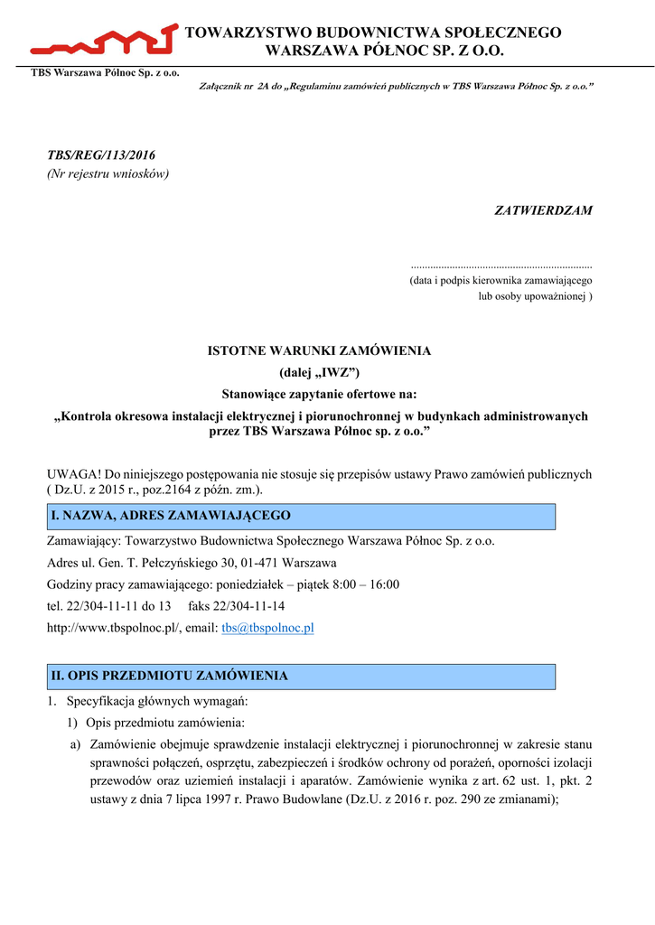 TOWARZYSTWO BUDOWNICTWA SPOŁECZNEGO WARSZAWA PÓŁNOC SP. Z O.O. Załącznik nr 2A do „Regulaminu zamówień publicznych w TBS Warszawa Północ Sp. z o.o.” TBS/REG/113/2016 (Nr rejestru wniosków) ZATWIERDZAM .................................................................. (data i podpis kierownika zamawiającego lub osoby upoważnionej ) ISTOTNE WARUNKI ZAMÓWIENIA (dalej „IWZ”) Stanowiące zapytanie ofertowe na: „Kontrola okresowa instalacji elektrycznej i piorunochronnej w budynkach administrowanych przez TBS Warszawa Północ sp. z o.o.” UWAGA! Do niniejszego postępowania nie stosuje się przepisów ustawy Prawo zamówień publicznych ( Dz.U. z 2015 r., poz.2164 z późn. zm.). I. NAZWA, ADRES ZAMAWIAJĄCEGO Zamawiający: Towarzystwo Budownictwa Społecznego Warszawa Północ Sp. z o.o. Adres ul. Gen. T. Pełczyńskiego 30, 01-471 Warszawa Godziny pracy zamawiającego: poniedziałek – piątek 8:00 – 16:00 tel. 22/304-11-11 do 13 faks 22/304-11-14 http://www.tbspolnoc.pl/, email: [email protected] II. OPIS PRZEDMIOTU ZAMÓWIENIA 1. Specyfikacja głównych wymagań: 1) Opis przedmiotu zamówienia: a) Zamówienie obejmuje sprawdzenie instalacji elektrycznej i piorunochronnej w zakresie stanu sprawności połączeń, osprzętu, zabezpieczeń i środków ochrony od porażeń, oporności izolacji przewodów oraz uziemień instalacji i aparatów. Zamówienie wynika z art. 62 ust. 1, pkt. 2 ustawy z dnia 7 lipca 1997 r. Prawo Budowlane (Dz.U. z 2016 r. poz. 290 ze zmianami); TOWARZYSTWO BUDOWNICTWA SPOŁECZNEGO WARSZAWA PÓŁNOC SP. Z O.O. Załącznik nr 2A do „Regulaminu zamówień publicznych w TBS Warszawa Północ Sp. z o.o.” b) Zestawienie budynków wraz z ilością lokali - zakres przeglądu elektrycznego: adres ul. Rudnickiego 8 ul. Pełczyńskiego 28E ul. Pełczyńskiego 28D ul. Pełczyńskiego 28B ul. Pełczyńskiego 28C RAZEM ilość lokali ilość lokali mieszkalnych użytkowych 42 75 42 44 27 230 Garaże wielostanowiskowe/ samodzielne pomieszczenie socjalne/techniczne 1 1 1 3 9 7 2 7 3 28 1 11 13 6 31 c) Zakres przeglądu instalacji elektrycznej i piorunochronnej obejmuje w szczególności: Oględziny instalacji elektrycznej, urządzeń elektrycznych oraz osprzętu na zewnątrz budynku oraz we wszystkich pomieszczeniach wewnątrz budynku Sprawdzenie wizualne instalacji elektrycznych w zakresie stanu prawidłowości połączeń, izolacji i ułożenia przewodów Sprawdzenie wizualne instalacji elektrycznych w zakresie stanu prawidłowości osprzętu, zabezpieczeń i środków ochrony od porażeń Sprawdzenie kompletności tablic i oznaczeń Sprawdzenie wizualne instalacji odgromowej w zakresie stanu prawidłowości połączeń, mocowań i ułożenia przewodów Pomiary elektryczne w zakresie: - pomiary skuteczności ochrony przeciwporażeniowej - pomiary rezystancji izolacji obwodów I – fazowych - pomiary rezystancji izolacji obwodów III – fazowych - pomiary rezystancji uziomów instalacji odgromowej - pomiary wyłączników różnicowoprądowych d) Kontrolę mogą przeprowadzić osoby posiadające uprawnienia budowlane w odpowiedniej specjalności lub osoby posiadające kwalifikacje wymagane przy wykonywaniu dozoru nad eksploatacją urządzeń, instalacji oraz sieci energetycznych. e) Z przeprowadzonego sprawdzenia instalacji elektrycznych Wykonawca każdorazowo musi sporządzić pisemny protokół. Protokół przeglądu instalacji elektrycznej winien zawierać w szczególności: nr protokołu datę wykonania przeglądu adres obiektu objętego przeglądem dane techniczne urządzeń użytych do dokonania pomiarów wraz z informacją w zakresie spełnienia przez nie wymaganych przepisów prawa i norm tabelaryczne zestawienie pomiarów z podziałem na poszczególne lokale, a w ramach lokali na poszczególne pomieszczenia (zestawienie punktów pomiarowych), wraz z informacją z oględzin instalacji elektrycznej w lokalu wynik pomiarów dla poszczególnych punktów w lokalu (pozytywny/negatywny) TOWARZYSTWO BUDOWNICTWA SPOŁECZNEGO WARSZAWA PÓŁNOC SP. Z O.O. Załącznik nr 2A do „Regulaminu zamówień publicznych w TBS Warszawa Północ Sp. z o.o.” tabelaryczne zestawienie pomiarów dla części wspólnych budynków (klatki schodowe, korytarze, piwnice, wózkownie, pom. techniczne, garaże, itp.) wraz z informacją z oględzin instalacji elektrycznej tabelaryczne zestawienie pomiarów rezystancji izolacji w obwodach wraz z wynikiem (pozytywny/negatywny) tabelaryczne zestawienie pomiarów rezystancji uziomów instalacji odgromowej z wynikiem (pozytywny/negatywny) tabelaryczne zestawienie pomiarów wyłączników różnicowoprądowych wraz z wynikiem (pozytywny/negatywny) zestawienie usterek i nieprawidłowości określenie zaleceń pokontrolnych f) Protokół musi posiadać podpis uprawnionej osoby przeprowadzającej kontrolę. Do protokołu należy załączyć potwierdzenie jego wykonania w poszczególnych lokalach poprzez podpis lokatora. Wykonawca dostarcza Zamawiającemu każdorazowo oryginał protokołu. g) Cena ma uwzględniać dwukrotne podejście do budynku w godzinach późnowieczornych tj. 16.00 -21.00 lub w soboty godz. 10.00 – 18.00. W przypadku dwukrotnego, potwierdzonego przez lokatora budynku, nie uzyskania dostępu do lokalu, zakres zamówienia uznaje się za wykonany. h) Przed złożeniem oferty możliwe jest dokonanie wizji lokalnej przez Wykonawcę w obiektach (na dachach, w częściach wspólnych i pomieszczeniach technicznych), gdzie będzie prowadzony przegląd. 2. Projekt umowy stanowi załącznik nr 2 do niniejszej IWZ. 3. Termin wykonania zamówienia – nie później niż do 16.01.2017 r. 4. Po wyborze oferty Wykonawca jest zobowiązany do opracowania harmonogramu przeglądów w porozumieniu z Zamawiającym. 5. Wykonawca jest związany ofertą 20 dni. 6. Bieg terminu związania ofertą rozpoczyna się wraz z upływem terminu składania ofert. III. WYMAGANIA DOTYCZĄCE WADIUM Zamawiający wymaga / nie wymaga *) wniesienia wa