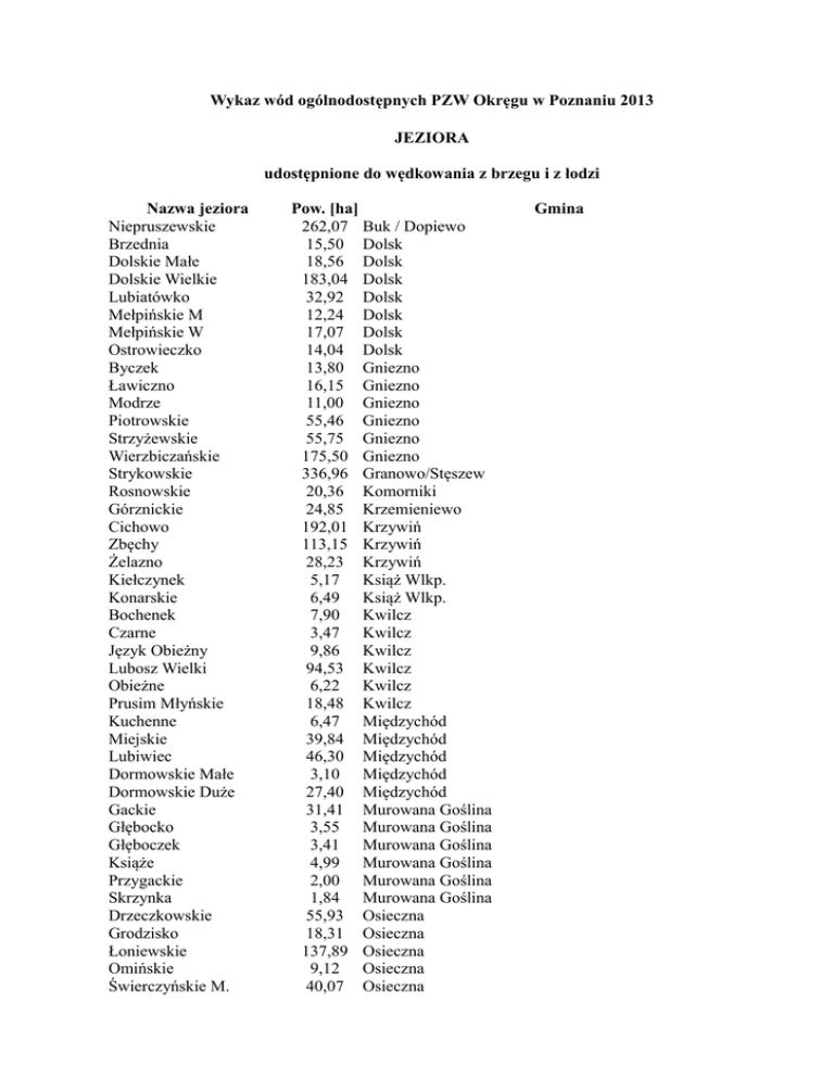 Wykaz wód ogólnodostępnych PZW Okręgu w Poznaniu 2013 JEZIORA udostępnione do wędkowania z brzegu i z łodzi Nazwa jeziora Niepruszewskie Brzednia Dolskie Małe Dolskie Wielkie Lubiatówko Mełpińskie M Mełpińskie W Ostrowieczko Byczek Ławiczno Modrze Piotrowskie Strzyżewskie Wierzbiczańskie Strykowskie Rosnowskie Górznickie Cichowo Zbęchy Żelazno Kiełczynek Konarskie Bochenek Czarne Język Obieżny Lubosz Wielki Obieżne Prusim Młyńskie Kuchenne Miejskie Lubiwiec Dormowskie Małe Dormowskie Duże Gackie Głębocko Głęboczek Książe Przygackie Skrzynka Drzeczkowskie Grodzisko Łoniewskie Omińskie Świerczyńskie M. Pow. [ha] 262,07 Buk / Dopiewo 15,50 Dolsk 18,56 Dolsk 183,04 Dolsk 32,92 Dolsk 12,24 Dolsk 17,07 Dolsk 14,04 Dolsk 13,80 Gniezno 16,15 Gniezno 11,00 Gniezno 55,46 Gniezno 55,75 Gniezno 175,50 Gniezno 336,96 Granowo/Stęszew 20,36 Komorniki 24,85 Krzemieniewo 192,01 Krzywiń 113,15 Krzywiń 28,23 Krzywiń 5,17 Książ Wlkp. 6,49 Książ Wlkp. 7,90 Kwilcz 3,47 Kwilcz 9,86 Kwilcz 94,53 Kwilcz 6,22 Kwilcz 18,48 Kwilcz 6,47 Międzychód 39,84 Międzychód 46,30 Międzychód 3,10 Międzychód 27,40 Międzychód 31,41 Murowana Goślina 3,55 Murowana Goślina 3,41 Murowana Goślina 4,99 Murowana Goślina 2,00 Murowana Goślina 1,84 Murowana Goślina 55,93 Osieczna 18,31 Osieczna 137,89 Osieczna 9,12 Osieczna 40,07 Osieczna Gmina Świerczyńskie W. Witosławskie Wojnowickie Strzeszyńskie Boszkowskie Małe Osłonińsko-Górskie Przemęckie Zaborowskie Wieleńskie Kuźnickie Dzwonowskie Sławica-Borowe Bochenek Dębno Błotne Lipno Tomickie Jezierzyckie Wonieskie Białe-Miałkie Breńskie Brzeźno Linciusz Maszynek Dominickie Krzywce Wielkie Zapowiednik Chojeńskie Radziszewskie Pakawskie* Samołęskie Głuchowiec 70,48 58,80 66,83 34,90 17,20 30,84 206,38 240,40 25,26 226,05 77,07 27,09 3,79 4,80 25,07 10,56 67,32 61,38 127,74 83,70 38,10 41,57 32,50 6,15 377,23 13,00 75,10 30,55 43,50 45,10 31,50 30,37 12,50 Osieczna Osieczna Osieczna Poznań Przemęt Przemęt Przemęt Przemęt Przemęt Przemęt / Wijewo Rakoniewice Skoki Skoki Stęszew Stęszew Stęszew Stęszew Śmigiel Śmigiel Wijewo Wijewo Wijewo Wijewo Wijewo Włoszakowice Włoszakowice Włoszakowice Włoszakowice Wronki Wronki Wronki Wronki Wronki JEZIORA udostępnione do wędkowania tylko z brzegu i bez możliwości używania sprzętu pływającego do celów wędkarskich Nazwa jeziora Konarzewskie Głęboczek Pyszczynek Winiary Dębnickie Borzykowo Linie III Dobre Wielkie Kikowskie Złotnickie Pow. [ha] 2,97 Dopiewo 13,70 Gniezno 12,47 Gniezno 13,56 Gniezno 8,17 Kłecko 9,26 Kwilcz 3,97 Lwówek 3,62 Murowana Goślina 49,87 Ostroróg 5,12 Pniewy 2,34 Pobiedziska Gmina Brajec Godziszewskie (Lesionki) Jeziorko (Miejskie) 9,04 7,91 4,65 Rakoniewice Sieraków Szamotuły DROBNE WODY udostępnione do wędkowania tylko z brzegu i bez możliwości używania sprzętu pływającego do celów wędkarskich Nazwa wody Pow. [ha] Staw Zieliniec 3,10 Kołaczkowo Glinianka Pożegowo 2,40 Mosina Glinianka Gołaszyn 4,92 Oborniki Żwirownia Oborniki 12,00 Oborniki Torfianka Klemensowo 4,11 Ostroróg Biskupice L i P 4,49 Pobiedziska Glinianka Cegielsko 5,23 Rakoniewice Gl. Rostarzewo 3,10 Rakoniewice (Rakoniewice) Staw Marceliński 1,00 Poznań Miasto Staw w Parku nad Wartą 0,64 Poznań Miasto Staw ul. Leszczyńska w 10,07 Poznań Miasto tym: Staw nad Strumykiem Staw Murek Staw Śmierduch Staw pod Wierzbą Stawy pod Stodołą Stawy Parkowe Staw ul. Mieleszyńska w 11,41 Poznań Miasto tym: Staw Glinki Edy Stawy Junikowo w tym: 10,70 Poznań Miasto Staw Baczkowski Staw Stara Baba Staw Karpętaj Staw Kachlarski Torfianka w dolinie 1,43 Swarzędz Cybiny Staw Niesłabin 0,89 Śrem Staw ul. Kilińskiego 2,29 Śrem Staw w Parku Miejskim 1,10 Śrem Żwirownia Batorowo 6,91 Tarnowo Podgórne Stawy Augustowo 5,00 Wielichowo Staw ul. Opieszyn 0,42 Września Staw ul. Witkowska 1,22 Września Gmina ZBIORNIKI ZAPOROWE udostępnione do wędkowania tylko z brzegu i bez możliwości używania sprzętu pływającego do celów wędkarskich Nazwa zbiornika Jeżewo Pow. [ha] 76,00 Borek Wielkopolski Radzyny 110,00 Kaźmierz/Szamotuły Rusałka Śrem A Gaj 36,70 33,00 Poznań Miasto Śrem Środa 42,00 Środa Wlkp. Lipówka 28,00 Września Gmina RZEKI WODY GÓRSKIE - wody krainy pstrąga i lipienia udostępnione do wędkowania z brzegu i z łodzi wyłącznie metodą spinningową lub muchową Nazwa obwodu Pow. [ha] Drawa nr 3 49,50 Drawa nr 5 54,20 Drawa nr 7 24,42 Skrócony opis obwodu Od mostu na drodze gminnej Budów - Głęboczek do 200 m powyżej miejsca wpływu rzeki do Jeziora Lubie Od osi podłużnej mostu na drodze gminnej Sienica Karwice do jez. Wlk. Dębno i od jez. Zły Łęg do mostu w m. Prostynia na drodze krajowej Recz - Kalisz Pomorski wraz z kanałem Prostynia od 200m poniżej wypływu z j.Prostynia do ujscia do rz. Drawy Od mostu w m. Prostynia na drodze krajowej Recz Kalisz Pomorski do mostku w rejonie wpływu do j.Grażyna RZEKI WODY NIZINNE udostępnione do wędkowania z brzegu i z łodzi Nazwa obwodu Warta nr 6 Warta nr 7 Warta nr 8 Warta nr 9* Warta nr 10 Warta nr 11* Wełna nr 9 Pow. [ha] opis obwodu / Gmina od rz. Prosna do mostu w Rogalinku wraz z dopływami: 399,00 rz. Moskawa i inne od mostu w Rogalinku do rz. Wełny wraz z dopływami: 298,00 rzekami Cybina, Główna, Trojanka, Kopla, Głuszynka i inne od rz. Wełny do m. Nowy Kraków wraz z dopływami: 170,00 rzekami Samica, Sama i Struga Stobnicka i inne od m. Nowy Kraków do m. Chojno-Młyn do m. Chojno-Młyn do m. Nowy Zatom wraz z 93,00 dopływami od m. Nowy zatom do granicy woj. Wlkp. od młyna w m. Jaracz do rz. Warty wraz z dopływami: rz. 15,00 Flintą i inne Orla nr 1 94,00 Kanał Mosiński Nr 1 52,07 Kanał Mosiński Nr 2 27,43 Kanał Miastko Struga Kaszczorska Kanał Przemęcki Kanał Brenno-Ostrów Kanał Wonieść Kanał Boszkowski 1,23 1,75 0,28 0,53 1,28 1,06 od źródła do ujscia do rz. Barycz w skład obwodu wchodzą kanały: Obry i Kosciański oraz