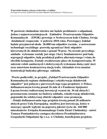 Wojewódzki fundusz ochrony środowiska w Lublinie Powstaje nowoczesny Zakład Przetwarzania Odpadów Komunalnych w Srebrzyszczu W powiecie chełmskim wkrótce nie będzie problemów z odpadami. Jeden z najnowocześniejszych Zakładów Przetwarzania Odpadów Komunalnych (ZPOK) powstaje w Srebrzyszczu koło Chełma. Swoją działalność rozpocznie w połowie 2010 roku. Powstający Zakład będzie przyjmował około 26.000 ton odpadów rocznie, a nowoczesne technologie recyklingu pozwolą ograniczyć ilość odpadów kierowanych do składowania o ponad 70 proc. Na terenie przyszłego zakładu wykonane zostały już stopy i ławy fundamentowe pod halę segregacji odpadów, halę produkcji paliwa alternatywnego i wiatę do obróbki kompostu. Zostały zrealizowane place do kompostowania. W zakresie robót sanitarnych i elektrycznych wykonano dużą część sieci oraz ustawiono kontenerową stację trafo. Aktualnie trwa montaż konstrukcji budynku głównego zakładu. Warto podkreślić, że projekt „Zakład Przetwarzania Odpadów Komunalnych regionu chełmskiego i rekultywacja składowisk odpadów” jest jednym z pierwszych tego typu projektów w Polsce, dofinansowanym kwotą ponad 26 mln zł z Funduszu Spójności. Łączna kwota realizowanej inwestycji wynosi ok. 36 ml złotych i przeznaczona zostanie na budowę zakładu, rekultywację składowisk, pojemniki do selektywnej zbiórki odpadów oraz promocję. - Dzięki dofinansowaniu tego projektu kwotą ponad 26 milionów złotych przez Unię Europejską możliwa jest inwestycja, która w znaczący sposób wpłynie na poprawę jakości życia ok. 160 000 mieszkańców Związku Komunalnego Gmin Ziemi Chełmskiej – mówi Tomasz Pomiankiewicz zastępca dyrektora Przedsiębiorstwa Gospodarki Odpadami Sp z o.o. w Chełmie, beneficjenta projektu. strona 1 / 4 Wojewódzki fundusz ochrony środowiska w Lublinie Powstaje nowoczesny Zakład Przetwarzania Odpadów Komunalnych w Srebrzyszczu W skład związku wchodzą miasta Chełm, Rejowiec Fabryczny oraz gminy: Białopole, Chełm, Dubienka, Hrubieszów, Kamień, Leśniowice, Rejowiec, Rejowiec Fabryczny, Ruda–Huta, Sawin, Siedliszcze, Uchanie, Wierzbica, Wojsławice, Wola Uhruska i Żmudź. Realizowany projekt przewiduje likwidację 12 dotychczasowych składowisk w miejscowościach Srebrzyszcze, Pawłów, Kolonia Strzelce, Dubienka, Strachosław, Leśniowice, Władysławów, Wojsławice, Żmudź, Bytyń, Uchanie oraz Kobyle. Tereny po tych składowiskach zostaną zrekultywowane. O środki na budowę Zakładu oraz likwidacje przestarzałych wysypisk zabiegano już od kilku lat, istniejące składowiska nie spełniały wymogów prawnych, brak było możliwości ich modernizacji oraz nie posiadały technologii odzysku odpadów. W czerwcu 2009 roku została podpisana umowa pomiędzy instytucją wdrażającą POIiŚ Wojewódzkim Funduszem Ochrony Środowiska i Gospodarki Wodnej w Lublinie, a Przedsiębiorstwem Gospodarki Odpadami w Chełmie, która pozwoliła na rozpoczęcie projektu pn. "Zakład Przetwarzania Odpadów Komunalnych regionu chełmskiego i rekultywacja składowisk odpadów”. Ponadto Fundusz udzielił preferencyjnej pożyczki w wysokości 2 000 000 zł na pokrycie udziału własnego Beneficjenta. Powstający Zakład Przetwarzania Odpadów Komunalnych będzie realizował następujące procesy technologiczne: sortowanie odpadów komunalnych, zmieszanych i ich rozdział na 2 frakcje, sortowanie bezpośrednie odpadów pochodzących z selektywnej zbiórki, przygotowanie surowca do produkcji paliwa alternatywnego, kompostowanie odpadów organicznych, przyjmowanie i czasowe magazynowanie oraz wysyłka do utylizacji zużytego sprzętu elektrycznego i elektronicznego, przyjmowanie odpadów wielkogabarytowych i budowlanych, składowanie balastu, składowisko strona 2 / 4 Wojewódzki fundusz ochrony środowiska w Lublinie Powstaje nowoczesny Zakład Przetwarzania Odpadów Komunalnych w Srebrzyszczu odpadów azbestowych (kwatera do składowania została wykonana w 2008 roku). Technologia przetwarzania odpadów komunalnych w budowanym Zakładzie skierowana jest na maksymalny odzysk surowców, które mogą być powtórni wykorzystane. Z wyselekcjonowanych odpadów wyprodukowane zostanie także paliwo alternatywne wykorzystane następnie w procesie produkcyjnym w pobliskiej Cementowni Chełm. Paliwo alternatywne to mieszanka palnych odpadów komunalnych, które zostaną wyizolowane na sicie i rozdrobnione do 40 mm średnicy, dzięki tej metodzie znaczna część strumienia odpadów zostanie poddana odzyskowi energetycznemu. Dodatkowym plusem tej inwestycji jest gwarancja odbioru paliwa przez chełmską cementownię. Współpraca ta pozwoli na znaczącą redukcję masy odpadów deponowanych na składowisku jako balast. strona 3 / 4 Wojewódzki fundusz ochrony środowiska w Lublinie Powstaje nowoczesny Zakład Przetwarzania Odpadów Komunalnych w Srebrzyszczu Inwestycji towarzyszyć będzie edukacja ekologiczna skierowana do mieszkańców Ziemi Chełmskiej. Zakupione zostaną również pojemniki do selektywnej zbiórki odpadów suchych. Wszystkie gminy, których zasięgiem działania obejmuje ZPOK mają zapewnić mieszkańcom odbiór odpadów oraz skontrolować obowiązek zawarcia umowy na wywóz odpadów. - Warto podkreślić, że likwidacja 12 dotychczasowych składowisk pozwoli na ochronę środowiska i przyniesie ewidentne korzyści ekologiczne i ekonomiczne – podkreśla Tomasz Pomiankiewicz. Obecnie na terenie przyszłego zakładu trwają intensywne prace budowlane. Wykonane zostały stopy i ławy fundamentowe pod halę segregacji odpadów, halę produkcji paliwa alternatywnego i wiatę do obróbki kompostu. Zostały zrealizowane place do kompostowania. W zakresie robót sanitarnych i elektrycznych wykonano dużą część sieci oraz ustawiono kontenerową stację trafo. Aktualnie trwa montaż konstrukcji budynku głównego zakładu. strona 4 / 4