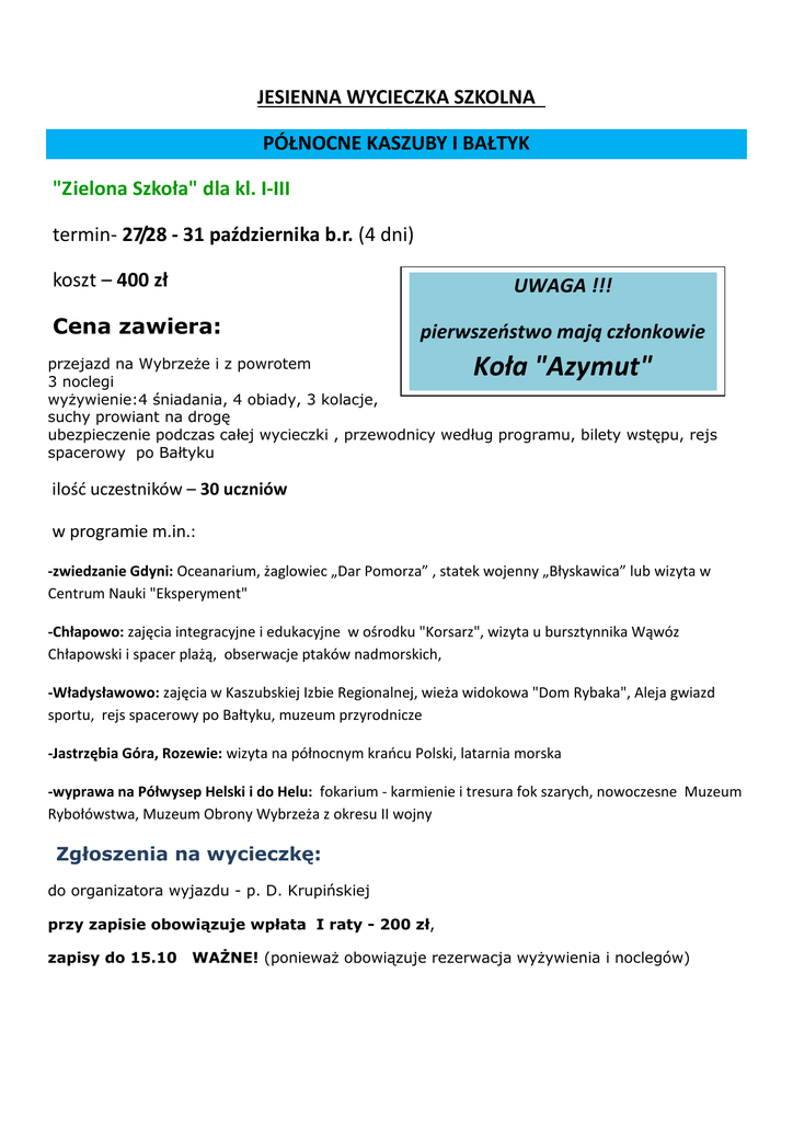 JESIENNA WYCIECZKA SZKOLNA PÓŁNOCNE KASZUBY I BAŁTYK "Zielona Szkoła" dla kl. I-III termin- 27/28 - 31 października b.r. (4 dni) koszt – 400 zł UWAGA !!! Cena zawiera: pierwszeństwo mają członkowie Koła "Azymut" przejazd na Wybrzeże i z powrotem 3 noclegi wyżywienie:4 śniadania, 4 obiady, 3 kolacje, suchy prowiant na drogę ubezpieczenie podczas całej wycieczki , przewodnicy według programu, bilety wstępu, rejs spacerowy po Bałtyku ilość uczestników – 30 uczniów w programie m.in.: -zwiedzanie Gdyni: Oceanarium, żaglowiec „Dar Pomorza” , statek wojenny „Błyskawica” lub wizyta w Centrum Nauki "Eksperyment" -Chłapowo: zajęcia integracyjne i edukacyjne w ośrodku "Korsarz", wizyta u bursztynnika Wąwóz Chłapowski i spacer plażą, obserwacje ptaków nadmorskich, -Władysławowo: zajęcia w Kaszubskiej Izbie Regionalnej, wieża widokowa "Dom Rybaka", Aleja gwiazd sportu, rejs spacerowy po Bałtyku, muzeum przyrodnicze -Jastrzębia Góra, Rozewie: wizyta na północnym krańcu Polski, latarnia morska -wyprawa na Półwysep Helski i do Helu: fokarium - karmienie i tresura fok szarych, nowoczesne Muzeum Rybołówstwa, Muzeum Obrony Wybrzeża z okresu II wojny Zgłoszenia na wycieczkę: do organizatora wyjazdu - p. D. Krupińskiej przy zapisie obowiązuje wpłata I raty - 200 zł, zapisy do 15.10 WAŻNE! (ponieważ obowiązuje rezerwacja wyżywienia i noclegów)