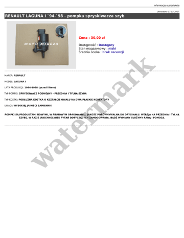 Informacje o produkcie Utworzono 07-03-2017 RENAULT LAGUNA I `94-`98 - pompka spryskiwacza szyb Cena : 30,00 zł er m ar k Dostępność : Dostępny Stan magazynowy : niski Średnia ocena : brak recenzji MARKA: RENAULT MODEL: LAGUNA I LATA PRODUKCJI: 1994-1998 (przed liftem) TYP POMPKI: SPRYSKIWACZ PODWÓJNY - PRZEDNIA I TYLNA SZYBA TYP KOSTKI: PODŁUŻNA KOSTKA O KSZTAŁCIE OWALU NA DWA PŁASKIE KONEKTORY UWAGI: WYSOKIEJ JAKOŚCI ZAMIENNIK w at POMPKI SĄ PRODUKTAMI NOWYMI, W FIRMOWYM OPAKOWANIU, JAKOŚĆ PORÓWNYWALNA DO ORYGINAŁU. WERSJA NA PRZEDNIA I TYLNĄ SZYBĘ. W RAZIE JAKICHKOLWIEK PYTAŃ DOTYCZĄCYCH ZAMOCOWANIA, BĄDŹ WYMIANY SŁUŻYMY RADĄ I POMOCĄ.