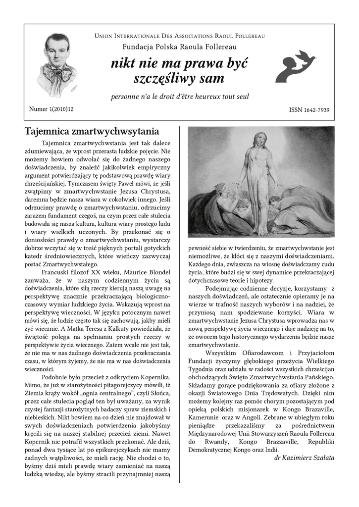 U NION I NTERNATIONALE D ES A SSOCIATIONS R AOUL F OLLEREAU Fundacja Polska Raoula Follereau nikt nie ma prawa być szczęśliwy sam Numer 1(2010)12 personne n'a le droit d'être heureux tout seul ISSN 1642-7939 Tajemnica zmartwychwsytania Tajemnica zmartwychwstania jest tak dalece zdumiewająca, że wprost przerasta ludzkie pojęcie. Nie możemy bowiem odwołać się do żadnego naszego doświadczenia, by znaleźć jakikolwiek empiryczny argument potwierdzający tę podstawową prawdę wiary chrześcijańskiej. Tymczasem święty Paweł mówi, że jeśli zwątpimy w zmartwychwstanie Jezusa Chrystusa, daremna będzie nasza wiara w cokolwiek innego. Jeśli odrzucimy prawdę o zmartwychwstaniu, odrzucimy zarazem fundament czegoś, na czym przez całe stulecia budowała się nasza kultura, kultura wiary prostego ludu i wiary wielkich uczonych. By przekonać się o doniosłości prawdy o zmartwychwstaniu, wystarczy dobrze wczytać się w treść pięknych portali gotyckich katedr średniowiecznych, które wieńczy zazwyczaj postać Zmartwychwstałego. Francuski filozof XX wieku, Maurice Blondel zauważa, że w naszym codziennym życiu są doświadczenia, które siłą rzeczy kierują naszą uwagę na perspektywę znacznie przekraczającą biologicznoczasowy wymiar ludzkiego życia. Wskazują wprost na perspektywę wieczności. W języku potocznym nawet mówi się, że ludzie często tak się zachowują, jakby mieli żyć wiecznie. A Matka Teresa z Kalkuty powiedziała, że świętość polega na spełnianiu prostych rzeczy w perspektywie życia wiecznego. Zatem wcale nie jest tak, że nie ma w nas żadnego doświadczenia przekraczania czasu, w którym żyjemy, że nie ma w nas doświadczenia wieczności. Podobnie było przecież z odkryciem Kopernika. Mimo, że już w starożytności pitagorejczycy mówili, iż Ziemia krąży wokół „ognia centralnego”, czyli Słońca, przez całe stulecia pogląd ten był uważany, za wynik czystej fantazji starożytnych badaczy spraw ziemskich i niebieskich. Nikt bowiem na co dzień nie znajdował w swych doświadczeniach potwierdzenia jakobyśmy kręcili się na naszej stabilnej przecież ziemi. Nawet Kopernik nie potrafił wszystkich przekonać. Ale dziś, ponad dwa tysiące lat po epikurejczykach nie mamy żadnych wątpliwości, że mieli rację. Nie chodzi o to, byśmy dziś mieli prawdę wiary zamieniać na naszą ludzką wiedzę, ale byśmy stracili przynajmniej naszą pewność siebie w twierdzeniu, że zmartwychwstanie jest niemożliwe, że kłóci się z naszymi doświadczeniami. Każdego dnia, zwłaszcza na wiosnę doświadczamy cudu życia, które budzi się w swej dynamice przekraczającej dotychczasowe teorie i hipotezy. Podejmując codzienne decyzje, korzystamy z naszych doświadczeń, ale ostatecznie opieramy je na wierze w trafność naszych wyborów i na nadziei, że przyniosą nam spodziewane korzyści. Wiara w zmartwychwstanie Jezusa Chrystusa wprowadza nas w nową perspektywę życia wiecznego i daje nadzieję na to, że owocem tego historycznego wydarzenia będzie nasze zmartwychwstanie. Wszystkim Ofiarodawcom i Przyjaciołom Fundacji życzymy głębokiego przeżycia Wielkiego Tygodnia oraz udziału w radości wszystkich chrześcijan obchodzących Święto Zmartwychwstania Pańskiego. Składamy gorące podziękowania za ofiary złożone z okazji Światowego Dnia Trędowatych. Dzięki nim możemy kolejny raz pomóc chorym pozostającym pod opieką polskich misjonarek w Kongo Brazaville, Kamerunie oraz w Angoli. Zebrane w ubiegłym roku pieniądze przekazaliśmy za pośrednictwem Międzynarodowej Unii Stowarzyszeń Raoula Follereau do Rwandy, Kongo Brazzaville, Republiki Demokratycznej Kongo oraz Indii. dr Kazimierz Szałata 1(2010)12 2 Pierwszy utwór literacki, który napisał Raoul Follereau w wieku piętnastu lat, po tym, jak w okopach Szampanii, na froncie pierwszej wojny światowej, zginął jego ojciec. Na Kalwarii poemat I Prolog Wówczas, w przypływie dobroci nad miarę Bóg się z Baranka przemienił w ofiarę Przez Człowieka skazanego By ukarać oszczerstwa i dać odkupienie Stwórca się raczył zmienić w stworzenie Ratując potępionego Istota ta, przez lud podły nierozpoznana Wpowłoce człowieka, o władzy Pana Wcieniu jęła się unosić Jednym jego słowem – męstwa umacnianie Jednym gestem jego – burzy ustanie Mową jego „Dosyć!” Gawiedź jest winna, nie cierpi więc Mściciela Zgnieciona wyrzutami nie cierpi Zbawiciela Którymi ją przygniatał I wtedy jak bestia dzika i nieczysta Gawiedź warczała, gwizdała na Chrysta Lud go na śmierć skazał. Wnet niebo się otwiera, a zastęp święty Oderwany od pieśni, ku wrotom ściśnięty Patrzy, cały drżący Na ziemię straszną, szaloną, a pod falą strojną w grzmoty Stoi odkupiciel świata, czekający Golgoty Ku śmierci idący. II Na Kalwarię Pokonany, krwawiący, stłumiony, wspaniały Czoło kolcami pokłute, idzie zgarbiały. Zostawia za sobą krwi strumień gorejący. Otoczony katami Mistrz Wszechmogący On, Stwórca Świata, Władza sama w sobie Ludowi kochanemu Bóg w ludzkiej osobie Idzie powolnym krokiem na miejsce kaźni. Wchodzi, chwieje się, lecz bez bojaźni Idzie, spocony, o kamień się potyka Wchodzi, lecz krzyż za ciężki, on już ziemi dotyka! Ale idzie w ciszy, choć droga daleka Krwawi gorzko, lecz krew tę dla człowieka Wypija. Nikt dookoła pomocy nie głosi Potyka się, upada, wstaje... i podnosi! Łzy zalewają Jana, Magdalenę, Marię Lecz śledzą Chrystusa w drodze na Kalwarię. Twarz zhańbioną ból i kurz pokrywa On idzie, wykończony, a stopa się odrywa Od ziemi z trudem, on walczy jeszcze Wchodzi, krew spływa, powoduje dreszcze Już nie może, ledwie idzie, ale wszystko znosi Dla nas się potyka, pada... i podnosi. Za każdym razem słabszy, szczyt zbyt oddalony O wodę prosi – jest rozgrzany, spragniony Odmówiono mu. Idzie więc pyłem porosły. I Bóg mówi pacierz prosty, lecz wzniosły Do Boga, by ukara