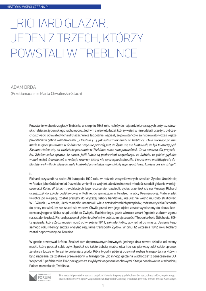 historia-wspolczesna.pl _Richard Glazar, jeden z trzech, którzy powstali w Treblince adam drda (Przetłumaczenie Marta Chwalinska-Stach) Powstanie w obozie zagłady Treblinka w sierpniu 1943 roku należy do najbardziej znaczących antynazistowskich działań żydowskiego ruchu oporu. Jednym z niewielu ludzi, którzy wzięli w nim udział i przeżyli, był czechosłowacki obywatel Richard Glazar. Wiele lat później napisał, że powstańców zainspirowało wcześniejsze powstanie w getcie warszawskim: „Działało [...] jak katalizator buntu w Treblince. Dwa miesiące po nim miało miejsce powstanie w Sobiborze, więc nie prawdą jest, że Żydzi się nie buntowali, że był to owczy pęd. Zastanawiałem się, co właściwie powstanie w Treblince może nam powiedzieć. Co to oznacza dla przyszłości. Zdałem sobie sprawę, że nawet, jeśli ludzie są pozbawieni wszystkiego, co ludzkie, to gdzieś głęboko w nich wciąż drzemie coś w rodzaju rezerwy, której nie wyczerpie żadna siła. I ta rezerwa mobilizuje się dokładnie w chwilach, kiedy to stale kontrolująca władza najmniej się tego spodziewa. I potem coś się dzieje“. I. Richard przyszedł na świat 29 listopada 1920 roku w rodzinie zasymilowanych czeskich Żydów. Urodził się w Pradze jako Goldschmied (nazwisko zmienił po wojnie), ale dzieciństwo i młodość spędził głównie w miejscowości Kolín. W latach trzydziestych jego rodzice się rozwiedli, ojciec przeniósł się na Morawy. Richard uczęszczał do szkoły podstawowej w Kolínie, do gimnazjum w Pradze, na ulicy Kremencovej. Maturę zdał wkrótce po okupacji, został przyjęty do Wyższej szkoły handlowej, ale już nie wolno mu było studiować. W 1940 roku, w czasie, kiedy to naziści ustanowili wiele antyżydowskich przepisów, rodzina wysłała Richarda do pracy na wieś, by nie rzucał się w oczy. Chwilę przed tym jego ojciec został wywieziony do obozu koncentracyjnego w Nisku, skąd uciekł do Związku Radzieckiego, gdzie wkrótce zmarł (zgodnie z aktem zgonu na zapalenie płuc). Richard pracował głównie z końmi w pobliżu miejscowości Třebenice koło Štěchovic. Żółtą gwiazdę, którą Żydzi musieli nosić od września 1941, zakładał tylko, gdy jechał do miasta. Jesienią tego samego roku Niemcy zaczęli wysyłać regularne transporty Żydów. W dniu 12 września 1942 roku Richard został deportowany do Terezina. W getcie przebywał krótko. Znalazł tam deportowanych krewnych, jednego dnia nawet dziadka od strony matki, który podciął sobie żyły. Spotkał się także babcią, matką ojca i po raz pierwszy zdał sobie sprawę, że starzy ludzie w Terezinie umierają z głodu. Kilka tygodni później otrzymał rozkaz transportu, na którym było napisane, że zostanie przewieziony w transporcie „do innego getta na wschodzie“ z oznaczeniem BU. Wyjechał 8 października l942 pociągiem ze zwykłymi wagonami osobowymi. Stacja docelowa we wschodniej Polsce nazwała się Treblinka. Ten materiał powstał w ramach projektu Historie inspirujących bohaterów naszych sąsiadów, wspieranego przez Ministerstwo Spraw Zagranicznych Republiki Czeskiej w ramach projektu Forum Polsko-Czeskiego. 1 historia-wspolczesna.pl II. 10 października 1942 po południu pociąg skręcił z głównej trasy i za miejscowością Małkinia dojechał na odcinku jednotorowym do „dworca“. Przestrzeń była otoczona wysokim ciemnozielonym płotem i Richard G. opowiadał, że na pierwszy rzut oka wyglądało to bardzo ładnie. Wszyscy pasażerowie musieli wysiąść z wagonu na rampę, gdzie czekali na nich umundurowane oddziały SS i mężczyźni w cywilnych ubraniach, bez żydowskich gwiazd. Zaprowadzili nowicjuszy na dziedziniec za płotem i przykazali, że mają się rozbierać, bo idą do kąpieli dezynfekujących. Richarda zauważył jeden z esesmanów i nakazał mu wystąpić z szeregu, bo będzie pracować: „I tak się stało [...] i chociaż ten esesman, który był unterscharführer i nazywał się August Wilhelm Miete, a w Treblince miał przezwisko „Anioł śmierci“, niczego nie podejrzewał, wybrał mnie, po ponad dwudziestu latach świadka swoich zbrodni i masowych mordów około ośmiu tysięcy ludzi [...].” Obóz Treblinka (którym dowodził hauptsturmführer SS Franz Stangl i jego zastępca Kurt Franz) nie pełnił „obowiązku pracy“, w związku z tym po przybyciu pociągów nie było żadnej selekcji przybyłych Żydów. Z transportów tylko czasami „wyciągano“ jednostki, niezbędne do tymczasowego usprawnienia morderstw i grabieży. Pozostali od razu umierali w komorach gazowych. Zmarłych musieli wyciągać członkowie specjalnego żydowskiego komanda i zakopywać, a później palić. Oprócz SS w obozie Treblinka pracowali również ukraińscy strażnicy – wachmani. Richarda i jego późniejszego współtowarzysza ucieczki, Karela Ungera, po przybyciu odprowadzono do działu sortowania tego, co pozostało po zmarłych; stosy ubrań, buty, rzeczy osobiste, a także pieniądze, złoto, biżuterię. Ostateczne rozwiązanie było między innymi ogromnym zorganizowanym rabunkiem. Wkrótce po przybyciu Richard i Karel dowiedzieli się, że ludzie z ich transportu są już lub wkrótce będą martwi. Przyjeżdżało coraz więcej pociągów, a ponieważ nic nie miało komplikować sprawnego funkcjonowania morderstw, Niemcy do ostatniej chwili stwarzali przed przybyłymi pozory normalnego przyjęcia do „zwykłego“ obozu czy getta. Częścią oszustwa był w Treblince tzw. lazaret, budynek z czerwonym krzyżem, kojącym symbolem pomocy i miłosierdzia. W rzeczywistości była to łaźnia śmierci, ale ofiara dowiadywała się tego dopiero wtedy, kiedy stała nad masowym grobem. Richard G. musiał pracować przy sortowaniu skradzionych rzeczy, a także na rampie, po przyjeździe pociągów, wyładowywać bagaż i ciała zmarłych. O tym, co kilku ocalałych Żydów z Treblinki zje, zdecydowały transporty: podczas o