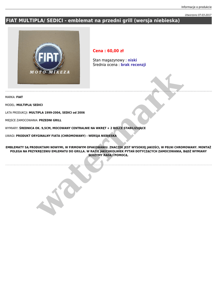 Informacje o produkcie Utworzono 07-03-2017 FIAT MULTIPLA/ SEDICI - emblemat na przedni grill (wersja niebieska) Cena : 60,00 zł MARKA: FIAT MODEL: MULTIPLA/ SEDICI er m ar k Stan magazynowy : niski Średnia ocena : brak recenzji LATA PRODUKCJI: MULTIPLA 1999-2004, SEDICI od 2006 MIEJSCE ZAMOCOWANIA: PRZEDNI GRILL WYMIARY: ŚREDNICA OK. 9,5CM, MOCOWANY CENTRALNIE NA WKRĘT + 2 BOLCE STABILIZUJĄCE UWAGI: PRODUKT ORYGINALNY FIATA (CHROMOWANY) - WERSJA NIEBIESKA w at EMBLEMATY SĄ PRODUKTAMI NOWYMI, W FIRMOWYM OPAKOWANIU. ZNACZEK JEST WYSOKIEJ JAKOŚCI, W PEŁNI CHROMOWANY. MONTAŻ POLEGA NA PRZYKRĘCENIU EMLEMATU DO GRILLA. W RAZIE JAKICHKOLWIEK PYTAŃ DOTYCZĄCYCH ZAMOCOWANIA, BĄDŹ WYMIANY SŁUŻYMY RADĄ I POMOCĄ.