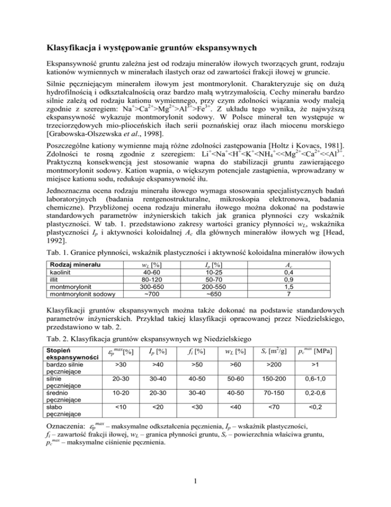 Klasyfikacja i występowanie gruntów ekspansywnych Ekspansywność gruntu zależna jest od rodzaju minerałów iłowych tworzących grunt, rodzaju kationów wymiennych w minerałach ilastych oraz od zawartości frakcji iłowej w gruncie. Silnie pęczniejącym minerałem iłowym jest montmorylonit. Charakteryzuje się on dużą hydrofilnością i odkształcalnością oraz bardzo małą wytrzymałością. Cechy minerału bardzo silnie zależą od rodzaju kationu wymiennego, przy czym zdolności wiązania wody maleją zgodnie z szeregiem: Na+>Ca2+>Mg2+>Al3+>Fe3+. Z układu tego wynika, że najwyższą ekspansywność wykazuje montmorylonit sodowy. W Polsce minerał ten występuje w trzeciorzędowych mio-plioceńskich iłach serii poznańskiej oraz iłach miocenu morskiego [Grabowska-Olszewska et al., 1998]. Poszczególne kationy wymienne mają różne zdolności zastępowania [Holtz i Kovacs, 1981]. Zdolności te rosną zgodnie z szeregiem: Li+<Na+<H+<K+<NH4+<<Mg2+<Ca2+<<Al3+. Praktyczną konsekwencją jest stosowanie wapna do stabilizacji gruntu zawierającego montmorylonit sodowy. Kation wapnia, o większym potencjale zastąpienia, wprowadzany w miejsce kationu sodu, redukuje ekspansywność iłu. Jednoznaczna ocena rodzaju minerału iłowego wymaga stosowania specjalistycznych badań laboratoryjnych (badania rentgenostrukturalne, mikroskopia elektronowa, badania chemiczne). Przybliżonej ocena rodzaju minerału iłowego można dokonać na podstawie standardowych parametrów inżynierskich takich jak granica płynności czy wskaźnik plastyczności. W tab. 1. przedstawiono zakresy wartości granicy płynności wL, wskaźnika plastyczności Ip i aktywności koloidalnej Ac dla głównych minerałów iłowych wg [Head, 1992]. Tab. 1. Granice płynności, wskaźnik plastyczności i aktywność koloidalna minerałów iłowych Rodzaj minerału kaolinit illit montmorylonit montmorylonit sodowy wL [%] Ip [%] Ac 40-60 80-120 300-650 ~700 10-25 50-70 200-550 ~650 0,4 0,9 1,5 7 Klasyfikacji gruntów ekspansywnych można także dokonać na podstawie standardowych parametrów inżynierskich. Przykład takiej klasyfikacji opracowanej przez Niedzielskiego, przedstawiono w tab. 2. Tab. 2. Klasyfikacja gruntów ekspansywnych wg Niedzielskiego Stopień ekspansywności bardzo silnie pęczniejące silnie pęczniejące średnio pęczniejące słabo pęczniejące εpmax[%] Ip [%] fi [%] wL [%] Sr [m2/g] pcmax [MPa] >30 >40 >50 >60 >200 >1 20-30 30-40 40-50 50-60 150-200 0,6-1,0 10-20 20-30 30-40 40-50 70-150 0,2-0,6 <10 <20 <30 <40 <70 <0,2 Oznaczenia: εpmax – maksymalne odkształcenia pęcznienia, Ip – wskaźnik plastyczności, fi – zawartość frakcji iłowej, wL – granica płynności gruntu, Sr – powierzchnia właściwa gruntu, pcmax – maksymalne ciśnienie pęcznienia. 1 Występowanie gruntów ekspansywnych na terenie Polski pokazano na rys. 1. Rys. 1. Występowanie gruntów ekspansywnych w Polsce [Przystański, 1991]. Oznaczenia: 1- zasięg iłów serii poznańskiej, 2 – zasięg iłów miocenu morskiego, 3 – strefy płytkiego zaleganie stropu iłów do 25 m p.p.t., 4 – strefy intensywnych zaburzeń glacitektonicznych. 2