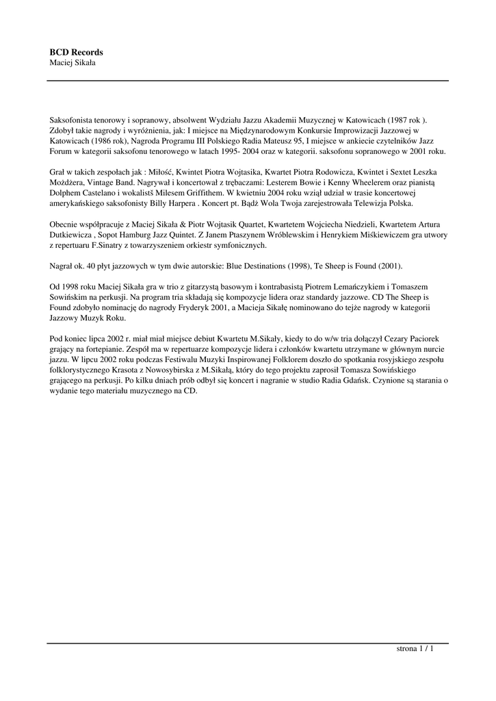 BCD Records Maciej Sikała Saksofonista tenorowy i sopranowy, absolwent Wydziału Jazzu Akademii Muzycznej w Katowicach (1987 rok ). Zdobył takie nagrody i wyróżnienia, jak: I miejsce na Międzynarodowym Konkursie Improwizacji Jazzowej w Katowicach (1986 rok), Nagroda Programu III Polskiego Radia Mateusz 95, I miejsce w ankiecie czytelników Jazz Forum w kategorii saksofonu tenorowego w latach 1995- 2004 oraz w kategorii. saksofonu sopranowego w 2001 roku. Grał w takich zespołach jak : Miłość, Kwintet Piotra Wojtasika, Kwartet Piotra Rodowicza, Kwintet i Sextet Leszka Możdżera, Vintage Band. Nagrywał i koncertował z trębaczami: Lesterem Bowie i Kenny Wheelerem oraz pianistą Dolphem Castelano i wokalistš Milesem Griffithem. W kwietniu 2004 roku wziął udział w trasie koncertowej amerykańskiego saksofonisty Billy Harpera . Koncert pt. Bądż Wola Twoja zarejestrowała Telewizja Polska. Obecnie współpracuje z Maciej Sikała & Piotr Wojtasik Quartet, Kwartetem Wojciecha Niedzieli, Kwartetem Artura Dutkiewicza , Sopot Hamburg Jazz Quintet. Z Janem Ptaszynem Wróblewskim i Henrykiem Miśkiewiczem gra utwory z repertuaru F.Sinatry z towarzyszeniem orkiestr symfonicznych. Nagrał ok. 40 płyt jazzowych w tym dwie autorskie: Blue Destinations (1998), Te Sheep is Found (2001). Od 1998 roku Maciej Sikała gra w trio z gitarzystą basowym i kontrabasistą Piotrem Lemańczykiem i Tomaszem Sowińskim na perkusji. Na program tria składają się kompozycje lidera oraz standardy jazzowe. CD The Sheep is Found zdobyło nominację do nagrody Fryderyk 2001, a Macieja Sikałę nominowano do tejże nagrody w kategorii Jazzowy Muzyk Roku. Pod koniec lipca 2002 r. miał miał miejsce debiut Kwartetu M.Sikały, kiedy to do w/w tria dołączył Cezary Paciorek grający na fortepianie. Zespół ma w repertuarze kompozycje lidera i członków kwartetu utrzymane w głównym nurcie jazzu. W lipcu 2002 roku podczas Festiwalu Muzyki Inspirowanej Folklorem doszło do spotkania rosyjskiego zespołu folklorystycznego Krasota z Nowosybirska z M.Sikałą, który do tego projektu zaprosił Tomasza Sowińskiego grającego na perkusji. Po kilku dniach prób odbył się koncert i nagranie w studio Radia Gdańsk. Czynione są starania o wydanie tego materiału muzycznego na CD. strona 1 / 1