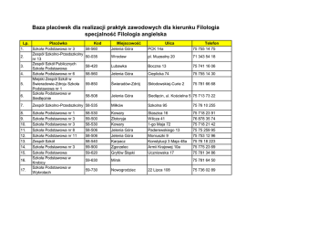 Baza placówek dla realizacji praktyk zawodowych dla kierunku Filologia specjalność Filologia angielska Lp. Placówka 1. Szkoła Podstawowa nr 3 Zespół Szkolno-Przedszkolny 2. nr 13 Zespół Szkół Publicznych 3. Szkoła Podstawowa 4. Szkoła Podstawowa nr 6 Miejski Zespół Szkół w 5. Świeradowie-Zdroju Szkoła Podstawowa nr 1 Szkoła Podstawowa w 6. Siedlęcinie Kod 58-560 Miejscowość Jelenia Góra Ulica PCK 14a Telefon 75 755 14 75 50-035 Wrocław pl. Muzealny 20 71 343 54 18 58-420 Lubawka Boczna 13 75 741 16 06 58-560 Jelenia Góra Cieplicka 74 75 755 14 30 59-850 Świeradów-Zdrój Skłodowskiej-Curie 2 75 781 66 68 58-508 Jelenia Góra Siedlęcin, ul. Kościelna 5 75 713 73 22 7. Zespół Szkolno-Przedszkolny 58-535 Miłków Szkolna 95 75 76 10 255 8. 9. 10. 11. 12. 13. 14. 15. Szkoła Podstawowa nr 1 Szkoła Podstawowa nr 3 Szkoła Podstawowa nr 3 Szkoła Podstawowa nr 8 Szkoła Podstawowa nr 11 Zespół Szkół Szkoła Podstawowa nr 3 Szkoła Podstawowa Szkoła Podstawowa w Krobicy Szkoła Podstawowa w Wykrotach 58-530 59-500 58-530 58-506 58-506 58-540 59-900 59-620 Kowary Złotoryja Kowary Jelenia Góra Jelenia Góra Karpacz Zgorzelec Gryfów Śląski Staszica 16 Wilcza 41 1-go Maja 72 Paderewskiego 13 Moniuszki 9 Konstytucji 3 Maja 48a Armii Krajowej 10a Uczniowska 17 75 718 23 91 76 878 35 74 75 718 21 42 75 75 259 95 75 753 12 96 75 76 18 223 75 775 23 69 75 781 34 86 59-630 Mirsk 59-730 Nowogrodziec 16. 17. 75 781 64 50 22 Lipca 108 75 736 02 89