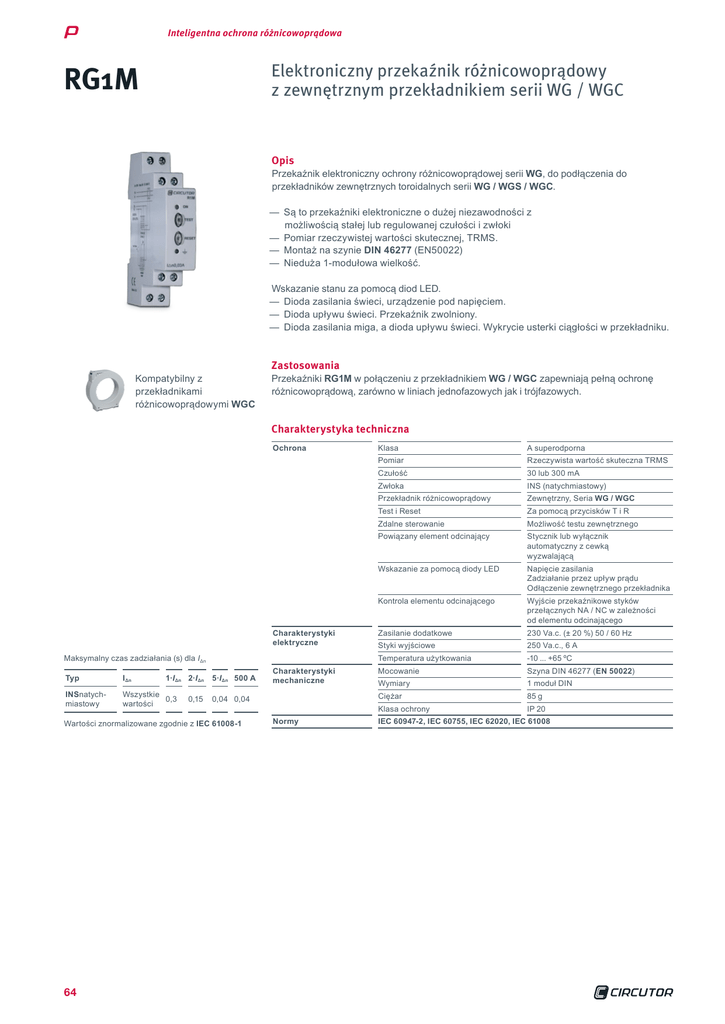 Inteligentna ochrona różnicowoprądowa RG1M Elektroniczny przekaźnik różnicowoprądowy z zewnętrznym przekładnikiem serii WG / WGC Opis Przekaźnik elektroniczny ochrony różnicowoprądowej serii WG, do podłączenia do przekładników zewnętrznych toroidalnych serii WG / WGS / WGC. —— Są to przekaźniki elektroniczne o dużej niezawodności z możliwością stałej lub regulowanej czułości i zwłoki —— Pomiar rzeczywistej wartości skutecznej, TRMS. —— Montaż na szynie DIN 46277 (EN50022) —— Nieduża 1-modułowa wielkość. Wskazanie stanu za pomocą diod LED. —— Dioda zasilania świeci, urządzenie pod napięciem. —— Dioda upływu świeci. Przekaźnik zwolniony. —— Dioda zasilania miga, a dioda upływu świeci. Wykrycie usterki ciągłości w przekładniku. Kompatybilny z przekładnikami różnicowoprądowymi WGC Zastosowania Przekaźniki RG1M w połączeniu z przekładnikiem WG / WGC zapewniają pełną ochronę różnicowoprądową, zarówno w liniach jednofazowych jak i trójfazowych. Charakterystyka techniczna Ochrona Charakterystyki elektryczne Maksymalny czas zadziałania (s) dla I Δn Typ IΔn 1·I Δn 2·I Δn INSnatychmiastowy Wszystkie 0,3 wartości 0,15 5·I Δn 500 A 0,04 0,04 Wartości znormalizowane zgodnie z IEC 61008-1 64 Charakterystyki mechaniczne Normy Klasa A superodporna Pomiar Rzeczywista wartość skuteczna TRMS Czułość 30 lub 300 mA Zwłoka INS (natychmiastowy) Przekładnik różnicowoprądowy Zewnętrzny, Seria WG / WGC Test i Reset Za pomocą przycisków T i R Zdalne sterowanie Możliwość testu zewnętrznego Powiązany element odcinający Stycznik lub wyłącznik automatyczny z cewką wyzwalającą Wskazanie za pomocą diody LED Napięcie zasilania Zadziałanie przez upływ prądu Odłączenie zewnętrznego przekładnika Kontrola elementu odcinającego Wyjście przekaźnikowe styków przełącznych NA / NC w zależności od elementu odcinającego Zasilanie dodatkowe 230 Va.c. (± 20 %) 50 / 60 Hz Styki wyjściowe 250 Va.c., 6 A Temperatura użytkowania -10 ... +65 ºC Mocowanie Szyna DIN 46277 (EN 50022) Wymiary 1 moduł DIN Ciężar 85 g Klasa ochrony IP 20 IEC 60947-2, IEC 60755, IEC 62020, IEC 61008 Inteligentna ochrona różnicowoprądowa RG1M Elektroniczny przekaźnik różnicowoprądowy z zewnętrznym przekładnikiem serii WG / WGC Rodzaje Typ Kod I n (A) Zwłoka RG1M-0,03 P12204 0,03 INS (natychmiastowy) RG1M-0,3 P12214 0,3 INS (natychmiastowy) 90 mm 45 mm 64 mm Wymiary 66 mm 72 mm 17.5 mm Połączenia 50/60 Hz 230 V±20% 50/60 Hz 230 V±20% L1 L2 L3 N 7 6 6 RG1M Test / Reset RG1M Test / Reset 230V;5A 3 4 1 2 CARGA Disparo por BOBINA DE MÍNIMA - Rearme manual. Type WG 8 1S11S2 7 5 Type WG 8 1S11S2 5 L1 L2 L3 N 230V;5A 3 4 1 2 CARGA Disparo por BOBINA DE EMISIÓN - Rearme manual. 65