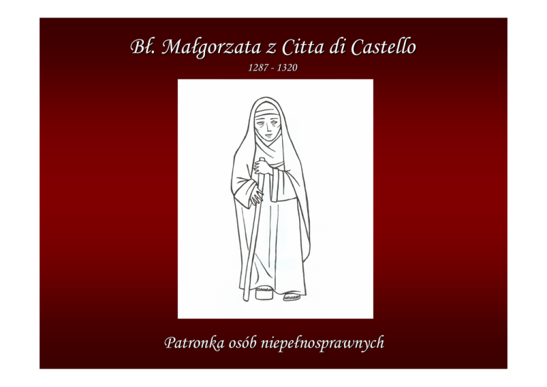 Bł. Małgorzata z Citta di Castello 1287 - 1320 Patronka osób niepełnosprawnych W długim orszaku świętych Kościoła, w białym habicie, kroczy Błogosławiona. Małgorzata z Citta di Castello imię nosi, niepełnosprawnym pociechę przynosi. O życiu Małgorzaty dziś Wam opowiemy, bo zachować w pamięci jej zasługi chcemy. W ziemskim życiu tylko dobro rozdawała, chociaż wiele drwin i krzywd od ludzi zaznała. Ojciec Małgorzaty - Parys, był żołnierzem, miał wielką posiadłość i wspaniałą twierdzę. Mama Małgorzaty - Emilia, z urody słynęła. Ich wędrówka przez życie pięknie się zaczęła. Mieszkali we Włoszech, w uroczej Metoli, w górach apenińskich, wśród lasów zielonych. Miejscowa ludność podziwem ich obdarzała wzorem do naśladowania była ta para. Przyszedł czas, gdy oboje dziecka zapragnęli narodzin dorodnego chłopca oczekiwać zaczęli. Jednak rodzice ogromne zaskoczenie przeżyli, gdy po porodzie, dziewczynkę zobaczyli. Jeszcze większe ogarnęło ich rozczarowanie, gdy okazało się, że dziecko jest niepełnosprawne: niewidome, ma krótszą nogę, dużą główkę i garb. Trudno było im przyjąć ten szczególny od Boga dar... Zaczęli rozmyślać, przechodzić wewnętrzne burze, co o takim dziecku powiedzą inni ludzie? W sercach Emilii i Parysa zagościł ogromny żal: Dlaczego Bóg im niepełnosprawne dziecko dał? Młodzi rodzice długo z czarnymi myślami się bili. Niestety, po namyśle, swoją córeczkę odrzucili. Postanowili, że nie będą o niej mówić o nikomu i w tajemnicy przed wszystkimi, oddalą ją z domu. Ojciec w zamkowej celi dziewczynkę schował, rozkazał służącemu, by się nią zaopiekował. Dobry sługa chore dzieciątko do serca przytulił, serdeczną troską i ciepłem Bożej miłości otulił. Nawet własnego imienia nie miała ta maleńka… Służący nazwał ją - Małgorzata, czyli „perełka”. Pięknymi oczyma na dziewczynkę popatrzył wyjątkowy skarb od Boga w niej zobaczył. Kapelan z Metoli zadbał, by dziecko chrzest otrzymało, by z samego Nieba, od Boga, siłę do życia czerpało. Małgorzata z darów chrztu świętego hojnie korzystała. Bóg uczynił ją Swoim dzieckiem - dobrze to wiedziała. Bez szemrania poddała się Bożemu prowadzeniu, wierząc, że miłość i przebaczenie kierują ku Niebu. Spokojnie, z wdzięcznością każdy dzień przyjmowała, dziecięce smutki i radości przed Bogiem składała. Rodzice Małgorzaty dowiedzieli się od sługi i księdza, że dziewczynka sporo czasu na modlitwie spędza. A ponieważ Parys dziwnie miłość do córki pojmował, małą celę - obok kościoła w lesie - dla niej wybudował. Cela ta była straszna - z zamurowanymi drzwiami, bardzo zimna, wilgotna, z dwoma okienkami. Przez jedno okienko Małgorzata jedzenie dostawała, przez drugie, łączące z kościołem, mszy świętej słuchała. Małgorzata miała wtedy dopiero sześć lat! Jakże bezlitosny, okrutny był dla niej świat. Ale dziewczynka mężnie to odosobnienie znosiła, za wszystkich, których znała, gorąco się modliła. Kapelan często przychodził do niej na rozmowę. Odkrył, że cechuje ją wrażliwe serce i piękno duchowe. Został jej pierwszym nauczycielem i powiernikiem, udzielał sakramentów świętych, był jej spowiednikiem. W małej celi wzrastała w wierze i mądrości, nie chowając do nikogo urazu, ani złości. Mając tylko siedem lat jak mniszka pościła, całym swym sercem Panu Bogu oddana była. Aż trzynaście lat spędziła w tej przykościelnej celi, rodzice o swym dziecku prawie zupełnie zapomnieli… Dopiero, gdy teren Metoli objęło zagrożenie wojenne, Emilia zaczęła o swej córce rozmyślać codziennie. By uchronić ją przed śmiertelnym niebezpieczeństwem, wraz ze służącym przeniosła Małgorzatę w inne miejsce. Następny rok spędziła w Mercatello, w kamiennej piwnicy, od Boga czerpiąc siłę do życia w zimnie i głuchej ciszy. Z pewnością, Małgorzata chwile smutku i słabości też miała, jednak w tych nieludzkich warunkach - nie zgorzkniała. Wręcz przeciwnie - z każdym dniem piękniała duchowo, idąc za swoim Przyjacielem Jezusem, krzyżową drogą. Pewnego dnia, rodzice Małgorzaty dobrą nowinę usłyszeli, że w Castello chorzy ludzie zostają cudownie uzdrowieni! Postanowili udać się wraz z córką do słynnego grobu, by i ona dostąpiła uzdrowienia - polecając się gorąco Bogu. Kiedy przybyli na miejsce, w tłum chorych ją wepchnęli. Z daleka - by ich nie poznano - czekać na cud zaczęli. Małgorzata pokornie przy grobie Fra Giacomo głowę schyliła: „Uzdrów mnie, Boże, jeśli taka jest Twoja wola” - prosiła. Cud nie nastąpił - taka wobec niej była wola Pana. Rodzice Małgorzaty nie kryli swego rozczarowania. Doszli do wniosku, że skoro Bóg jej losu nie odmienił, to również oni - gdy ją opuszczą - będą usprawiedliwieni. Kiedy Małgorzata zatopiona była w żarliwej modlitwie, rodzice uczynili rzecz potworną… uciekli od niej chyłkiem! W Castello, na łaskę obcych ludzi, ją pozostawili, już nigdy więcej swej córki na oczy nie zobaczyli. Małgorzata długo po uliczkach Castello się błąkała z bólem i nadzieją w sercu, ojca i matki szukała. Aż w końcu dotarła do niej prawda straszliwa, że została porzucona… rodziców już nie ma… To kolejne w życiu bolesne doświadczenie, Małgorzata przyjęła z pokorą i uniżeniem. Odtąd sama o jedzenie starać się musiała, by zdobyć nocleg i ubranie - prosiła, żebrała… Mimo wielu krzywd, jakich od rodziców doznała, zawsze o nich z miłością ludziom opowiadała. Mieszkańcy Castello jej szlachetne serce podziwiali: Skąd w niej tyle dobra i przebaczenia? - pytali. Z każdym dniem zaufanie ludzi zdobywała chętnie była przez nich na nocleg zapraszana. Z wdzięczności zajmowała się pracami domowymi, z oddaniem opiekowała się dziećmi i chorymi Po kilku latach takich wędrówek „od domu do domu”, została 