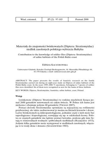 Wiad. entomol. 27 (2): 97-103 Poznań 2008 Materiały do znajomości lwinkowatych (Diptera: Stratiomyidae) siedlisk zasolonych polskiego wybrzeża Bałtyku Contribution to the knowledge of soldier flies (Diptera: Stratiomyidae) of saline habitats of the Polish Baltic coast Elżbieta KACZOROWSKA Uniwersytet Gdański, Katedra Zoologii Bezkręgowców, Al. Marszałka Piłsudskiego 46, 81-378 Gdynia; e-mail: [email protected] ABSTRACT: The paper presents the results of faunistic research on the family Stratiomyidae carried out during an eight-year study on Diptera of saline habitats of the Polish Baltic coast. In the years 1999–2006 71 specimens, belonging to 7 species of soldier flies were identified. Six of them were recognized as new for the fauna of these habitats. KEY WORDS: Diptera, Stratiomyidae, faunistics, saline habitat, coast, Poland. Wstęp Lwinkowate (Diptera: Stratiomyidae) to rodzina muchówek licząca ponad 2600 gatunków notowanych na całym świecie. W Polsce ich fauna jest nieliczna i obejmuje jedynie 60 gatunków (TROJAN 2007). Postaci dorosłe Stratiomyidae spotykane są najczęściej na roślinności przybrzeżnej, ale także zaobserwować je można na liściach krzewów i drzew. Larwy lwinkowatych są mikropantofagiczne, jednakże część z nich może być saprofagiczna i koprofagiczna, rozwijając się np. w odchodach krowy. Połowa ze znanych gatunków ma lądowe postaci larwalne, podczas gdy inne bytują w różnorodnych wodnych i półwodnych siedliskach (ROZKOŠNY 1973). Jedynie kilka gatunków może występować w siedliskach zasolonych, włączając w to wody słone i słonawe (SZADZIEWSKI 1983). 98 E. KACZOROWSKA W siedliskach zasolonych Polski stwierdzono 13 gatunków Stratiomyidae, z których na terenach nadmorskich odnotowano jedynie cztery. Oplodontha viridula (FABRICIUS), Nemotelus uliginosus (LINNAEUS) i Chloromyia formosa (SCOPOLI) uznano za gatunki halokseniczne, podczas gdy Nemotelus notatus ZETTERSTEDT – za halobionta śródlądowego (SZADZIEWSKI 1983). Teren badań, materiały i metody Stratiomyidae pozyskiwane były w trakcie ośmioletnich badań (1999– 2006) nad Diptera siedlisk zasolonych polskiego wybrzeża. Muchówki zbierane były siatką entomologiczną, dwa razy w tygodniu, od początku kwietnia do końca października. 1 . Te r e n b a d a ń Tereny badawcze reprezentowane były przez 24 stanowiska, położone wzdłuż polskiej części wybrzeża Bałtyku, tj. nad Zatoką Pomorską i Gdańską oraz od strony otwartego morza. Należą one do trzech typów siedlisk, tj. do plaż klifowych (10 stanowisk), plaż piaszczystych (11) i słonawisk nadmorskich (3). 1.1. Plaże klifowe Klify w Polsce można podzielić na dwie grupy. Pierwsza z nich obejmuje urwiska gliniaste i podlegające procesom abrazji, do których zalicza się klify położone w Gdyni, Władysławowie i Jastrzębiej Górze. Te leżące blisko Ustki i Międzyzdrojów zbudowane są z piasku wydmowego i ulegają osypywaniu się (SUBOTOWICZ 1984). Rodzaj roślinności notowanej na tych terenach zależy od typu podłoża. I tak, podstawa klifów piaszczystych porośnięta jest roślinnością jednoroczną (np. Senecio vernalis), podczas gdy w wyższych ich partiach obserwuje się krzewy i młode drzewa, wśród których dominuje Betula verrucosa, Lonicera xylosteum i Pinus sp. W najniższych partiach klifów gliniastych obserwuje się z kolei Tussilago farfara, podczas gdy w najwyższych częściach - Hippophaë rhamnoides, Salix caprea i Sorbus aucuparia (PIOTROWSKA 1984). Na klifach muchówki, w tym lwinkowate, pozyskiwane były znad podłoża i roślinności je porastającej. 1.2. Plaże piaszczyste Na polskich plażach strefy epi- i supralitoralu są płaskie i piaszczyste. Jedynie niewielkie części położone blisko klifów są kamieniste. W strefie supralitoralu muchówki poławiane były znad powierzchni wody, kamieni i podłoża, a w epilitoralu – w strefie wydmy białej i szarej. Wydmy te porośnięte są roślinnością zaliczaną do zespołu Elymo-Ammophiletum i Helichryso-Jasionetum (HERBICH, HERBICHOWA, MARKOWSKI 1997). MATERIAŁY DO ZNAJOMOŚCI LWINKOWATYCH SIEDLISK ZASOLONYCH [...] 99 1.3. Słonawiska nadmorskie Stanowisko położone obok Gdańska - Górek Wschodnich obejmuje szuwary, słonawe bagna i łąki. Na terenach tych Diptera poławiane były znad roślinności halofilnej, w skład której wchodziły Aster tripolium, Atriplex hastatum var. salinarium i Elymus arenarius. Na terenie badawczym w Pucku muchówki, w tym lwinkowate, poławiane były na słonawych bagnach i łąkach położonych wzdłuż wybrzeża, które porośnięte są przez Phragmites communis, Atriplex hastatum var. salinarium, Aster tripolium, Glaux maritima i Spergularia salina (SZADZIEWSKI 1983). Ostatnie stanowisko w Mechelinkach jest położone obok Zewnętrznej Zatoki Puckiej. W skład roślinności porastającej ten teren badawczy wchodzi zespół Juncetum gerardi i półhalofilny szuwar tworzący Scirpetum maritimi (HERBICH, MEISSNER, MIKOŚ 1997). Wykaz gatunków Poniżej wymieniono gatunki stwierdzone w czasie badań nad fauną Diptera nadmorskich siedlisk zasolonych, prowadzonych w latach 1999-2006. W sumie do opracowania wykorzystano 71 okazów Stratiomyidae. Wszystkie zostały złowione i oznaczone przez autorkę. BERIDINAE Beris chalybata (FORSTER, 1771) – Gdynia - Wzgórze Św. Maksymiliana (UTM: CF44), plaża klifowa, 18 VI 2001 – 1&; 8 V 2002 – 12%%; 22 V 2002 – 2&&; 31 V 2002 – 2%% 7&&. – Gdańsk - Jelitkowo (CF43), plaża piaszczysta, 1 IX 2001 – 1&. – Gdynia - Orłowo (CF43), plaża klifowa, 11 VI 2004 – 1&; 9 VI 2005 – 1&. W Europie gatunek ten notowany jest od kwietnia do września i uważany jest za licznego dominanta. Postaci larwalne żyją w podłożu (ROZKOŠNY 1998), a imagines spotyka się w cienistych dolinach, na brzegach lasów, wzdłuż strumieni i rzek w niskiej roślinności zielnej (ROZKOŠNY 1973). W Polsce B. chalybata jest znany 