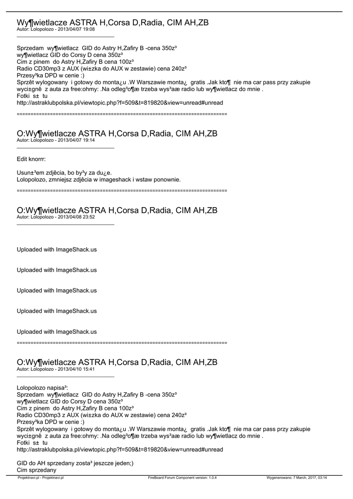 Wy¶wietlacze ASTRA H,Corsa D,Radia, CIM AH,ZB Autor: Lolopolozo - 2013/04/07 19:08 _____________________________________ Sprzedam wy¶wietlacz GID do Astry H,Zafiry B -cena 350z³ wy¶wietlacz GID do Corsy D cena 350z³ Cim z pinem do Astry H,Zafiry B cena 100z³ Radio CD30mp3 z AUX (wi±zka do AUX w zestawie) cena 240z³ Przesy³ka DPD w cenie :) Sprzêt wylogowany i gotowy do monta¿u .W Warszawie monta¿ gratis .Jak kto¶ nie ma car pass przy zakupie wyci±gnê z auta za free:ohmy: .Na odleg³o¶æ trzeba wys³aæ radio lub wy¶wietlacz do mnie . Fotki s± tu http://astraklubpolska.pl/viewtopic.php?f=509&t=819820&view=unread#unread ============================================================================ O:Wy¶wietlacze ASTRA H,Corsa D,Radia, CIM AH,ZB Autor: Lolopolozo - 2013/04/07 19:14 _____________________________________ Edit knorrr: Usun±³em zdjêcia, bo by³y za du¿e. Lolopolozo, zmniejsz zdjêcia w imageshack i wstaw ponownie. ============================================================================ O:Wy¶wietlacze ASTRA H,Corsa D,Radia, CIM AH,ZB Autor: Lolopolozo - 2013/04/08 23:52 _____________________________________ Uploaded with ImageShack.us Uploaded with ImageShack.us Uploaded with ImageShack.us Uploaded with ImageShack.us Uploaded with ImageShack.us ============================================================================ O:Wy¶wietlacze ASTRA H,Corsa D,Radia, CIM AH,ZB Autor: Lolopolozo - 2013/04/10 15:41 _____________________________________ Lolopolozo napisa³: Sprzedam wy¶wietlacz GID do Astry H,Zafiry B -cena 350z³ wy¶wietlacz GID do Corsy D cena 350z³ Cim z pinem do Astry H,Zafiry B cena 100z³ Radio CD30mp3 z AUX (wi±zka do AUX w zestawie) cena 240z³ Przesy³ka DPD w cenie :) Sprzêt wylogowany i gotowy do monta¿u .W Warszawie monta¿ gratis .Jak kto¶ nie ma car pass przy zakupie wyci±gnê z auta za free:ohmy: .Na odleg³o¶æ trzeba wys³aæ radio lub wy¶wietlacz do mnie . Fotki s± tu http://astraklubpolska.pl/viewtopic.php?f=509&t=819820&view=unread#unread GID do AH sprzedany zosta³ jeszcze jeden;) Cim sprzedany Projektnavi.pl - Projektnavi.pl FireBoard Forum Component version: 1.0.4 Wygenerowano: 7 March, 2017, 03:14 Radio CD30mp3 z AUX sprzedane Niebawem kolejne fanty;) Jak masz jaki¶ modu³ z opla nie wylogowany to bez problemu to ogarnê . Jak nie masz Car pass auta te¿ pomogê za cenê trzy razy ni¿sz± ni¿ ASO;) ============================================================================ O:Wy¶wietlacze ASTRA H,Corsa D,Radia, CIM AH,ZB Autor: Lolopolozo - 2013/05/13 14:02 _____________________________________ Dosz³y nowe graty 1.Wy¶wietlacz BID Astra H,Zafira B wylogowany z ramk± -100z³ 2.Radio CD30mp3 do AH lub ZB wylogowane-150z³ 3.manetka tempomatu -150z³ 4.CIM Astra H wylogowany i z poprawionymi zimnymi lutami -150z³ 5.Zegary SPORT do Astry H ,Zafiry B wylogowane z ustawionym przebiegiem na 0 wiêc op-comem mo¿na ustawiæ jaki siê chce + przycisk Sport w zestawie -cena 500z³ Uploaded with ImageShack.us Uploaded with ImageShack.us Uploaded with ImageShack.us Uploaded with ImageShack.us ============================================================================ O:Wy¶wietlacze ASTRA H,Corsa D,Radia, CIM AH,ZB Autor: Lolopolozo - 2013/05/22 20:57 _____________________________________ fotki zegara i sporta .W zegarze bia³e pod¶wietlanie ;) http://img843.imageshack.us/img843/8449/jpg009.jpg Uploaded with ImageShack.us http://img4.imageshack.us/img4/9844/jpg024b.jpg Uploaded with ImageShack.us ============================================================================ Projektnavi.pl - Projektnavi.pl FireBoard Forum Component version: 1.0.4 Wygenerowano: 7 March, 2017, 03:14