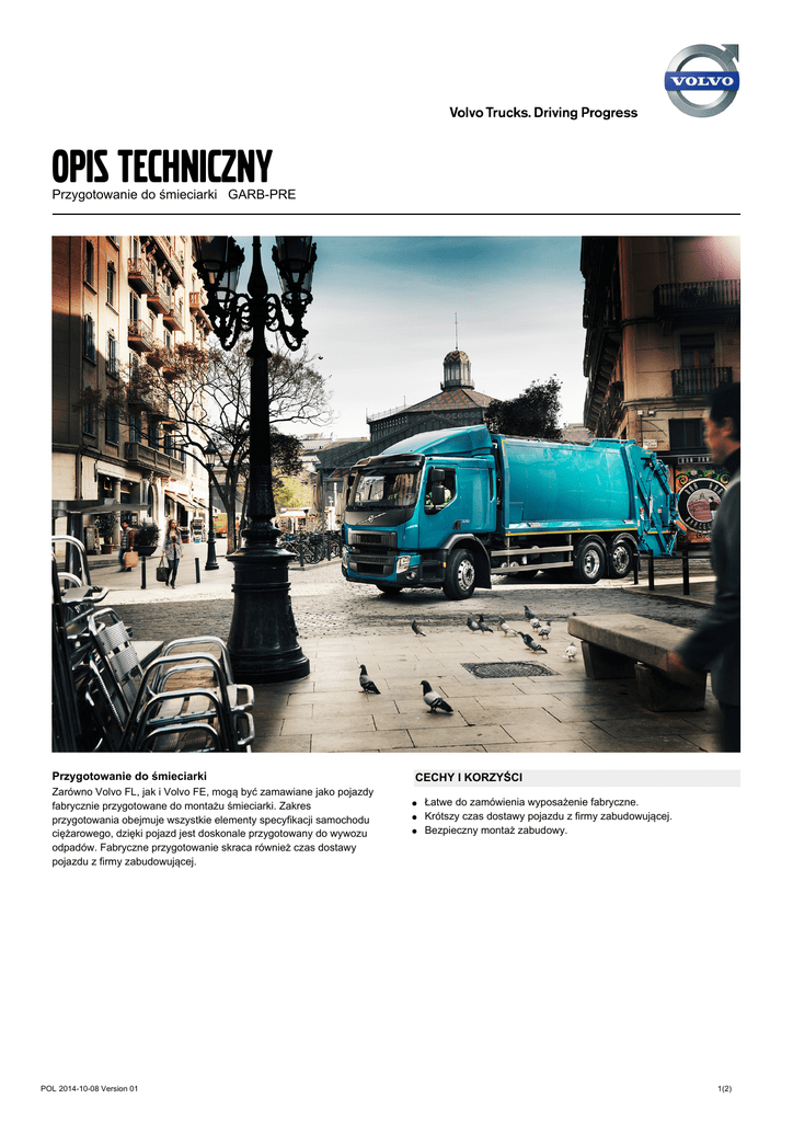 OPIS TECHNICZNY Przygotowanie do śmieciarki GARB-PRE Przygotowanie do śmieciarki Zarówno Volvo FL, jak i Volvo FE, mogą być zamawiane jako pojazdy fabrycznie przygotowane do montażu śmieciarki. Zakres przygotowania obejmuje wszystkie elementy specyfikacji samochodu ciężarowego, dzięki pojazd jest doskonale przygotowany do wywozu odpadów. Fabryczne przygotowanie skraca również czas dostawy pojazdu z firmy zabudowującej. POL 2014-10-08 Version 01 CECHY I KORZYŚCI Łatwe do zamówienia wyposażenie fabryczne. Krótszy czas dostawy pojazdu z firmy zabudowującej. Bezpieczny montaż zabudowy. 1(2) OPIS TECHNICZNY Przygotowanie do śmieciarki GARB-PRE Podwozie pod śmieciarkę FLR816, GARB-PRE Podwozie pod śmieciarkę FE 4x2R/6x2TR (z TA-HYDRS), GARB-PRE DMC 16 t DMC 18/19/26 t Oś przednia FAL5.8 Oś przednia FAL7.1/7.5/8.0 Oś tylna RAL10.9 Oś tylna RAL13/RAL19/RAL21 Rozstaw osi 3250/3500 mm Rozstaw osi LHD STWPOS-L 42R 3500/3700 /3900/4100/4300/4500/4750 Bez ADR UADR 62TR 3500/3700/3900 /4100/4300/4500 Silnik D8K250/D8K280 LHD STWPOS-L Pionowy układ wydechowy EXD-VERR, EXD-REAR, EXD-RIGH, EXD-LEFT RHD STWPOS-R Bez ADR UADR Silnik D8K250/D8K280/D8K320 Pionowy układ wydechowy EXD-VERR, EXD-REAR, EXD-LEFT Skrzynia biegów Manualna, ZTO1109/Automatyczna, AL306. Zautomatyzowana, AT2412E Skrzynia biegów Automatyczna, AL306 Oś tylna RSS1132A Podwójny ogranicznik prędkości SPDU-R Hamulec przyczepy Bez, UTRBRAKE Tylny zwis podwozia RFL1015 Oś tylna RSS1344C/RSH1370F Zawieszenie przednie Wzmocnione, FST-PAR3 SPDU-S/SPDU-R/SPDU-SR Zawieszenie tylne Asymetryczne, RST-PAR4 Koło zapasowe Tymczasowo zamocowanie na czas transportu , SWCP-TP/SWCP-T Podwójny ogranicznik prędkości Wysokość podwozia Medium, CHH-MED Opony 285/70R19.5 Kabina Dzienna, CAB-DAY Ustawienia parametrów Automatyczny hamulec, wraz automatycznym położeniem neutralnym i blokadą biegu wstecznego Hamulec przyczepy Bez, UTRBRAKE Tylny zwis podwozia RFL645 (4x2R pneum.), RFL925 (4x2R mech.), RFL1995 (6x2R) Zawieszenie przednie FST-PAR/FST-AIR Zawieszenie tylne RST-AIR5/RST-PAR4 Koło zapasowe SWCP-LF/SWCP-T/SWCP-TP Opony Wszystkie Rama FRAME300 Wysokość podwozia CHH-MED/CHH-HIGH Kabina Dzienna, CAB-DAY/komfort, CAB-SSLP Ustawienia parametrów Automatyczny hamulec, wraz automatycznym położeniem neutralnym i blokadą biegu wstecznego Volvo Truck Corporation www.volvotrucks.com POL 2014-10-08 Version 01 2(2)