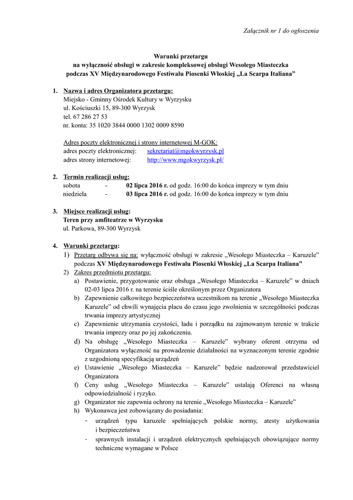 Załącznik nr 1 do ogłoszenia Warunki przetargu na wyłączność obsługi w zakresie kompleksowej obsługi Wesołego Miasteczka podczas XV Międzynarodowego Festiwalu Piosenki Włoskiej „La Scarpa Italiana” 1. Nazwa i adres Organizatora przetargu: Miejsko - Gminny Ośrodek Kultury w Wyrzysku ul. Kościuszki 15, 89-300 Wyrzysk tel. 67 286 27 53 nr. konta: 35 1020 3844 0000 1302 0009 8590 Adres poczty elektronicznej i strony internetowej M-GOK: adres poczty elektronicznej: [email protected] adres strony internetowej: http://www.mgokwyrzysk.pl/ 2. Termin realizacji usług: sobota 02 lipca 2016 r. od godz. 16:00 do końca imprezy w tym dniu niedziela 03 lipca 2016 r. od godz. 16:00 do końca imprezy w tym dniu 3. Miejsce realizacji usług: Teren przy amfiteatrze w Wyrzysku ul. Parkowa, 89-300 Wyrzysk 4. Warunki przetargu: 1) Przetarg odbywa się na: wyłączność obsługi w zakresie „Wesołego Miasteczka – Karuzele” podczas XV Międzynarodowego Festiwalu Piosenki Włoskiej „La Scarpa Italiana” 2) Zakres przedmiotu przetargu: a) Postawienie, przygotowanie oraz obsługa „Wesołego Miasteczka – Karuzele” w dniach 02-03 lipca 2016 r. na terenie ściśle określonym przez Organizatora b) Zapewnienie całkowitego bezpieczeństwa uczestnikom na terenie „Wesołego Miasteczka Karuzele” od chwili wynajęcia placu do czasu jego zwolnienia w szczególności podczas trwania imprezy artystycznej c) Zapewnienie utrzymania czystości, ładu i porządku na zajmowanym terenie w trakcie trwania imprezy oraz po jej zakończeniu. d) Na obsługę „Wesołego Miasteczka – Karuzele” wybrany oferent otrzyma od Organizatora wyłączność na prowadzenie działalności na wyznaczonym terenie zgodnie z uzgodnioną specyfikacją urządzeń e) Ustawienie „Wesołego Miasteczka – Karuzele” będzie nadzorował przedstawiciel Organizatora f) Ceny usług „Wesołego Miasteczka – Karuzele” ustalają Oferenci na własną odpowiedzialność i ryzyko. g) Organizator nie zapewnia ochrony na terenie „Wesołego Miasteczka – Karuzele” h) Wykonawca jest zobowiązany do posiadania: - urządzeń typu karuzele spełniających polskie normy, atesty użytkowania i bezpieczeństwa sprawnych instalacji i urządzeń elektrycznych spełniających obowiązujące normy techniczne wymagane w Polsce - i) j) niezbędnych pozwoleń, dopuszczeń i ubezpieczenia zgodnie z obowiązującymi przepisami prawa w zakresie swojej działalności - minimum 100 mb przewodu elektrycznego spełniającego normy niezbędne dla zasilenia urządzeń „Wesołego Miasteczka – Karuzele” oraz posiadania odpowiedniej rozdzielni prądu Koszt podłączenia do sieci energetycznej leży po stronie oferenta. Wykonawca we własnym zakresie zapewnia sobie dostęp do wody, sprzętu gaśniczego oraz innego niezbędnego sprzętu, środków oraz zabezpieczeń niezbędnych do wystawienia i funkcjonowania Wesołego Miasteczka Karuzele podczas trwania imprezy. 5. Zakres obowiązków Organizatora: - Organizator oświadcza, iż posiada wyłączne prawo do organizacji i przeprowadzenia imprezy oraz prawo do dysponowania terenem przy amfiteatrze w Wyrzysku na czas trwania imprezy. - Organizator zapewni w trakcie trwania imprezy występy artystyczne na scenie oraz inne atrakcje odbywające się na terenie imprezy. (Program Festiwalu – zał. nr 4, zamieszczony również na stronie internetowej). - Organizator zapewni profesjonalną ochronę podczas trwania imprezy; - Organizator nie zapewnia ochrony terenu ze stoiskami (objętego wyłącznością); - Organizator zapewni dostęp do WC typu TOI - TOI - Organizator nie ponosi odpowiedzialności za szkody w mieniu Oferenta oraz osób, którymi Oferent się posługuje przy wykonaniu umowy zawartej z Organizatorem wyrządzonych przez: uczestników imprezy, służby ratownicze, przez siły natury. - Organizator nie ponosi odpowiedzialności za odwołanie imprezy z przyczyn od niego niezależnych (klęski żywiołowe, żałoba narodowa). 6. Oferty a) Oferty pisemne w zaklejonych kopertach z napisem „La Scarpa Italiana - Wesołego Miasteczko” należy złożyć w M-GOK w Wyrzysku do dnia 20.06.2016 r. do godz. 9:00. b) Oferta powinna zawierać: - jedną ofertę, wypełnioną i podpisaną przez upełnomocnionego przedstawiciela zgodnie z treścią załącznika nr 3, zamieszczonego na stronie internetowej M-GOK w formie oryginału – w którym należy podać proponowaną wysokość wpłaty brutto w złotych – za wyłączność obsługi w zakresie kompleksowej obsługi Wesołego Miasteczka podczas XV Międzynarodowego Festiwalu Piosenki Włoskiej „La Scarpa Italiana” oraz podpisać załączone w ofercie oświadczenie o zobowiązaniu się do zapłaty zaoferowanej kwoty w dniu podpisania umowy. c) Otwarcie ofert nastąpi w dniu 21.06.2016 r. o godz. 9:00 w sali nr 1 w Miejsko-Gminnym Ośrodki Kultury w Wyrzysku. d) Wyniki przetargu zostaną podane 21.06.2016 r. e) O wyborze najkorzystniejszej oferty decydować będzie NAJWYŻSZA cena brutto, którą oferent zobowiązuje się wpłacić na rzecz M-GOK za wyłączność obsługi w zakresie wesołego miasteczka podczas XV Międzynarodowego Festiwalu Piosenki Włoskiej „La Scarpa Italiana”. f) W przypadku, gdy w ofercie pisemnej kilku Oferentów zaproponuje tą samą stawkę brutto, Organizator wezwie Oferentów, którzy zaproponowali te kwoty, do złożenia w terminie określonym przez Organizatora ofert dodatkowych. g) Przetarg przeprowadza i rozstrzyga komisja powołana przez Dyrektora M-GOK. h) Wybrany Oferent zobowiązany jest do zawarcia umowy do dnia 23.06.2016 r. i) j) Po upływie powyższego terminu, umowa zostanie zawarta z kolejnym Oferentem, którego oferta była następna w kolejności, także jeżeli do dnia podpisana umowy nie zostanie dokonana wpłata przelewem na konto Organizatora zaoferowana przez wybranego oferenta kwota – umowa zostanie zawarta z kolejnym Oferentem. Miejsko - Gminny Ośrodek Kultury w Wyrzysku zastrze