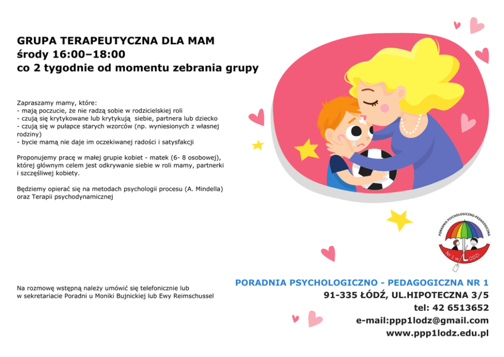 GRUPA TERAPEUTYCZNA DLA MAM środy 16:00–18:00 co 2 tygodnie od momentu zebrania grupy Zapraszamy mamy, które: - mają poczucie, że nie radzą sobie w rodzicielskiej roli - czują się krytykowane lub krytykują siebie, partnera lub dziecko - czują się w pułapce starych wzorców (np. wyniesionych z własnej rodziny) - bycie mamą nie daje im oczekiwanej radości i satysfakcji Proponujemy pracę w małej grupie kobiet - matek (6- 8 osobowej), której głównym celem jest odkrywanie siebie w roli mamy, partnerki i szczęśliwej kobiety. Będziemy opierać się na metodach psychologii procesu (A. Mindella) oraz Terapii psychodynamicznej Na rozmowę wstępną należy umówić się telefonicznie lub w sekretariacie Poradni u Moniki Bujnickiej lub Ewy Reimschussel PORADNIA PSYCHOLOGICZNO - PEDAGOGICZNA NR 1 91-335 ŁÓDŹ, UL.HIPOTECZNA 3/5 tel: 42 6513652 e-mail:[email protected] www.ppp1lodz.edu.pl