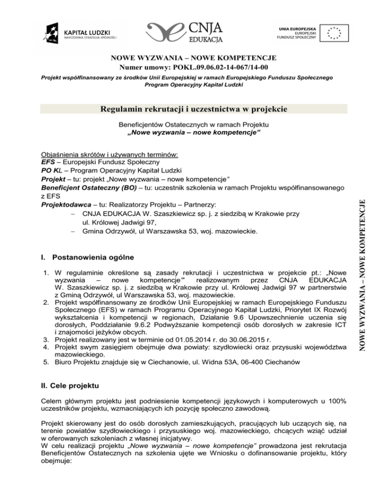 NOWE WYZWANIA – NOWE KOMPETENCJE Numer umowy: POKL.09.06.02-14-067/14-00 Projekt współfinansowany ze środków Unii Europejskiej w ramach Europejskiego Funduszu Społecznego Program Operacyjny Kapitał Ludzki Regulamin rekrutacji i uczestnictwa w projekcie Objaśnienia skrótów i uŜywanych terminów: EFS – Europejski Fundusz Społeczny PO KL – Program Operacyjny Kapitał Ludzki Projekt – tu: projekt „Nowe wyzwania – nowe kompetencje” Beneficjent Ostateczny (BO) – tu: uczestnik szkolenia w ramach Projektu współfinansowanego z EFS Projektodawca – tu: Realizatorzy Projektu – Partnerzy: − CNJA EDUKACJA W. Szaszkiewicz sp. j. z siedzibą w Krakowie przy ul. Królowej Jadwigi 97, − Gmina Odrzywół, ul Warszawska 53, woj. mazowieckie. I. Postanowienia ogólne 1. W regulaminie określone są zasady rekrutacji i uczestnictwa w projekcie pt.: „Nowe wyzwania – nowe kompetencje”” realizowanym przez CNJA EDUKACJA W. Szaszkiewicz sp. j. z siedzibą w Krakowie przy ul. Królowej Jadwigi 97 w partnerstwie z Gminą Odrzywół, ul Warszawska 53, woj. mazowieckie. 2. Projekt współfinansowany ze środków Unii Europejskiej w ramach Europejskiego Funduszu Społecznego (EFS) w ramach Programu Operacyjnego Kapitał Ludzki, Priorytet IX Rozwój wykształcenia i kompetencji w regionach, Działanie 9.6 Upowszechnienie uczenia się dorosłych, Poddziałanie 9.6.2 PodwyŜszanie kompetencji osób dorosłych w zakresie ICT i znajomości jeŜyków obcych. 3. Projekt realizowany jest w terminie od 01.05.2014 r. do 30.06.2015 r. 4. Projekt swym zasięgiem obejmuje dwa powiaty: szydłowiecki oraz przysuski województwa mazowieckiego. 5. Biuro Projektu znajduje się w Ciechanowie, ul. Widna 53A, 06-400 Ciechanów II. Cele projektu Celem głównym projektu jest podniesienie kompetencji językowych i komputerowych u 100% uczestników projektu, wzmacniających ich pozycję społeczno zawodową. Projekt skierowany jest do osób dorosłych zamieszkujących, pracujących lub uczących się, na terenie powiatów szydłowieckiego i przysuskiego woj. mazowieckiego, chcących wziąć udział w oferowanych szkoleniach z własnej inicjatywy. W celu realizacji projektu „Nowe wyzwania – nowe kompetencje” prowadzona jest rekrutacja Beneficjentów Ostatecznych na szkolenia ujęte we Wniosku o dofinansowanie projektu, który obejmuje: NOWE WYZWANIA – NOWE KOMPETENCJE Beneficjentów Ostatecznych w ramach Projektu „Nowe wyzwania – nowe kompetencje” NOWE WYZWANIA – NOWE KOMPETENCJE Numer umowy: POKL.09.06.02-14-067/14-00 Projekt współfinansowany ze środków Unii Europejskiej w ramach Europejskiego Funduszu Społecznego Program Operacyjny Kapitał Ludzki 180 godzinne kursy języka angielskiego – zakończone prestiŜowym egzaminem zewnętrznym TOEIC1 180 godzinne kursy języka niemieckiego – zakończone prestiŜowym egzaminem zewnętrznym TELC2 100 godzinne szkolenia komputerowe – połączone z egzaminem z 4 modułów ECDL3 Szkolenia komputerowe: obejmą 3 dziesięcioosobowe grupy, łącznie 30 Beneficjentów Ostatecznych. Zajęcia realizowane będą w okresie – od października 2014 do czerwca 2015 roku. Udział w projekcie jest bezpłatny i współfinansowany przez Unię Europejską w ramach Europejskiego Funduszu Społecznego W ramach projektu kształceniem ustawicznym objętych będzie 95 uczestników w wieku 25-64 lat (co stanowi 0,51% wskaźnika określonego w SzOP /s.358/) i 19 os. w wieku 18-24 lat, którzy nabędą lub uzupełnią kwalifikacje zgodnie z oczekiwaniami rynku pracy. Projekt obejmie co najmniej 50% osób naleŜących do jednej i/lub więcej z poniŜszych grup: - osoby, które ukończyły 50 rok Ŝycia, - osoby powracające oraz wchodzące po raz pierwszy na rynek pracy po przerwie związanej z urodzeniem i wychowaniem dzieci, - z wykształceniem co najwyŜej średnim, - osoby niepełnosprawne, - osoby pozostające bez zatrudnienia przez okres ostatnich 6 miesięcy, przed przystąpieniem do projektu. 1 Test of English for International Communication (ang.) - certyfikaty znajomości języka angielskiego wydawane przez Educational Testing Service (ETS). 2 The European Language Certificates (ang.) – Europejski Certyfikat Językowy 3 European Computer Driving License (ang.) - Europejski Certyfikat Umiejętności Komputerowych NOWE WYZWANIA – NOWE KOMPETENCJE Szkolenia językowe: realizowane będą w 7 dwunastoosobowych grupach, z czego 6 to grupy języka angielskiego, a 1 – języka niemieckiego. Szkolenia językowe obejmą łącznie 84 Beneficjentów Ostatecznych. Zajęcia realizowane będą w okresie – od czerwca 2014 do czerwca 2015 roku. NOWE WYZWANIA – NOWE KOMPETENCJE Numer umowy: POKL.09.06.02-14-067/14-00 Projekt współfinansowany ze środków Unii Europejskiej w ramach Europejskiego Funduszu Społecznego Program Operacyjny Kapitał Ludzki III. Rekrutacja 1. Terminy rekrutacji Beneficjentów Ostatecznych : a. V 2014 do szkoleń językowych (7 grup – 84 osoby) b. IX - X 2014 do szkoleń komputerowych (3 grupy – 30 osób) 3. Rekrutacja prowadzona będzie poprzez spotkania organizacyjne w terenie (Partner/Koordynator), na których prezentowane będą informacje o celach, działaniach i finansowaniu projektu. W trakcie spotkań zainteresowani wypełnią ankiety rekrutacyjne oraz przejdą wstępne testy kompetencyjne, które słuŜyć będą tworzeniu grup zaawansowania, a ich wyniki porównywane będą z wynikami testów kompetencji wykonanych na zakończenie wsparcia (pomiar „przyrostu” wiedzy). Komisja (w składzie: Przedst. Partnera oraz Koordynator) na podstawie ankiet i wyników testów przydzieli uczestników do grup, tworzonych w najmniejszych nawet miejscowościach, wszędzie tam gdzie zgłaszać się będą chętni. 4. W przypadku ilości zgłoszeń przekraczającej 84 osoby na szkolenia językowe i 30 osób na szkolenia komputerowe, zgodnie z załoŜeniami projektu, będą stosowane następujące kryteria naboru: a. osoby powyŜ