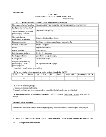 Załącznik nr 4 SYLABUS DOTYCZY CYKLU KSZTAŁCENIA 2015 - 2018 (skrajne daty) 1.1. PODSTAWOWE INFORMACJE O PRZEDMIOCIE/MODULE Nazwa przedmiotu/ modułu TRANSLATORYKA TEKSTÓW LITERACKICH/TRANSLATORYCZNY Kod przedmiotu/ modułu* Wydział (nazwa jednostki prowadzącej kierunek) Wydział Filologiczny Nazwa jednostki realizującej przedmiot Katedra Filologii Rosyjskiej Kierunek studiów Filologia rosyjska, specjalizacja translatoryka Poziom kształcenia Studia I stopnia Profil Ogólnoakademicki Forma studiów stacjonarne Rok i semestr studiów III lic, 5 i 6 semestr Rodzaj przedmiotu przedmiot specjalizacyjny Koordynator dr Dorota Chudyk Imię i nazwisko osoby dr Agnieszka Lis-Czapiga prowadzącej / osób prowadzących * - zgodnie z ustaleniami na wydziale 1.2.Formy zajęć dydaktycznych, wymiar godzin i punktów ECTS Wykł. Ćw. Konw. Lab. Sem. ZP Prakt. Inne ( jakie?) 30 Liczba pkt ECTS 3 1.3. Sposób realizacji zajęć ☐ zajęcia w formie tradycyjnej ☐ zajęcia realizowane z wykorzystaniem metod i technik kształcenia na odległość 1.4. Forma zaliczenia przedmiotu/ modułu ( z toku) ( egzamin, zaliczenie z oceną, zaliczenie bez oceny) 2.WYMAGANIA WSTĘPNE Podstawowa wiedza z zakresu translatoryki ogólnej oraz translatoryki tekstów specjalistycznych. 3. 3.1. CELE, EFEKTY KSZTAŁCENIA , TREŚCI PROGRAMOWE I STOSOWANE METODY DYDAKTYCZNE Cele przedmiotu/modułu C1 Zapoznanie ze specyfiką tekstów literackich. C2 Zapoznanie z rolą tłumacza literatury. C3 Zapoznanie z rodzajami i sposobami tłumaczeń różnych gatunków literackich. C4 Określanie adekwatności przekładu tekstów oryginalnych na drugi język w zakresie leksyki, frazeologii, morfologii, składni, perspektywy funkcjonalnej zdania. C5 Zapoznanie z kulturowym aspektem przekładu literackiego. 3.2 EFEKTY KSZTAŁCENIA DLA PRZEDMIOTU/ MODUŁU EK ( efekt kształcenia) Treść efektu kształcenia zdefiniowanego dla przedmiotu (modułu) EK_01 Wiedza: Student nazywa i charakteryzuje najważniejsze pojęcia z zakresu przekładu; rozróżnia sposoby tłumaczeń tekstów literackich. EK_02 Umiejętności: Student analizuje, porównuje i ocenia przekłady literackie; dobiera sposoby tłumaczeń; tworzy tłumaczenia prostych tekstów literackich, właściwie dobierając słownictwo i konstrukcje gramatyczne z uwzględnieniem rodzajów i gatunków literackich. EK_03 Kompetencja społeczna: Student pracuje w zespole i indywidualnie; dyskutuje; poddaje krytyce przekłady literackie; jest otwarty na sugestie innych. 3.3 Odniesienie do efektów kierunkowych (KEK) K_W01, K_W02, K_W03, K_W12,K_W13, K_W15, K_W16, K_W17, K_W20 K_U01, K_U02, K_U03, K_U04, K_U08, K_U10, K_U11, K_U12, K_U13, K_U14, K_U15, K_U16, K_U17, K_U18, K_U19, K_U20, K_U21, K_U23, K_U24 K_K01, K_K02, K_K04, K_K05, K_K06, K_K08, K_K09 TREŚCI PROGRAMOWE A. Problematyka wykładu Treści merytoryczne B. Problematyka ćwiczeń audytoryjnych, konwersatoryjnych, laboratoryjnych, praktycznych Treści merytoryczne 1. Przekład literacki i jego cechy. Analiza i interpretacja dzieła literackiego a przekład. Granice przekładalności utworów literackich. Leksyka, semantyka, styl, tropy stylistyczne, warstwa syntaktyczna, wersyfikacja, warstwa brzmieniowa utworu, aspekt kulturowy i estetyczny w przekładzie. Kolokacje, idiomy, neologizmy, archaizmy, wulgaryzmy, fałszywi przyjaciele tłumacza, interferencja w przekładzie. Przekład elementów intertekstualnych. Przekład zajęć poezji – specyfika. Przekład literacki w filmie. Reklama w przekładzie literackim. Tłumaczenie komiksu. 2. Porównywanie różnych przekładów tego samego dzieła literackiego. Ocena specyfiki przekładu tekstów literackich według określonego modelu. 3. Praktyka translatoryczna w zakresie literackich tekstów prozatorskich i poetyckich. 3.4 METODY DYDAKTYCZNE Wykład problemowy, wykład z prezentacją multimedialną. Analiza tekstów źródłowych z dyskusją. Praca w grupach. Przygotowywanie referatów. Pisemne tłumaczenie oryginalnych tekstów literackich na drugi język. 4 METODY I KRYTERIA OCENY 4.1 Sposoby weryfikacji efektów kształcenia Symbol efektu EK_ 01 EK_ 02 EK_03 Metody oceny efektów kształcenia ( np.: kolokwium, egzamin ustny, egzamin pisemny, projekt, sprawozdanie, obserwacja w trakcie zajęć) Kolokwium, obserwacja w trakcie zajęć, referat. Pisemne tłumaczenie. Obserwacja podczas zajęć. Forma zajęć dydaktycznych ( w, ćw., …) ĆWICZENIA ĆWICZENIA ĆWICZENIA 4.2 Warunki zaliczenia przedmiotu (kryteria oceniania) Zaliczenie z oceną na podstawie aktywnego uczestnictwa w zajęciach i ocen z przekładów pisemnych, krótkich kolokwiów, referatów. 5. Całkowity nakład pracy studenta potrzebny do osiągnięcia założonych efektów w godzinach oraz punktach ECTS Aktywność Liczba godzin/ nakład pracy studenta godziny zajęć wg planu z nauczycielem 30 przygotowanie do zajęć 30 udział w konsultacjach 10 czas na napisanie referatu/eseju 10 przygotowanie do egzaminu udział w egzaminie Inne (jakie?) tłumaczenie tekstów 40 SUMA GODZIN 130 SUMARYCZNA LICZBA PUNKTÓW ECTS 3 6. PRAKTYKI ZAWODOWE W RAMACH PRZEDMIOTU/ MODUŁU wymiar godzinowy zasady i formy odbywania praktyk 7. LITERATURA Literatura podstawowa: 1. J. Pieńkos, Podstawy przekładoznawstwa. Od teorii do praktyki, Kraków 2003 2. T. Szczerbowski, Rosyjskie teorie przekładu literackiego, Kraków 2011 3. A. Bednarczyk, Kulturowe aspekty przekładu literackiego, Katowice 2002 4. A. Bednarczyk, W poszukiwaniu dominanty translatorskiej, Warszawa 2008 5. M. Krysztofiak, Przekład literacki, Poznań 1996 Literatura uzupełniająca: 1. K. Dedecius, Notatnik tłumacza, Warszawa 1998 2. K. Hejwowski, Kognitywno-komunikacyjna teoria przekładu, Warszawa 2006 3. A. Legeżyńska, Tłumacz i jego kompetencje autorskie, Warszawa 1999 4. K. Lipiński, Mity przekładoznawstwa, Kraków 2004 5. U. Kropiwiec, M. Filipowicz-Rudek, U. Konieczna-Twardzikowa (red.), Między oryginałem a przekładem, Kraków 2004 Akceptacja K
