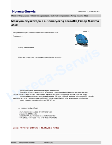 Horeca-Serwis Utworzono : 07 marzec 2017 Maszyny Czyszczące > Maszyna czyszcząca z automatyczną szczotką Fimap Maxima 452B Maszyna czyszcząca z automatyczną szczotką Fimap Maxima 452B Maszyna czyszcząca z automatyczną szczotką Fimap Maxima 452B Model : - Producent : - Fimap Maxima 452B Maszyna czyszcząca z automatyczną podwójną szczotką S a c e r o s i w r e przeznaczona do maszynowego mycia powierzchni szerokość robocza 400/500 mm, wydajność 1200/1500 metrów kwadratowych na godzinę, zużycie roztworu 90 g na metr kwadratowy, prędkość szczotek 515/400/min, nacisk szczotek 30 kg napęd półautomatyczny, podciśnienie ssania 130 mbar, zbiornik roztworu roboczego 40 l, zbiornik na brudną wodę 50 l, silnik sczotek 24/560 V/W, silnik ssawki 24/600 V/W, akumulatory 24/150 V/Ah waga maszyny bez akumulatorów 103/107 kg H do maszyn należy dokupic - akumulatorkwasowy 2szt 2152zł netto 1szt - prostownik 2790zł netto - szczotka PPL 0,6 mm 2szt cena netto 1szt215zł - uchwyt do padów 2szt cena netto 1szt 248zł netto Cena : 19.457,37 zł Brutto ( 15.819,00 zł Netto) kontakt : - [email protected] Strona 1/{nb} Horeca-Serwis Utworzono : 07 marzec 2017 Maszyny Czyszczące > Maszyna czyszcząca z automatyczną szczotką Fimap Maxima 452B Maszyna czyszcząca z automatyczną szczotką Fimap Maxima 452B Dostępność: Produkt dostępny w naszym sklepie od 05 październik 2009 S a c e r o H kontakt : - [email protected] Strona 2/{nb} s i w r e