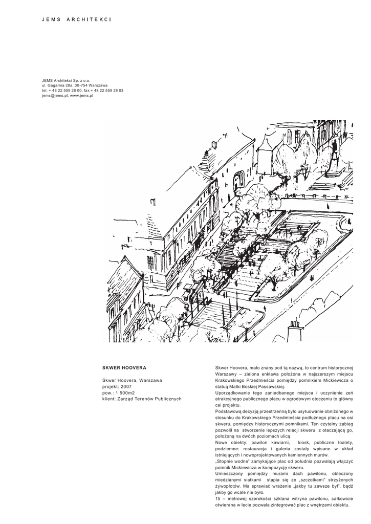 JEMS Architekci Sp. z o.o. ul. Gagarina 28a, 00-754 Warszawa tel. + 48 22 559 28 00, fax + 48 22 559 28 03 [email protected], www.jems.pl Sk wer Hoover a Sk wer Hoovera, Warszawa projekt: 2007 pow.: 1 500m2 klient: Zar ząd Terenów Publicznych Skwer Hoovera, mało znany pod tą nazwą, to centrum historycznej Warszawy – zielona enklawa położona w najszerszym miejscu Krakowskiego Przedmieścia pomiędzy pomnikiem Mickiewicza o statuą Matki Boskiej Passawskiej. Uporządkowanie tego zaniedbanego miejsca i uczynienie zeń atrakcyjnego publicznego placu w ogrodowym otoczeniu to główny cel projektu. Podstawową decyzją przestrzenną było usytuowanie obniżonego w stosunku do Krakowskiego Przedmieścia podłużnego placu na osi skweru, pomiędzy historycznymi pomnikami. Ten czytelny zabieg pozwolił na stworzenie lepszych relacji skweru z otaczającą go, położoną na dwóch poziomach ulicą. Nowe obiekty: pawilon kawiarni, kiosk, publiczne toalety, podziemne: restauracja i galeria zostały wpisane w układ istniejących i nowoprojektowanych kamiennych murów. „Stopnie wodne” zamykające plac od południa pozwalają włączyć pomnik Mickiewicza w kompozycję skweru. Umieszczony pomiędzy murami dach pawilonu, obleczony miedzianymi siatkami stapia się ze „szczotkami” strzyżonych żywopłotów. Ma sprawiać wrażenie „jakby tu zawsze był”, bądź jakby go wcale nie było. 15 – metrowej szerokości szklana witryna pawilonu, całkowicie otwierana w lecie pozwala zintegrować plac z wnętrzami obiektu. JEMS Architekci Sp. z o.o. ul. Gagarina 28a, 00-754 Warszawa tel. + 48 22 559 28 00, fax + 48 22 559 28 03 [email protected], www.jems.pl Hoover Square Hoover Square, Warsaw project: 2007 area.: 1 500m2 client: Public Land Board Herbert Hoover Square (Plac Herberta Hoovers), not widely known under this name, is the historic centre of Warsaw – a green enclave situated at the widest section of Krakowskie Przedmieście, between the Mickiewicz Monument and the statue of the Blessed Virgin Mary of Passau. The main objective of the design was to organize this neglected place and make it an attractive public square in a garden setting. In spatial terms, the key decision was to situate an elongated square, depressed below Krakowskie Przedmieście, between the historical monuments. This clear arrangement made it possible to establish a better relationship between the garden square and the street running at two levels around it. New facilities: a cafe pavilion, a kiosk, public conveniences, an underground restaurant and gallery, are embedded in the layout of the existing and newly designed stone walls. “Water steps” closing off the square to the south allow the Mickiewicz Monument to blend into the composition of the square. The roof of the pavilion, situated between walls, clad with copper mesh, merges with the cut hedge “brushes”. It is intended to appear as if it had always been there or as if it were not there at all. The 15-metre wide glazed wall of the pavilion, opening up fully in summer, will integrate the square with the interiors of the building.