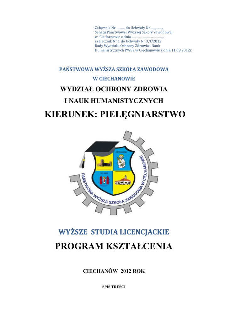Załącznik Nr ……… do Uchwały Nr ……........ Senatu Państwowej Wyższej Szkoły Zawodowej w Ciechanowie z dnia ……………………………. i załącznik Nr 1 do Uchwały Nr 3/I/2012 Rady Wydziału Ochrony Zdrowia i Nauk Humanistycznych PWSZ w Ciechanowie z dnia 11.09.2012r. PAŃSTWOWA WYŻSZA SZKOŁA ZAWODOWA W CIECHANOWIE WYDZIAŁ OCHRONY ZDROWIA I NAUK HUMANISTYCZNYCH KIERUNEK: PIELĘGNIARSTWO WYŻSZE STUDIA LICENCJACKIE PROGRAM KSZTAŁCENIA CIECHANÓW 2012 ROK SPIS TREŚCI Wprowadzenie ……………………………………………….............................................. I. MISJA KIERUNKU PIELĘGNIARSTWO …………………………………………….. II. PODSTAWY PRAWNE ……………………………………………………………….. III. FILOZOFIA PIELĘGNIARSTWA …………………………………………………… IV. SYLWETKA ABSOLWENTA ……………………………………………………….. V. WYMAGANIA OGÓLNE …………………………………………………………….. VI. OGÓLNE EFEKTY KSZTAŁCENIA ………………………………………………... VII. SZCZEGÓŁOWE EFEKTY KSZTAŁCENIA ………………………………………. VIII. ORGANIZACJA STUDIÓW ……………………………………………………….. IX. SPOSOBY OCENY EFEKTÓW KSZTAŁCENIA ………………………………….. X. KRYTERIA POMOCNICZE DO WYSTAWIANIA OCEN PRZY EGZAMINACH I ZALICZENIACH …………………………………………………………………….. XI. KRYTERIA OCENY …………………………………………………………………. XII. PROGRAM KSZTAŁCENIA ………………………………………………………... NAUKI PODSTAWOWE ………………………………………………………… Anatomia……………………………………………………………………..……. 1. Fizjologia…………………………………………………………………………... 2. Patologia…………………………………………………………………...………. 3. Genetyka …………………………………………………………………………... 4. Biochemia i biofizyka ………………………………………………...………….... 5. Mikrobiologia i parazytologia……………………………………………………... 6. Farmakologia……………………………………………………………...……….. 7. Radiologia………………………………………………………………………….. 8. NAUKI SPOLECZNE …………………………………………………………….. Psychologia…………………………………………………………………..…….. 9. Socjologia……………………………………………………………………..…… 10. Pedagogika…………………………………………………………………………. 11. Prawo………………………………………………………………………...…….. 12. Zdrowie publiczne………………………………………………………………..... 13. Filozofia i etyka zawodu pielęgniarki………………………………..……………. 14. Język angielski…………………………………………………………………...... 15. NAUKI W ZAKRESIE PODSTAW OPIEKI PIELĘGNIARSKIEJ ……………. Podstawy pielęgniarstwa……………………………………………………..……. 16. Promocja zdrowia…………………………………………………………...…….. 17 Podstawowa opieka zdrowotna …………………………………………………… 18 Dietetyka……………………………………………………………………...…… 19. Badanie fizykalne……………………………………………………………..…… 20 Badania naukowe w pielęgniarstwie………………………….…….…………….. 21. Zajęcia fakultatywne: Zakażenia szpitalne……………………………..………..... 22. Zajęcia fakultatywne: Język migowy………………………………….………….. 23. Zajęcia fakultatywne: Promocja zdrowia psychicznego………………………...... 24. NAUKI W ZAKRESIE OPIEKI SPECJALISTYCZNEJ………………………… Choroby wewnętrzne i pielęgniarstwo internistyczne…………………….……...... 25. Pediatria i pielęgniarstwo pediatryczne…………………………………….……… 26. Chirurgia i pielęgniarstwo chirurgiczne……………………………………….…... 27. Położnictwo, ginekologia i pielęgniarstwo położniczo – ginekologiczne……..…... 28. Psychiatria i pielęgniarstwo psychiatryczne……………………………………...... 29. Anestezjologia i pielęgniarstwo w zagrożeniu życia…………………………..…... 30. Rehabilitacja i pielęgnowanie niepełnosprawnych…………………………..…….. 31. Neurologia i pielęgniarstwo neurologiczne…………………………………...….... 32. Geriatria i pielęgniarstwo geriatryczne…………………………………………….. 33. Opieka paliatywna……………………………………………………………...….. 34. Podstawy ratownictwa medycznego ……………………………………………… 35. 2 4 7 7 8 8 9 9 10 11 18 18 19 20 20 20 22 24 27 29 31 33 35 37 37 40 42 44 47 52 54 57 57 64 68 72 74 76 77 79 81 83 83 89 95 100 103 106 111 115 119 124 126 XIII. SZCZEGÓŁOWY PROGRAM KSZTAŁCENIA (SYLABUSY)………………….. NAUKI PODSTAWOWE ………………………………………………………… Anatomia……………………………………………………………………..……. 1. Fizjologia…………………………………………………………………………..