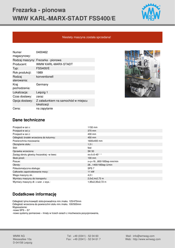 Frezarka - pionowa WMW KARL-MARX-STADT FSS400/E Niestety maszyna została sprzedana! Numer magazynowy: Rodzaj maszyny: Producent: Typ: Rok produkcji: Rodzaj sterowania: Kraj pochodzenia: Lokalizacja: Czas dostawy: Opcja dostawy: Cena: 0400462 Frezarka - pionowa WMW KARL-MARX-STADT FSS400/E 1989 konventionell Germany Leipzig 1 zaraz Z załadunkiem na samochòd w miejscu lokalizacji na zapytanie Dane techniczne Przejazd w osi x: Przejazd w osi y: Przejazd w osi z: Odległość środek wrzeciona do kolumny: Powierzchnia mocowania: Obciążenie stołu: Stòł: Oprawka wrzeciona: Zasięg obrotu głowicy frezarskiej –w lewo: Skok pinoli: Posuw: Obroty: Pòłautomatyczna obsługa: Całkowite zapotrzebowanie mocy: Waga maszyny ok.: Wymiary maszyny do transportu: Wymiary maszyny dł. x szer. x wys.: 1150 mm 370 mm 430 mm 450 mm 1600x400 mm 1,5 t fest SK 50 re+li=0-45° ° 100 mm x+y=16...800/18Step mm/min 28...1400/18Step U/min SPS 7 11 kW 4,0 t 2,0x2,4x2,72 m 1,95x2,35x2,72 m Dodatkowe informację Odległość tylna krawędź stołu/prowadnica min./maks. 125/470mm Odległość wrzeciona do powierzchni stołu min./maks. 100/500mm Wyposażenie: -nowe SPS – S7 -nowe systemy pomiarowe – linialy w trzech osiach z mozliwoscia pozycjonowania, WMW AG Messeallee 10a D-04158 Leipzig Tel: +49 (0341) - 52 04 60 Fax: +49 (0341) - 52 04 61 7 Mail: [email protected] Web: http://www.wmwag.com Frezarka - pionowa WMW KARL-MARX-STADT FSS400/E -odczyt (wyswietlacz) cyfrowy WMW AG Messeallee 10a D-04158 Leipzig Powered by TCPDF (www.tcpdf.org) Tel: +49 (0341) - 52 04 60 Fax: +49 (0341) - 52 04 61 7 Mail: [email protected] Web: http://www.wmwag.com