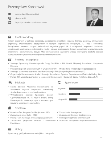 Przemysław Korczowski [email protected] pkorczowski https://pl.linkedin.com/in/korczowski Profil zawodowy Jestem ekspertem w zakresie sprzedaży, zarządzania projektami, rozwoju biznesu, poprawy efektywności organizacji. Doświadczenia zdobywałem w różnych segmentach: energetyka, IT, Telco i consulting. Zarządzałem zarówno dużymi jednostkami organizacyjnymi jak i mniejszymi zespołami. Posiadam umiejętności analityczne, a jednocześnie myślę i planuję strategicznie. Jestem samodzielny w rozwiązywaniu problemów i podejmowaniu decyzji. Moje doświadczenia są poparte wiedzą teoretyczną zdobytą podczas licznych szkoleń i potwierdzone odpowiednimi certyfikatami. Projekty i osiągnięcia Strategia Sprzedaży i Marketingu dla Grupy TAURON – PM: Model Aktywnej Sprzedaży i Utrzymania Klientów Połączenie spółek sprzedażowych w Grupie TAURON – PM: Budowa Modelu Spółki Sprzedażowej Strategia biznesowa operatora sieci komórkowej – PM (jako podwykonawca firmy EY) Organizacja Departamentu Analiz i Rozwoju Sprzedaży – Dyrektor Departamentu (Telefonia Dialog S.A.) Ponad 20% wzrost przychodów w segmencie Key Account – Kierownik Działu (Telefonia Dialog S.A.) Edukacja Studia dzienne: Akademia Ekonomiczna we Wrocławiu, Wydział Gospodarki Narodowej; studia skończone z oceną bardzo dobrą Wykształcenie średnie: Społeczne Liceum Ogólnokształcące im. M. Reja w Bielsku Białej; klasa o profilu matematycznym z rozszerzonymi językami angielskim i niemieckim Języki obce angielski niemiecki hiszpański Szkolenia Biura Portfela, Programów i Projektów - P3O Zarządzanie przez Cele – MBO Pricing - Jak zwiększyć zyski zarządzając cenami Zarządzanie projektami Prince2 - Foundation Practitioner Zarządzanie Strategiczne Zarządzanie Klientem Strategicznym Rozwój umiejętności przywódczych Studium z Zarządzania Kapitałem Ludzkim Hobby Sport: narty, golf, piłka nożna, tenis | kino | fotografia 1/2 Przemysław Korczowski – życiorys zawodowy Doświadczenia zawodowe Własna działalność Stanowiska/role: Kierownik Projektu, Konsultant, Business Development Manager Zakres działania: efektywne prowadzenie projektów i usługi consultingowe w zakresie strategii, rozwoju biznesu, sprzedaży, optymalizacji, obsługi klientów 2012-2016 Przykładowe projekty: Strategia sprzedaży dla firmy kolejowej (podwykonawca EY) Analiza organizacji, strategia sprzedaży, optymalizacja procesów obsługi klientów, negocjacje z głównymi klientami - dla ESV SA Strategia sprzedaży, rozwój biznesu, marketing – Software Forces (startup) Analiza potencjału rynkowego energetycznego dla firmy outsourcingowej Tauron Sprzedaży - spółka sprzedaży energii w holdingu energetycznym Stanowisko: Dyrektor Departamentu Produktów i Rozwoju 2011-2012 Zakres pracy: rozwój przedsiębiorstwa, tworzenie i utrzymywanie atrakcyjnej i opłacalnej oferty produktowej, skuteczne wdrażanie projektów, optymalizacja procesów, planowanie i analityka biznesowa Tauron Polska Energia - holding energetyczny zintegrowany pionowo Stanowisko: Szef Biura Zarządzania Sprzedażą Zakres pracy: rozwój sprzedaży i obsługi klienta w spółkach grupy kapitałowej, kierowanie projektami z zakresu sprzedaży, analizy biznesowe 2009-2010 Przykładowe projekty: Strategii Sprzedaży i Marketingu dla Grupy Tauron – Kierownik strumienia: model aktywnej sprzedaży i utrzymania klientów Program wdrożenia strategii sprzedaży – Dyrektora ds. Organizacji Budowa modelu spółki sprzedażowej – Kierownik Projektu Telefonia Dialog – operator telefoniczny (w 2011 kupiony przez Netia S.A.) Stanowiska: Dyrektor Analiz i Rozwoju Sprzedaży, Kierownik Działu Klientów Strategicznych, Key Account Manager 2004-2008 Zakresy pracy: Rozwój i organizacja sprzedaży, analityka sprzedażowa, wsparcie procesów sprzedaży Zarządzanie działem odpowiedzialnym za sprzedaż i obsługę posprzedażową w segmencie klientów strategicznych Pozyskiwanie nowych i opieka nad klientami w segmencie klientów strategicznych Nextira One – integrator IT (obecnie Dimension Data) Stanowisko: Konsultant Handlowy 2001-2003 Zakres pracy: sprzedaż rozwiązań telekomunikacyjnych, systemów transmisji, systemów Contact Center; negocjacje umów handlowych; prezentacje handlowe; szkolenia dla partnerów; obsługa posprzedażowa; współpraca przy realizacji kontraktów Wyrażam zgodę na przetwarzanie moich danych osobowych zawartych w mojej ofercie pracy dla potrzeb niezbędnych do realizacji procesu rekrutacji zgodnie z ustawą z dnia 29 sierpnia 1997 r. o ochronie danych osobowych (Dz. U. z 2002 r. Nr 101, poz. 926, ze zm.). 2/2