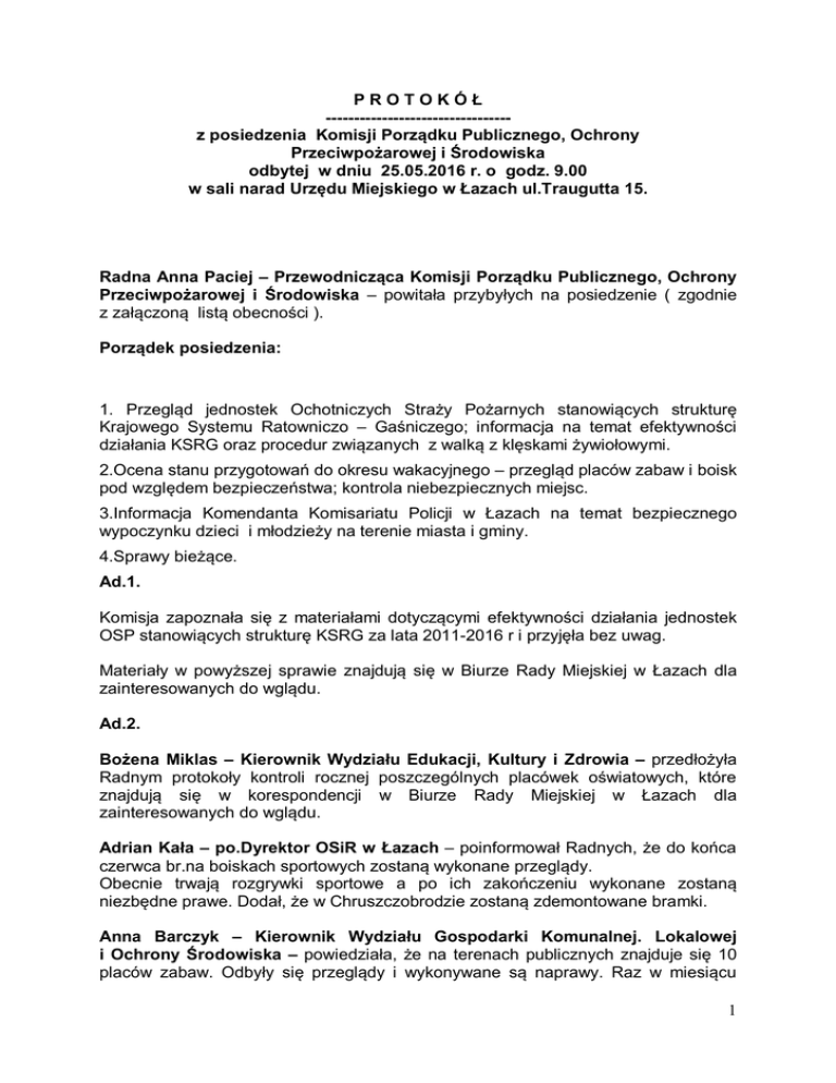 PROTOKÓŁ --------------------------------z posiedzenia Komisji Porządku Publicznego, Ochrony Przeciwpożarowej i Środowiska odbytej w dniu 25.05.2016 r. o godz. 9.00 w sali narad Urzędu Miejskiego w Łazach ul.Traugutta 15. Radna Anna Paciej – Przewodnicząca Komisji Porządku Publicznego, Ochrony Przeciwpożarowej i Środowiska – powitała przybyłych na posiedzenie ( zgodnie z załączoną listą obecności ). Porządek posiedzenia: 1. Przegląd jednostek Ochotniczych Straży Pożarnych stanowiących strukturę Krajowego Systemu Ratowniczo – Gaśniczego; informacja na temat efektywności działania KSRG oraz procedur związanych z walką z klęskami żywiołowymi. 2.Ocena stanu przygotowań do okresu wakacyjnego – przegląd placów zabaw i boisk pod względem bezpieczeństwa; kontrola niebezpiecznych miejsc. 3.Informacja Komendanta Komisariatu Policji w Łazach na temat bezpiecznego wypoczynku dzieci i młodzieży na terenie miasta i gminy. 4.Sprawy bieżące. Ad.1. Komisja zapoznała się z materiałami dotyczącymi efektywności działania jednostek OSP stanowiących strukturę KSRG za lata 2011-2016 r i przyjęła bez uwag. Materiały w powyższej sprawie znajdują się w Biurze Rady Miejskiej w Łazach dla zainteresowanych do wglądu. Ad.2. Bożena Miklas – Kierownik Wydziału Edukacji, Kultury i Zdrowia – przedłożyła Radnym protokoły kontroli rocznej poszczególnych placówek oświatowych, które znajdują się w korespondencji w Biurze Rady Miejskiej w Łazach dla zainteresowanych do wglądu. Adrian Kała – po.Dyrektor OSiR w Łazach – poinformował Radnych, że do końca czerwca br.na boiskach sportowych zostaną wykonane przeglądy. Obecnie trwają rozgrywki sportowe a po ich zakończeniu wykonane zostaną niezbędne prawe. Dodał, że w Chruszczobrodzie zostaną zdemontowane bramki. Anna Barczyk – Kierownik Wydziału Gospodarki Komunalnej. Lokalowej i Ochrony Środowiska – powiedziała, że na terenach publicznych znajduje się 10 placów zabaw. Odbyły się przeglądy i wykonywane są naprawy. Raz w miesiącu 1 wykonywane są oględziny. Dodała, że wykonywane są również koszenia na placach zabaw, których będzie 7. Krzysztof Pleban – Kierownik Wydziału Spraw Obywatelskich i Zarządzania Kryzysowego – przypomniał, że „Orlik” musi być otwarty, dlatego, że tam jest wyznaczone lądowisko dla służb pogotowia ratunkowego. Ad.3. Łukasz Grzanka – Komisariat Policji w Łazach – przedstawił informację Komendanta Komisariatu Policji w Łazach na temat bezpiecznego wypoczynku dzieci i młodzieży na terenie miasta i gminy. Przedłożony materiał znajduje się w Biurze Rady Miejskiej w Łazach dla zainteresowanych do wglądu. Ad.4. 1. Anna Barczyk – Kierownik Wydziału Gospodarki Komunalnej. Lokalowej i Ochrony Środowiska – przedłożyła Radnym Analizę stanu gospodarki odpadami komunalnymi na terenie Gminy Łazy za rok 2015. W/w analiza znajduje się w Biurze Rady Miejskiej w Łazach dla zainteresowanych do wglądu. Komisja Porządku Publicznego, Ochrony Przeciwpożarowej i Środowiska zaopiniowała pozytywnie jednogłośnie ( 6 głosów za, 1 Radny nieobecny ) Analizę stanu gospodarki odpadami komunalnymi na terenie Gminy Łazy za rok 2015. 2. Komisja zapoznała się z Rozstrzygnięciem Nadzorczym Wojewody Śląskiego stwierdzającym nieważność Uchwały Nr XIV/123/16 Rady Miejskiej w Łazach z dnia 17 lutego 2016 roku w sprawie przyjęcia „Programu opieki nad zwierzętami bezdomnymi oraz zapobiegania bezdomności zwierząt na terenie Gminy Łazy w roku 2016”. Rozstrzygnięcie Nadzorcze Wojewody Śląskiego znajduje się w Miejskiej w Łazach dla zainteresowanych do wglądu. Biurze Rady 3. Zorganizować 2 razy w roku objazd Gminy, w kwietniu i wrześniu. 2 4. Komisja Porządku Publicznego, Ochrony Przeciwpożarowej i Środowiska zaopiniowała pozytywnie jednogłośnie ( 6 głosów za, 1 Radny nieobecny ) projekt uchwały w sprawie uchwalenia planu zagospodarowania przestrzennego miasta i gminy Łazy. Na tym posiedzenie zakończono. Protokół sporządziła Teresa Kurzacz Przewodnicząca Komisji /-/ Anna Paciej 3