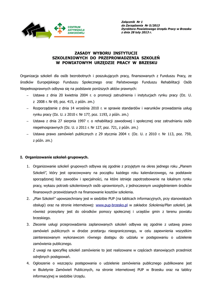 Załącznik Nr 1 do Zarządzenia Nr 5/2013 Dyrektora Powiatowego Urzędu Pracy w Brzesku z dnia 28 luty 2013 r. ZASADY WYBORU INSTYTUCJI SZKOLENIOWYCH DO PRZEPROWADZENIA SZKOLEŃ W POWIATOWYM URZĘDZIE PRACY W BRZESKU Organizacja szkoleń dla osób bezrobotnych i poszukujących pracy, finansowanych z Funduszu Pracy, ze środków Europejskiego Funduszu Społecznego oraz Państwowego Funduszu Rehabilitacji Osób Niepełnosprawnych odbywa się na podstawie poniższych aktów prawnych: – Ustawa z dnia 20 kwietnia 2004 r. o promocji zatrudnienia i instytucjach rynku pracy (Dz. U. z 2008 r. Nr 69, poz. 415, z późn. zm.) – Rozporządzenie z dnia 14 września 2010 r. w sprawie standardów i warunków prowadzenia usług rynku pracy (Dz. U. z 2010 r. Nr 177, poz. 1193, z późn. zm.) – Ustawa z dnia 27 sierpnia 1997 r. o rehabilitacji zawodowej i społecznej oraz zatrudnianiu osób niepełnosprawnych (Dz. U. z 2011 r. Nr 127, poz. 721, z późn. zm.) – Ustawa prawo zamówień publicznych z 29 stycznia 2004 r. (Dz. U. z 2010 r. Nr 113, poz. 759, z późn. zm.) I. Organizowanie szkoleń grupowych. 1. Organizowanie szkoleń grupowych odbywa się zgodnie z przyjętym na okres jednego roku „Planem Szkoleń”, który jest opracowywany na początku każdego roku kalendarzowego, na podstawie sporządzonej listy zawodów i specjalności, na które istnieje zapotrzebowanie na lokalnym rynku pracy, wykazu potrzeb szkoleniowych osób uprawnionych, z jednoczesnym uwzględnieniem środków finansowych przewidzianych na finansowanie kosztów szkolenia. 2. „Plan Szkoleń” upowszechniany jest w siedzibie PUP (na tablicach informacyjnych, przy stanowiskach obsługi) oraz na stronie internetowej: www.pup-brzesko.pl w zakładce Szkolenia/Plan szkoleń, jak również przesyłany jest do ośrodków pomocy społecznej i urzędów gmin z terenu powiatu brzeskiego. 3. Zlecenie usługi przeprowadzenia zaplanowanych szkoleń odbywa się zgodnie z ustawą prawo zamówień publicznych w drodze przetargu nieograniczonego, w celu zapewnienia wszystkim zainteresowanym wykonawcom równego dostępu do udziału w postępowaniu o udzielenie zamówienia publicznego. Z uwagi na specyfikę szkoleń zamówienie to jest realizowane w częściach stanowiących przedmiot odrębnych postępowań. 4. Ogłoszenie o wszczęciu postępowania o udzielenie zamówienia publicznego publikowane jest w Biuletynie Zamówień Publicznych, na stronie internetowej PUP w Brzesku oraz na tablicy informacyjnej w siedzibie Urzędu. 5. Po zamieszczeniu ogłoszenia o wszczęciu postępowania, Specyfikacja Istotnych Warunków Zamówienia wraz z obowiązującymi załącznikami dostępna jest na stronie internetowej www. www.pup-brzesko.pl, w zakładce Urząd/Zamówienia Publiczne. 6. Oceny ofert oraz wyboru instytucji szkoleniowej dokonują członkowie Komisji Przetargowej powołanej przez Dyrektora PUP, w co najmniej trzyosobowy, który ustalany jest dla danego przetargu zgodnie z listą obecności w dniu otwarcia ofert. Komisja przetargowa pracuje zgodnie z przyjętym regulaminem. 7. Zawarcie umowy z wybraną do przeprowadzenia szkolenia instytucją następuje na zasadach określonych w przepisach Prawo zamówień publicznych oraz Kodeksu cywilnego. II. Organizowanie dodatkowych szkoleń grupowych. 1. W przypadku zaistnienia możliwości zorganizowania dodatkowego szkolenia poza Planem Szkoleń, którego wartość nie przekracza wyrażonej w złotych równowartości kwoty 14.000 Euro oraz w sytuacji konieczności szybkiej realizacji zadania, podstawą wszczęcia postępowania jest wniosek posiadający akceptację osób nadzorujących zamówienie tj. Dyrektora PUP i Głównego Księgowego, wraz z uzasadnieniem potrzeby jego realizacji. 2. W celu zapewnienia konkurencyjności i właściwej realizacji szkoleń PUP zamieszcza ogłoszenie o planowanym zamówieniu usługi szkoleniowej do publicznej wiadomości poprzez umieszczenie zaproszenia do składania ofert na stronie internetowej PUP oraz na tablicach ogłoszeń w siedzibie Urzędu oraz dodatkowo zaprasza co najmniej 3 instytucje szkoleniowe, które na podstawie informacji ogólnie dostępnych organizują szkolenia z danego zakresu tematycznego. 3. Zamieszczone zaproszenie zawiera informacje niezbędne do przygotowania oferty tj.: - podstawę prawną organizacji szkoleń - zasady wyboru i oceny instytucji szkoleniowych - warunki oraz wymagania dotyczące realizacji szkolenia - termin i miejsce składania ofert. 4. Instytucja szkoleniowa przygotowuje ofertę zgodnie z obowiązującym „Formularzem Oferty”, dostępnym w siedzibie Urzędu, u specjalistów ds. rozwoju zawodowego. Na prośbę zainteresowanych może on zostać przesłany w formie elektronicznej. 5. Ocenie podlegać będą oferty spełniające wymagania formalno-prawne zgodnie z przepisami obowiązującymi przy organizacji szkoleń dla osób bezrobotnych i poszukujących pracy, wypełnione czytelnie, we wszystkich wskazanych miejscach, zawierające komplet obowiązujących załączników. 6. Dopuszcza się możliwość zlecenia usługi, w przypadku gdy wpłynie tylko jedna kompletna oferta, zgodna z warunkami określonymi w zaproszeniu do składania ofert. W sytuacji, gdy na zaproszenie nie odpowie żadna instytucja szkoleniowa Urząd ponowi zaproszenie do składania ofert. 7. Oceny ofert oraz wyboru instytucji szkoleniowej dokonuje komisja, powołana przez Dyrektora PUP, w co najmniej trzyosobowym składzie, zgodnie z listą obecności w dniu dokonywania oceny wg. „Kryteriów wyboru instytucji szkoleniowej”, stanowiących załącznik Nr 2 do niniejszego zarządzenia. 8. Z prowadzonego postępowania w sprawie wyboru instytucji szkoleniowej sporządzany jest protokół, który zawiera: - opis przedmiotu zamówienia - wskazanie ilości środków i źródła ich finansowania -wykaz instytucji, które odpowiedziały na zaproszenie i złożyły ofertę wraz z informacją o wynikach uzyskanych w trakcie oceny. 9. Protokół z przepr