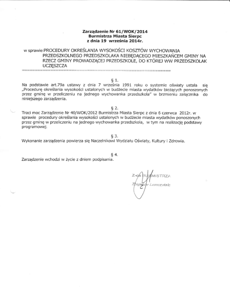 Żarządzenie N r 61 /WoK/ 20 14 Burmistrza Miasta Sierpc z dnia 19 września 2014r. w sprawie: PRoCEDURY oKREŚLANIA WYsoKośctrosrrow WYCHoWANIA PRZEDSZKoLNEGo PRZEDSZKoLAKA NIEBĘDĄCEGo MIESZKAŃcEtv clłIruy llR MECZ GMINY PRoWADZĄCEJ PRZEDSZKoLE, Do KToREJ WW PMEDSZKoLAK UCzĘszCz^ z s1. dnia 7 września 1991 roku o systemie ośWiaty ustala się ,,Procedurę określaniawysokości ustalonych w budżecie miasta Wydatków bieżących ponoszonych przez gminę w prze|iczeniu na jednego wychowanka przedszkola" W brzmieniu załącznika do nin iejszego zaządzenia' Na podstawie art.79a ustawy 92. Traci moc Zaządzenie Nr 40/WoKi2012 Burmistza lvliasta Sierpc z dnia 6 czerwca 20I2r ' w sprawie procedury określania wysokości ustalonych W budżecie miasta wydatków ponoszonych przez gminę W przeliczeniu na jednego wychowanka przedszkola, W tym na realizację podstawy programowej. 53, Wykonanie zarządzenia powierza się Nacze|nikowi Wydziału oświaty,Kultury i Zdrowia. s4. Zarządzenie wchodzi w Ącie z dniem podpisania. MIS']'RZ,A ,L.eszcrłńslo Załącznik do zarządzenia Nr 61 /WoK/2014 jH[lg'*ff:Ł'jiffi: PRocEDURA oKREśLANIAWYsoKoścI KoszTóW WYCHoWANIA PRZEDszKoLNEGo PRzEDszKoLAKA NIEBĘDĄcEGo MIESZKAŃcEM GMINY NA RzEcz GMINY PRoWADzĄcEJ PRzEDszKoLE/ Do KToREJ WW PRzEDszKoLAK UczĘszczA $r. W celu Żgromadzenia danych, niezbędnych do wyliczenia tłydatków bieżących przewidzianych na jednego ucznia W publicznych pzedszkolach, prowadzonych przez gminę, na|eży zgromadzić następujące dane: 1. Iiczbę uczniów W prowadzonych przez 9minę lV]iasto Sierpc Miejskich Przedszkolach Nr 1,Nr 2, Nr 3 i nr 4 'określoną na podstawie spisu S]o, sporządzonego przez czterech dyrektorów miejskich przedszkoli wg stanu na dzień 30 wrześniaroku poprzedzającego rok ka|endarzowy, d|a którego naliczana jest Wysokość kosztów wychowania pzedszkolnego. LicŻby przedszkolaków z wszystkich pzedszkoli Wg stanu na 30 wześnia na|eży zsumować' Placówka MPI MP2 Licuba dzieci wg rvieku !v nie.jskich przedszkolach - wg stanu z SIO na dzień ]0 lvrześnia poprzedzającego DRUK nr 1. roku kalendażolveso MPI MP4 RAZE}I: Z.Wydatki biezące przewidziane na dany rok w miejskich pzedszkolach Podstawę wy|iczeń stanowią Ęzne d|a Wszystkich przedszko|i wydatki bleżące przewidziane na dany rok budżetowy. Wydatki bieżące przedszkoIi nie obejmują WydatkóW inWestycyjnych finansowanych bezpośrednio z budżetu inwestycyjnego gminy. Ponadto Z uwagi na fakt, że opłaty za Wyżywienie są wpłacane na odrębne konto i nie wchodzą w budżety przedszkoli (Wpłaty Za Wyżywienie w całościpokryvvają V!Ą/datki na posiłki uczniów) _ Wpłaty i vfydatki za Vvyżywienie (s 4220) nie są W tym Wyliczeniu uwzg|ędniane ani po stronie wydatków ani po stronie dochodów pzedszko|i. DRUK nr 2. Budżet na rok 2....... PRZEDSZKoLA RAZEM (Ż zatwierdŻonvch b!dŹetó!Ą/ DrzedsŻkoli z UchWałV budżetowei) 3020 Naqr. iWVd. osob. nie zal' do Wnaqrodzeń 3030 Różne Wvdatki , odszkod. ra rzecŻ osób fizvczrych 4010 Wynaqr. osob. Dracow. 4040 Dod. wynaqT. roczne 4110 składki na ubezo. sDołeczn 4120 składki na fundusz pracv' 4170 Wvn.bezosobowe 4210 zakuD mat. i WvDosażenja: 4240 Zak oom ' nauk. ksiaż' 4260 Zakup enerqii 4270 zakup usłuq remont. 4280 Usłuqi zdrowotne 4300 Zakup Dozost. usłuo 4350 zakuo usł internetow. 4360 Zakup Usł. tel.komórk. 4370 Tel. stacionarny 4410 Podróże służbowekraj 4430 Różne oDłatv i składki 4440 odDisv na Zak. fund. śW. 4700 szkolenia oracowników + na doskonalenle idoksńałcanie n-|i MZEI"I: wYSoKoŚc oPŁAT zA KoRZYSTANIE z wYcHowANIA PRZEDSZKoLNEGo W MIEJSKICH PRZEDSZKOLACH W ROKU PIacó\Ą'ka DRUK nr 3. opłaty za korzystanie z wychowania przedszkolnego (z zatvvierdŻonych budŹetóW orzedszkoli z uchWałV budżetowei) RA7,I'}T: wYSoKoŚc PRZEW|DYWANEJ RoK DoTACJI PRZEDSZKoLNEJ W MIEJSKICH PRZEDSZKOLACH W ROKU Liczba dzieci NA DANY Wysokość rocznej dotacji przedszkolnej na iednego wychowanka przedszkola w danvm roku DRUK nr 4. DOTACJA PRŻEDSZKOLNA z budżetu państwa dla dzieci W miejskich przedszkolach s2. PODSUMOWANIE: określając Wydatki bieżące korzystamy Z zestawienia z Zatwierdzonego na dany rok w uchwale budżetowej mjasta budżetu łącznie dla wszystkich przedszkoli_ bez kwot na pokrycie zakupu żywności(s 4zz0) i bez inwestycji finansowanych bezpośrednio z budżetu inwestycyjnego gminy pornniejszone o wpłaĘ rodziców za zajęcia dodatkowe oraz o dotację przedszkolną udzieloną Z budżetu państwa na dzieci W naszych miejskich pzedszkolach. Tak usta|one Wydatki bieżące to inaczej dotacja gminy na dla t. Wydatki bieżące przewidziane w pubIicznych przedszkolach na rok 20.... RAZEMT (z tabeli nr 2) opłata od rodziców we WsŻystkich miejskich przedszkolach (z tabeli nr 3) dotacja, o której mowa W art'14d ust'1 ustawy o systemie oświaĘz budżetu państwa EW. dotacja przedszkolna (z tabeli nr 4) liczba wychowanków przedszkoli w roku 2.'. k tabeli nr 1) Wydatki bieżące przewidziane w publicznych przedsŻkoIach prowadzonych przez 14iasto Sierpc pomniejszone o opłaty za korzystanie z wychowania pzedszko|nego oraz o kwotę dotacii Drzedszkolnei: wydatki bieżące ponoszone przez gminę W prze|iczeniu na iedneoo ucznia/wvchowanka Drzedszkola Wydatki bieŹące przewidziane na jednego ucznia W orŻe|iczeniu na miesiac (:12 m'cv) -