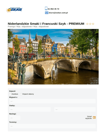 61 852 45 72 [email protected] Niderlandzkie Smaki i Francuski Szyk - PREMIUM Francja / Wyc. objazdowe / Wyc. objazdowe Dojazd: Autobus Dojazd własny Wyjazd z: Osoby: Noclegi: Dzień wyjazdu Terminy: Pokój: Wyżywienie: Najtańsza oferta Styczniowe Rabaty zniżka 20% cena katalogowa do 10 marca 2017: 797,00 zł do 10 marca 2017: 239,10 zł do 24 lipca 2017: 0,00 zł do 24 lipca 2017: 557,90 zł Suma: 797,00 zł Suma: 797,00 zł Opis oferty Miejscowość Komunikat W terminie Opinie28.04 - 07.05 dany wyjazd nie będzie realizowany autokarem PREMIUM. Przejazd Rozkład jazdyautokarem PREMIUM autokar-premium-oskar-tablet-gniazdko-usb-wygodne-fotele Realizacja imprezy autokarami PREMIUM to gwarancja: transportu autokarami z roczników 2015 i 2016 produkcji Irizar i VDL indywidualnego, multimedialnego systemu rozrywki - tablet z dotykowym ekranem w każdym zagłówku (filmy, gry, muzyka itp.). Możliwość podłączenia własnego nośnika danych poprzez wejście AUX lub USB. najwyższej klasy skórzanych lub półskórzanych foteli z możliwością regulacji oparcia lub/i zagłówka największej w Polsce przestrzeni między siedzeniami małej półki przed każdym siedzeniem + siateczki na czasopisma, książki czy telefon bezpłatnego dostępu do sieci WiFi na terenie Polski* gniazdek elektrycznych 230V wydajnej klimatyzacji sterowanej indywidualnie bogato wyposażonego barku udostępnionego w czasie jazdy WC na pokładzie autokaru Idealna i komfortowa podróż… ZAWSZE! Na ternie Polski GWARANTUJEMY, że wszystkie przejazdy realizowane są autobusem, busem lub samochodem osobowym. Zapewnimy komfortowy transport na każdym etapie podróży. Ważne: Autokar Premium jest autokarem docelowym. *jakość usług internetowych może różnić się w zależności od jakości sygnału TOUR GUIDE oprowadzanie z indywidualnym systemem nagłośnieniowym Mobilny zestaw audio: indywidulany zestaw słuchawkowy połączony bezprzewodowo z mikrofonem pilota/przewodnika. Zakwaterowanie Hotele **/*** położone na przedmieściach miast. Pokoje z łazienkami, często TV oraz dostępem do Internetu WiFi. W hotelach zazwyczaj znajduje się restauracja. Dostępne opcje zakwaterowania: pokój 2 - osobowy pokój 3 - osobowy dokwaterowanie (bez dopłat*) lub pokój 1 - osobowy (dopłata) Dostępne opcje wyżywienia wyżywienie BB: 2 śniadania wyżywienie HB: 2 śniadania i 2 obiadokolacje śniadania kontynentalne: pieczywo, dżem, masło, kawa, herbata obiadokolacje serwowane: sałatka/zupa/przystawka/, danie główne, deser/owoc; napoje do obiadokolacji dodatkowo płatne Pakiet KOMFORT gwarancja wyboru miejsca w autokarze napoje w autokarze w cenie (6 x do wyboru: kawa, herbata, zimny napój 0,2l) cena: 50 zł/os Pakiet PRESTIGE gwarancja wyboru miejsca w autokarze napoje w autokarze w cenie (6 x do wyboru: kawa, herbata, zimny napój 0,2l) pierwszeństwo wejścia na pokład autokaru nadbagaż 5 kg w cenie napoje do obiadokolacji (0,2l) cena: 100 zł/os Karta Dużej Rodziny www.oskar.com.pl/zalaczniki/karta_duzej_rodziny Warunki promocji FIRST MINUTE www.oskar.com.pl/zalaczniki/warunki_promocji Turystyczny Fundusz Gwarancyjny W związku z powołaniem do życia w dniu 26.11.2016 Turystycznego Funduszu Gwarancyjnego każdy klient Biura Podróży Oskar zobowiązany jest do zapłaty kwoty w wysokości 10zł/os. przy każdorazowej rezerwacji imprezy turystycznej (obowiązuje od dnia 26.11.2016). Kwota przeznaczona na Turystyczny Fundusz Gwarancyjny zostanie automatycznie doliczona do wartości rezerwacji (w momencie jej dokonania). Wyjątkiem są imprezy turystyczne odbywające się w krajach posiadających granicę z Rzeczpospolitą Polską. Składka nie jest przychodem biura. Ubezpieczenie Warunki ubezpieczenia Bezpieczne Podróże Signal Iduna dokument do pobrania www.oskar.com.pl/zalaczniki/owu Warunki ubezpieczenia Kosztów Imprezy Turystycznej Signal Iduna dokument do pobrania www.oskar.com.pl/zalaczniki/owurg Udogodnienia Klimatyzacja Regulowane fotele Tacki GPS Multimedia Nowoczesna flota Zawodowy kierowca Pasy bezpieczeństwa Toaleta w autokarze Podnóżki Wi-Fi Bez paszportu Premium Elite Tour guide Program ramowy DZIEŃ 1 (środa) Wyjazd z Polski zgodnie z rozkładem jazdy autokarów. Przejazd przez Niemcy. (Trasa od granicy ok. 732 km) DZIEŃ 2 (czwartek) Przyjazd do Amsterdamu w godzinach porannych. Zwiedzanie zaczniemy od rejsu po licznych, miejskich kanałach, podczas którego będziemy mieli okazję podziwiać uroki stolicy Holandii. W trakcie wycieczki łodzią zobaczymy m.in. - Muzeum Van Gogha, Muzeum Narodowe Rijksmuseum, dom Rembrandta, Anny Frank oraz Stację Centralną, stanowiącą charakterystyczny punkt miasta (czas trwania rejsu to ok. 75 minut). Następnie udamy się na spacer z przewodnikiem, podczas którego zobaczymy inne ciekawe i ważne miejsca, jak Oude Kerk, Plac Dam, Singel - najstarszy kanał, Magere Brud, Dzielnicę Czerwonych Latarni. Czas wolny, który możemy wykorzystać na zakup pamiątek, zwiedzanie obiektów wewnątrz. Po południu odwiedzimy Muzeum Heinekena. Poznamy historię firmy produkującej jedno z najsłynniejszych piw na całym świecie. Odkryjemy 4 główne składniki piwa oraz proces ważenia, a na końcu zostaniemy zaproszeni na degustację! Przy okazji nauczymy się, w jaki sposób powinno się nalewać Heinekena. Wieczorem przejazd do hotelu, przy trasie Amsterdam Bruksela. Nocleg. (Trasa ok. 200 km) DZIEŃ 3 (piątek) Śniadanie. Wykwaterowanie z hotelu. Zwiedzanie Brukseli z pilotem - przewodnikiem. Podczas spaceru zobaczymy m.in. Dzielnicę Europejską, Pałac Królewski, Pałac Sprawiedliwości oraz Katedrę Świętego Michała - patrona miasta. Zobaczymy również bardzo charakterystyczny obiekt w Brukseli, jakim jest Atomium - pierwiastek żelaza powiększony 185 miliardów razy. Kolejnym punktem spaceru po mieście będzie tutejsza starówka i Manneken Pis - pomnik siusiającego chłopca, najbardziej rozpoznawalna postać stolicy Belgii, często przebier