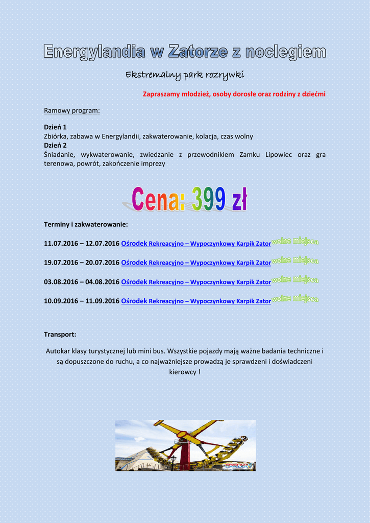 Ekstremalny park rozrywki Zapraszamy młodzież, osoby dorosłe oraz rodziny z dziećmi Ramowy program: Dzień 1 Zbiórka, zabawa w Energylandii, zakwaterowanie, kolacja, czas wolny Dzień 2 Śniadanie, wykwaterowanie, zwiedzanie z przewodnikiem Zamku Lipowiec oraz gra terenowa, powrót, zakończenie imprezy Terminy i zakwaterowanie: 11.07.2016 – 12.07.2016 Ośrodek Rekreacyjno – Wypoczynkowy Karpik Zator 19.07.2016 – 20.07.2016 Ośrodek Rekreacyjno – Wypoczynkowy Karpik Zator 03.08.2016 – 04.08.2016 Ośrodek Rekreacyjno – Wypoczynkowy Karpik Zator 10.09.2016 – 11.09.2016 Ośrodek Rekreacyjno – Wypoczynkowy Karpik Zator Transport: Autokar klasy turystycznej lub mini bus. Wszystkie pojazdy mają ważne badania techniczne i są dopuszczone do ruchu, a co najważniejsze prowadzą je sprawdzeni i doświadczeni kierowcy ! Cena zawiera: Transport w dwie strony, nocleg w pokojach 2-4 osobowych z łazienkami w bezpiecznej okolicy, wyżywienie 2 posiłki dziennie, ubezpieczenie NNW – TU Europa, opiekę pilota podczas całej imprezy, realizację programu – w tym wszystkie bilety wstępu, miejscowych przewodników. Dodatkowe informacje: Zaliczka wynosi 250 zł – płatna nie później niż 21 dni przed rozpoczęciem wyjazdu. Pozostała część kwoty powinna zostać wpłacona do 14 dni przed startem imprezy. Kraj, w którym wycieczka będzie zrealizowana: POLSKA; nie ma szczególnych zaleceń sanitarnych bądź dotyczących zdrowia. Impreza może zostać odwołana w przypadku niewystarczającej liczby zgłoszeń maksymalnie 10 dni przed planowanym rozpoczęciem. W takim przypadku klient otrzyma drogą pisemną informację o anulacji wycieczki – do 10 dni przed jej rozpoczęciem. Podstawą prawną niniejszej oferty, a także dokumentem określającym konsekwencje jest: Ustawa o usługach turystycznych z dnia 29 sierpnia 1997 roku Dz.U. 1997 Nr 133 poz. 884. Wyjazd: Poznań 05:00,Kościan 05:45 , Leszno 06:30,Trzebnica 07:30, Wrocław 08:15 Miejsca zbiórki zostaną dokładnie określone min. 7 dni przed wyjazdem Organizator: ORTiR Ośrodek Rozwoju Turystyki i Rekreacji Maksymilian Kwiatkowski Ul. Pagórkowa 13, 62-081 Przeźmierowo, Chyby www.ortir.pl NIP: 781-191-59-03 REGON: 362662172 Wpis do rejestru organizatorów i pośredników turystycznych: 729 Gwarancja ubezpieczeniowa: TU Europa nr GT 139/2016 Rezerwacja miejsc, pytania: TEL. 506 – 634 – 637 MAIL: [email protected]