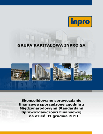 Skonsolidowane Sprawozdanie Finansowe Grupy Kapitałowej INPRO SA ZA 2011 rok Wszystkie kwoty w tysiącach złotych, o ile nie podano inaczej GRUPA KAPITAŁOWA INPRO SA Skonsolidowane sprawozdanie finansowe sporządzone zgodnie z Międzynarodowymi Standardami Sprawozdawczości Finansowej na dzień 31 grudnia 2011 1 z 86 Skonsolidowane Sprawozdanie Finansowe Grupy Kapitałowej INPRO SA ZA 2011 rok Wszystkie kwoty w tysiącach złotych, o ile nie podano inaczej SPIS TREŚCI WYBRANE DANE FINANSOWE DOTYCZĄCE SKONSOLIDOWANEGO SPRAWOZDANIA FINANSOWEGO GRUPY KAPITAŁOWEJ INPRO SA ............... 4 SKONSOLIDOWANE SPRAWOZDANIE Z CAŁKOWITYCH DOCHODÓW ZA OKRES ZAKOŃCZONY 31 GRUDNIA 2011 ....................................................... 5 SKONSOLIDOWANE SPRAWOZDANIE Z SYTUACJI FINANSOWEJ ZA OKRES ZAKOŃCZONY 31.12.2011 ............................................................................. 6 SKONSOLIDOWANE SPRAWOZDANIE ZE ZMIAN W KAPITALE WŁASNYM ZA OKRES ZAKOŃCZONY 31.12.2011 .................................................................. 8 SKONSOLIDOWANE SPRAWOZDANIE ZE ZMIAN W KAPITALE WŁASNYM ZA8 OKRES ZAKOŃCZONY 31.12.2010 .................................................................. 8 SKONSOLIDOWANE SPRAWOZDANIE Z PRZEPŁYWÓW PIENIĘŻNYCH ZA OKRES ZAKOŃCZONY 31.12.2011 .................................................................. 9 DODATKOWE INFORMACJE I OBJAŚNIENIA .................................................11 Nota 1 Informacje ogólne ...................................................................................11 Nota 2 Skład Grupy Kapitałowej ..........................................................................12 Nota 3 Skład Zarządu oraz Rady Nadzorczej Spółki Dominującej .............................14 Nota 4 Zatwierdzenie sprawozdania finansowego ..................................................14 Nota 5 Podstawa sporządzenia skonsolidowanego sprawozdania finansowego ...........14 Nota 6 Status zatwierdzenia standardów w UE ......................................................15 Nota 7 Nowe standardy i interpretacje ................................................................16 Nota 8 Wcześniejsze zastosowanie standardów i interpretacji .................................17 Nota 9 Zmiany stosowanych zasad rachunkowości ................................................17 Nota 10 Korekta błędu .......................................................................................17 Nota 11 Istotne wartości oparte na profesjonalnym osądzie i szacunkach .................17 Nota 12 Zastosowane zasady rachunkowości ........................................................18 Nota 13 Efekt zastosowania nowych standardów rachunkowości i zmian polityki rachunkowości ..................................................................................................31 Nota 14 Informacje dotyczące segmentów operacyjnych ........................................31 Nota 15 Przychody i koszty.................................................................................36 Nota 16 Podatek dochodowy ...............................................................................39 Nota 17 Działalność zaniechana oraz aktywa przeznaczone do sprzedaży .................43 Nota 18 Majątek socjalny oraz zobowiązania ZFŚS ................................................43 Nota 19 Zysk przypadający na jedną akcję ...........................................................43 Nota 20 Dywidendy wypłacone i zadeklarowane do wypłaty ....................................44 Nota 21 Rzeczowe aktywa trwałe ........................................................................45 Nota 22 Nieruchomości inwestycyjne. ..................................................................47 Nota 23 Wartości niematerialne ..........................................................................48 Nota 24 Połączenie jednostek gospodarczych ........................................................50 Nota 25 Pozostałe aktywa finansowe ...................................................................53 Nota 26 Zapasy ................................................................................................53 Nota 27 Należności z tytułu dostaw i usług oraz pozostałe należności .......................55 Nota 28 Środki pieniężne i ich ekwiwalenty...........................................................56 Nota 29 Kapitał zakładowy oraz pozostałe kapitały ................................................58 Nota 30 Rezerwy ...............................................................................................60 Nota 31 Oprocentowane kredyty bankowe, leasingi i wyemitowane obligacje ............61 Nota 32 Zobowiązania z tytułu dostaw i usług oraz pozostałe zobowiązania ..............67 2 z 86 Skonsolidowane Sprawozdanie Finansowe Grupy Kapitałowej INPRO SA ZA 2011 rok Wszystkie kwoty w tysiącach złotych, o ile nie podano inaczej Nota 33 Dotacje rządowe ...................................................................................68 Nota 34 Zobowiązania i należności warunkowe .....................................................68 Nota 35 Informacje o podmiotach powiązanych.....................................................70 Nota 36 Cele i zasady zarządzania ryzykiem finansowym .......................................76 Nota 37 Zarządzanie kapitałem ...........................................................................83 Nota 38 Instrumenty finansowe ..........................................................................84 Nota 39 Struktura zatrudnienia ...........................................................................85 Nota 40 Wynagrodzenie biegłego rewidenta lub podmiotu uprawnionego do badania sprawozdań finansowych ....................................................................................85 Nota 41 Zdarzenia po dniu bilansowym .....................................
