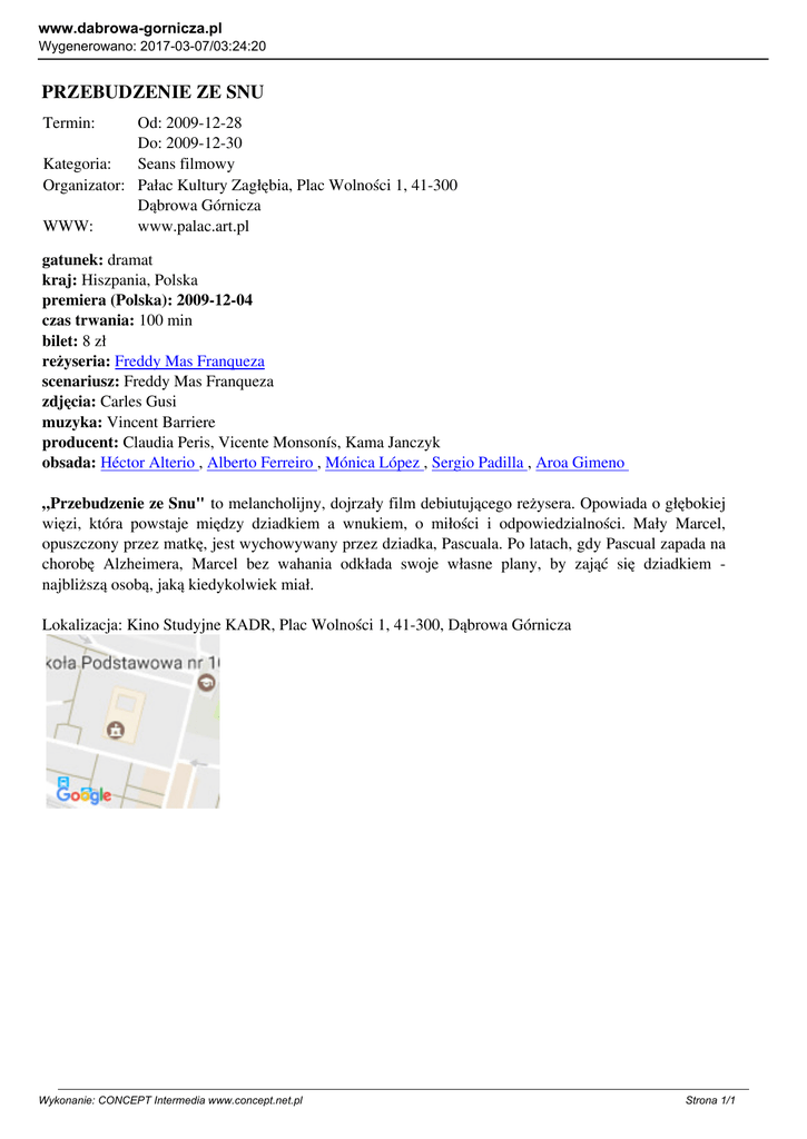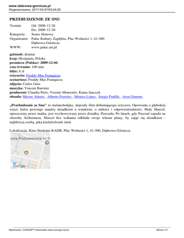 www.dabrowa-gornicza.pl Wygenerowano: 2017-03-07/03:24:20 PRZEBUDZENIE ZE SNU Termin: Od: 2009-12-28 Do: 2009-12-30 Kategoria: Seans filmowy Organizator: Pałac Kultury Zagłębia, Plac Wolności 1, 41-300 Dąbrowa Górnicza WWW: www.palac.art.pl gatunek: dramat kraj: Hiszpania, Polska premiera (Polska): 2009-12-04 czas trwania: 100 min bilet: 8 zł reżyseria: Freddy Mas Franqueza scenariusz: Freddy Mas Franqueza zdjęcia: Carles Gusi muzyka: Vincent Barriere producent: Claudia Peris, Vicente Monsonís, Kama Janczyk obsada: Héctor Alterio , Alberto Ferreiro , Mónica López , Sergio Padilla , Aroa Gimeno „Przebudzenie ze Snu" to melancholijny, dojrzały film debiutującego reżysera. Opowiada o głębokiej więzi, która powstaje między dziadkiem a wnukiem, o miłości i odpowiedzialności. Mały Marcel, opuszczony przez matkę, jest wychowywany przez dziadka, Pascuala. Po latach, gdy Pascual zapada na chorobę Alzheimera, Marcel bez wahania odkłada swoje własne plany, by zająć się dziadkiem najbliższą osobą, jaką kiedykolwiek miał. Lokalizacja: Kino Studyjne KADR, Plac Wolności 1, 41-300, Dąbrowa Górnicza Wykonanie: CONCEPT Intermedia www.concept.net.pl Strona 1/1