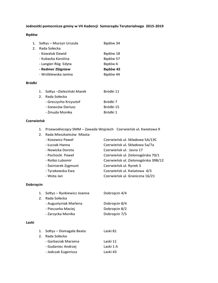 Jednostki pomocnicze gminy w VII Kadencji Samorządu Terytorialnego 2015-2019 Będów 1. Sołtys – Murzyn Urszula 2. Rada Sołecka - Kowaluk Dawid - Kubacka Karolina - Langier-Róg Edyta - Redmer Zbigniew - Wróblewska Janina Będów 34 Będów 18 Będów 57 Będów 6 Będów 42 Będów 44 Bródki 1. Sołtys –Zieleziński Marek 2. Rada Sołecka - Greczycho Krzysztof - Szewców Dariusz - Żmuda Monika Bródki 11 Bródki 7 Bródki 15 Bródki 1 Czerwieńsk 1. Przewodniczący SMM – Zawada Wojciech Czerwieńsk ul. Kwiatowa 9 2. Rada Mieszkańców Miasta - Kosowicz Paweł Czerwieńsk ul. Składowa 5A/13C - Łuczak Hanna Czerwieńsk ul. Składowa 5a/7a - Nowicka Dorota Czerwieńsk ul. Jasna 17 - Pochocki Paweł Czerwieńsk ul. Zielonogórska 70/1 - Rotko Lubomir Czerwieńsk ul. Zielonogórska 39B/12 - Świniarek Zygmunt Czerwieńsk ul. Rynek 3 - Tyrakowska Ewa Czerwieńsk ul. Kwiatowa 4/3 - Wota Jan Czerwieńsk ul. Graniczna 16/21 Dobrzęcin 1. Sołtys – Rynkiewicz Joanna 2. Rada Sołecka - Augustyniak Marlena - Pieczarka Maciej - Zarzycka Monika Dobrzęcin 4/4 1. Sołtys – Domagała Beata 2. Rada Sołecka - Garbaciak Marzena - Gudaniec Andrzej - Jadczak Eugeniusz Laski 81 Dobrzęcin 8/4 Dobrzęcin 8/2 Dobrzęcin 7/5 Laski Laski 11 Laski 1 A Laski 43 - Malinowska Monika - Stekla Ewa Laski 6 Laski 72 Leśniów Wielki 1. Sołtys – Majkut Jerzy 2. Rada Sołecka - Pakosz Teresa - Półrolnik Przemysław - Ratajczak Teresa - Roziel Jadwiga - Sarna Ryszard Leśniów Wielki 9 Leśniów Wielki 40 (rejestr wyborców), zameldowana Zielona Góra u. M.C.Skłodowska5/62 Leśniów Wielki 66 Leśniów Wielki 84 Leśniów Wielki 3 B Leśniów Wielki 47 Leśniów Mały 1. Sołtys – Warszawski Radosław 2. Rada Sołecka - Kałużna Katarzyna - Kędzierska Małgorzata - Machowiak Krzysztof - Nieściór Violetta Leśniów Mały 17 A Leśnów Mały 39 Leśnów Mały 11 Leśnów Mały 45 A Leśniów Mały 43 Nietków 1. Sołtys – Kaźmierczak Halina 2. Rada Sołecka - Frątczak Halina - Kozak Andrzej - Śliwińska Elżbieta - Kłos-Wygas Beata - Kaczmarska Edyta Nietków ul. T.Kościuszki 12 Nietków ul. Kwiatowa 8 Nietków ul. Przedszkolna 4 Nietków ul. J.Kasprowicza 32 Nietków ul. T.Kościuszki 131 Nietków ul. T.Kościuszki 9 Nietkowice 1. Sołtys – Konieczny Stanisław 2. Rada Sołecka - Bubieńczyk Leon - Burny Paweł -Kielka Waldemar - Nijaka Marzena - Paprocka Sylwia Nietkowice 137 1. Sołtys – Dobrychłop Jan 2. Rada Sołecka - Feszter Marcin Płoty ul. Lubuska 16 Nietkowice 133 Nietkowice 117 Nietkowice 89 Nietkowice 22 A Nietkowice 128 Płoty Płoty ul. Lubuska 43 - Nawrocki Piotr - Skubiszewski Michał - Strąk Zenon - Wołkowska Zofia Płoty ul. Szkolna 5 Płoty ul. Dębowa 10 Płoty ul. Leśna 6 Płoty Osiedle Widok 5 Sudoł 1. Sołtys – Przychodzka Żaneta 2. Rada Sołecka - Borowski Mariusz - Olszewska Magdalena - Suchecki Mariusz Sudoł 26 Sudoł 14 Sudoł 36 Sudoł 25 Sycowice 1. Sołtys – Woch Cezary 2. Rada Sołecka - Adamczyk Agnieszka - Gryszko Anna - Lipiński Czesław Sycowice 15 Sycowice 55 Sycowice 47 Sycowice 34 Wysokie 1. Sołtys – Rogowicz Sylwia 2. Rada Sołecka - Prędka Irena - Rajewska Katarzyna - Rogowicz Jadwiga - Zaboklicki Henryk - Zając Zdzisława Wysokie 10 A Wysokie 22 Wysokie 22 Wysokie 8 Wysokie 11 Wysokie 16 Zagórze 1. Sołtys – Jarowicz Jerzy 2. Rada Sołecka - Mikołajczyk Judyta - Sadowska Maria - Naperty Regina Zagórze 6 Zagórze 17 Zagórze 6 Zagórze 4