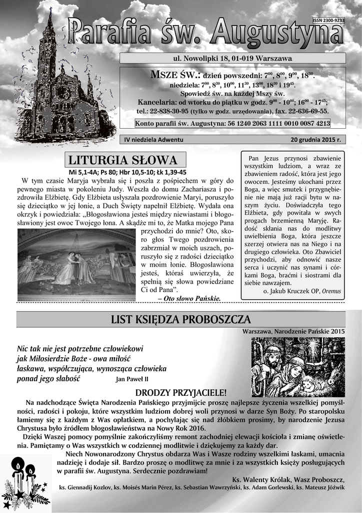 ISSN 2300-9233 ul. Nowolipki 18, 01-019 Warszawa MSZE ŚW.: dzień powszedni: 7 00 , 800, 900, 1830. niedziela: 700, 830, 1000, 1130, 1300, 1830 i 1945. Spowiedź św. na każdej Mszy św. Kancelaria: od wtorku do piątku w godz. 900 - 1000; 1600 - 1745; tel.: 22-838-30-95 (tylko w godz. urzędowania), fax. 22-636-69-55. Konto parafii św. Augustyna: 56 1240 2063 1111 0010 0087 4213 IV niedziela Adwentu LITURGIA SŁOWA Mi 5,1-4A; Ps 80; Hbr 10,5-10; Łk 1,39-45 W tym czasie Maryja wybrała się i poszła z pośpiechem w góry do pewnego miasta w pokoleniu Judy. Weszła do domu Zachariasza i pozdrowiła Elżbietę. Gdy Elżbieta usłyszała pozdrowienie Maryi, poruszyło się dzieciątko w jej łonie, a Duch Święty napełnił Elżbietę. Wydała ona okrzyk i powiedziała: „Błogosławiona jesteś między niewiastami i błogosławiony jest owoc Twojego łona. A skądże mi to, że Matka mojego Pana przychodzi do mnie? Oto, skoro głos Twego pozdrowienia zabrzmiał w moich uszach, poruszyło się z radości dzieciątko w moim łonie. Błogosławiona jesteś, któraś uwierzyła, że spełnią się słowa powiedziane Ci od Pana”. – Oto słowo Pańskie. 20 grudnia 2015 r. Pan Jezus przynosi zbawienie wszystkim ludziom, a wraz ze zbawieniem radość, która jest jego owocem. Jesteśmy ukochani przez Boga, a więc smutek i przygnębienie nie mają już racji bytu w naszym życiu. Doświadczyła tego Elżbieta, gdy powitała w swych progach brzemienną Maryję. Radość skłania nas do modlitwy uwielbienia Boga, która jeszcze szerzej otwiera nas na Niego i na drugiego człowieka. Oto Zbawiciel przychodzi, aby odnowić nasze serca i uczynić nas synami i córkami Boga, braćmi i siostrami dla siebie nawzajem. o. Jakub Kruczek OP, Oremus LIST KSIĘDZA PROBOSZCZA Warszawa, Narodzenie Pańskie 2015 Nic tak nie jest potrzebne człowiekowi jak Miłosierdzie Boże - owa miłość łaskawa, współczująca, wynosząca człowieka ponad jego słabość Jan Paweł II DRODZY PRZYJACIELE! Na nadchodzące Święta Narodzenia Pańskiego przyjmijcie proszę najlepsze życzenia wszelkiej pomyślności, radości i pokoju, które wszystkim ludziom dobrej woli przynosi w darze Syn Boży. Po staropolsku łamiemy się z każdym z Was opłatkiem, a pochylając się nad żłóbkiem prosimy, by narodzenie Jezusa Chrystusa było źródłem błogosławieństwa na Nowy Rok 2016. Dzięki Waszej pomocy pomyślnie zakończyliśmy remont zachodniej elewacji kościoła i zmianę oświetlenia. Pamiętamy o Was wszystkich w codziennej modlitwie i dziękujemy za każdy dar. Niech Nowonarodzony Chrystus obdarza Was i Wasze rodziny wszelkimi łaskami, umacnia nadzieję i dodaje sił. Bardzo proszę o modlitwę za mnie i za wszystkich księży posługujących w parafii św. Augustyna. Serdecznie pozdrawiam! Ks. Walenty Królak, Wasz Proboszcz, ks. Giennadij Kozlov, ks. Moisés Marin Pérez, ks. Sebastian Wawrzyński, ks. Adam Gorlewski, ks. Mateusz Jóźwik PAPIEŻ FRANCISZEK POWIEDZIAŁ (16.12.2016) Drodzy Bracia i Siostry, dzień dobry! W minioną niedzielę zostały otwarte Drzwi Święte w katedrze Rzymu, w bazylice świętego Jana na Lateranie. Otwarte zostały też Drzwi Miłosierdzia w katedrach wszystkich diecezji świata a także w sanktuariach oraz w kościołach, ustanowionych przez biskupów. Jubileusz obchodzony jest na całym świecie, a nie tylko w Rzymie. Pragnąłem, aby ten znak Drzwi Świętych był obecny w każdym Kościele partykularnym, aby Jubileusz Miłosierdzia mógł stać się doświadczeniem, w którym udział może mieć każdy człowiek. W ten sposób Rok Święty został rozpoczęty w całym Kościele i jest obchodzony, podobnie jak w Rzymie. Pierwsze Drzwi Święte, zostały otwarte w sercu Afryki, a Rzym jest widzialnym znakiem powszechnej komunii. Niech ta komunia Kościoła staje się coraz bardziej intensywna, aby Kościół był w świecie żywym znakiem miłości i miłosierdzia Ojca. Tę konieczność chciałem podkreślić również przez datę 8 grudnia, łącząc na przestrzeni 50 lat początek Jubileuszu z zakończeniem Soboru Watykańskiego II. Sobór bowiem rozważał i ukazał Kościół w świetle tajemnicy komunii. Będąc rozsianym po całym świecie i wyrażając się w wielu Kościołach partykularnych jest on zawsze i wyłącznie jedynym Kościołem, jakiego chciał Jezus Chrystus, i za który ofiarował siebie samego. Jest to jeden Kościół, który żyje komunią samego Boga. Ta tajemnica jedności, która czyni Kościół znakiem miłości Ojca, wzrasta i dojrzewa w naszym sercu, kiedy miłość, którą rozpoznajemy w Krzyżu Chrystusa, i w którą się zanurzamy sprawia, że kochamy, tak jak sami przez Niego jesteśmy kochani. Jest to miłość bez końca, która ma oblicze przebaczenia i miłosierdzia. Ale miłosierdzie i przebaczenie nie powinny pozostać tylko ładnymi słowami, ale być realizowane w życiu codziennym. Miłowanie i przebaczenie to konkretny i widzialny znak, że wiara przekształciła nasze serca i pozwala nam wyrażać w nas życie samego Boga. Miłować i przebaczać, tak jak Bóg kocha i przebacza. Jest to program życia, który nie może doznawać przerw lub wyjątków, ale pobudza nas, aby zawsze niestrudzenie szli dalej, będąc pewnymi, że jesteśmy podtrzymywani ojcowską obecnością Boga. Ten wspaniały znak życia chrześcijańskiego przekształca się następnie w wiele innych charakterystycznych znaków Jubileuszu. Myślę o osobach przekraczających jedne z Drzwi Świętych, które w tym roku są prawdziwymi Bramami Miłosierdzia. Brama wskazuje na samego Jezusa, który powiedział: "Ja jestem bramą. Jeżeli ktoś wejdzie przeze Mnie, będzie zbawiony - wejdzie i wyjdzie, i znajdzie paszę" (J 10,9). Przejście przez Drzwi Święte to znak naszej ufności w Pana Jezusa, który nie przyszedł, aby osądzić, ale aby zbawić (por. J 12,47). Uważajcie, aby nie było żadnych spryciarzy czy ludzi nazbyt chytrych, którzy domagaliby s