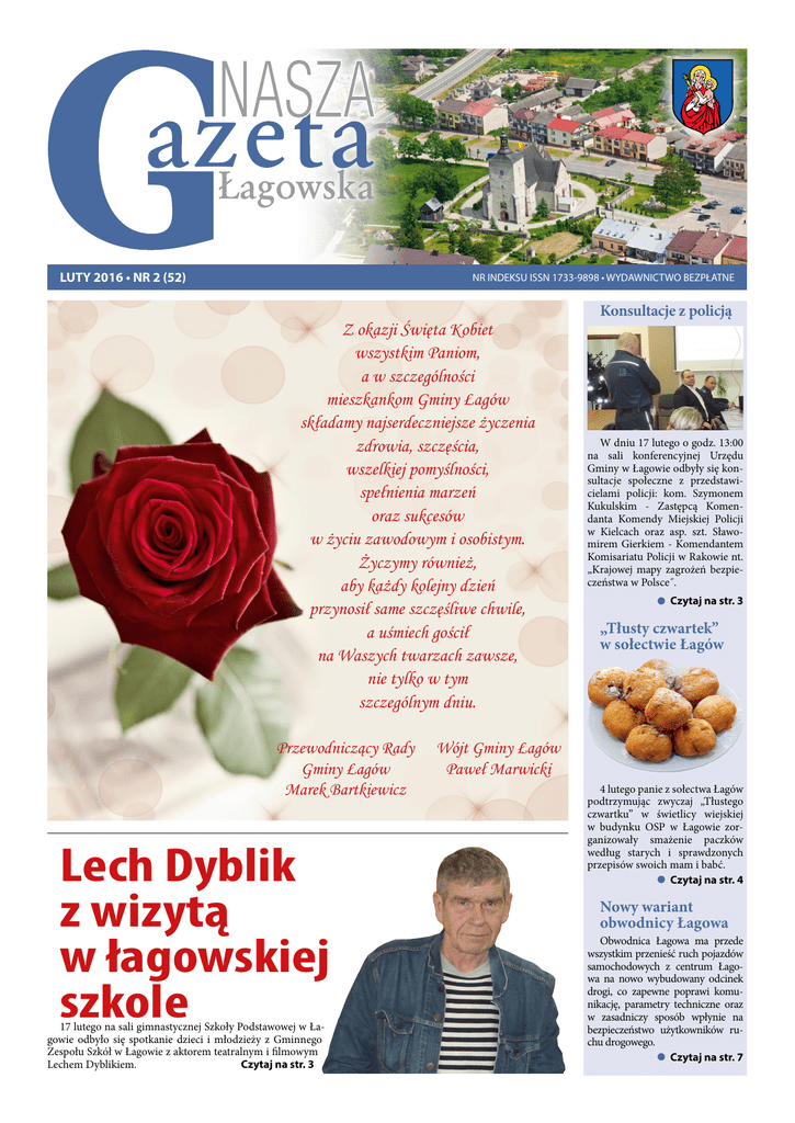 LUTY 2016 • NR 2 (52) NR INDEKSU ISSN 1733-9898 • WYDAWNICTWO BEZPŁATNE Z okazji Święta Kobiet wszystkim Paniom, a w szczególności mieszkankom Gminy Łagów składamy najserdeczniejsze życzenia zdrowia, szczęścia, wszelkiej pomyślności, spełnienia marzeń oraz sukcesów w życiu zawodowym i osobistym. Życzymy również, aby każdy kolejny dzień przynosił same szczęśliwe chwile, a uśmiech gościł na Waszych twarzach zawsze, nie tylko w tym szczególnym dniu. Przewodniczący Rady Gminy Łagów Marek Bartkiewicz Lech Dyblik z wizytą w łagowskiej szkole 17 lutego na sali gimnastycznej Szkoły Podstawowej w Łagowie odbyło się spotkanie dzieci i młodzieży z Gminnego Zespołu Szkół w Łagowie z aktorem teatralnym i filmowym Lechem Dyblikiem. Czytaj na str. 3 Konsultacje z policją W dniu 17 lutego o godz. 13:00 na sali konferencyjnej Urzędu Gminy w Łagowie odbyły się konsultacje społeczne z przedstawicielami policji: kom. Szymonem Kukulskim - Zastępcą Komendanta Komendy Miejskiej Policji w Kielcach oraz asp. szt. Sławomirem Gierkiem - Komendantem Komisariatu Policji w Rakowie nt. „Krajowej mapy zagrożeń bezpieczeństwa w Polsce˝. QQ Czytaj na str. 3 „Tłusty czwartek” w sołectwie Łagów Wójt Gminy Łagów Paweł Marwicki 4 lutego panie z sołectwa Łagów podtrzymując zwyczaj „Tłustego czwartku” w świetlicy wiejskiej w budynku OSP w Łagowie zorganizowały smażenie paczków według starych i sprawdzonych przepisów swoich mam i babć. QQ Czytaj na str. 4 Nowy wariant obwodnicy Łagowa Obwodnica Łagowa ma przede wszystkim przenieść ruch pojazdów samochodowych z centrum Łagowa na nowo wybudowany odcinek drogi, co zapewne poprawi komunikację, parametry techniczne oraz w zasadniczy sposób wpłynie na bezpieczeństwo użytkowników ruchu drogowego. QQ Czytaj na str. 7 Strona 2 LUTY 2016 R. / NASZA GAZETA ŁAGOWSKA Znany aktor Lech Dyblik z wizytą w łagowskiej szkole 17 lutego na sali gimnastycznej Szkoły Podstawowej w Łagowie odbyło się spotkanie dzieci i młodzieży z Gminnego Zespołu Szkół w Łagowie z aktorem teatralnym i filmowym Lechem Dyblikiem. Artysta wystąpił ze swoim projektem edukacyjno – artystycznym pn. „Kuszenie śmierci”. To opowieść o jego uzależnieniu od alkoholu i walce jaką stoczył, aby wyjść z nałogu. Przez swoje doświadczenie zwraca uwagę młodym ludziom na to w jaki sposób bardzo łatwo można wpaść w uzależnienie nie tylko od alkoholu, ale i narkotyków, dopalaczy czy nawet internetu. Zawsze podkreśla fakt, iż droga do nałogu jest bardzo podobna w każdym z powyższych przypadków. Dlatego przez swoje występy w wielu placówkach oświatowych promuje wśród młodzieży profilaktykę w dziedzinie uzależnień (zachowania antyalkoholowe i antynarkotykowe), lansuje zdrowy styl życia, nakreśla właściwy stosunek do otaczającego nas świata. Lech Dyblik dzięki prostocie wypowiedzi i autentyczności przedstawianych relacji, sprawia że najważniejsze informacje docierają do odbiorców w sposób szybki i skuteczny. Ma to kolosalne znaczenie szczególnie w przypadku edukacji dzieci i młodzieży. Dlatego też licznie zebrani uczniowie ze szkoły podstawowej, gimnazjum i zasadniczej szkoły zawodowej z Łagowa wysłu- QQ Dyrektor GZS w Łagowie witający znamienitego gościa chali jego historii z uwagą i zaciekawieniem. Na koniec występu każdy mógł zdobyć autograf i zrobić sobie zdjęcie z artystą. Sądząc po reakcjach uczestników, tego typu przedsięwzięcie spotyka się z bardzo pozytywnymi reakcjami i opiniami. Takie spotkania z autentycznymi ludźmi o bogatej przeszłości pomagają szczególnie młodym ludziom odnaleźć się w realnym życiu i uczą odpowiednio reagować na konkretne problemy. Serdeczne podziękowania dla Pani Eweliny Łaty - Przewodniczącej Gminnej Komisji Rozwiązywania Problemów Alkoholowych oraz całej komisji za pomoc i wsparcie w organizacji wizyty Lecha Dybika. /A.S./ QQ Aktor chętnie pozował do zdjęć wraz z uczniami ze szkoły w Łagowie bezpłatny miesięcznik samorządowy gminy Łagów Wydawca: Urząd Gminy w Łagowie, ul. Rynek 62, 26-025 Łagów tel. 41-343-70-54 Redaktor naczelny: Anna Kędziora [email protected] Druk: ART-SERWIS, tel. 513-01-04-04 Nakład: 1500 egz. Redakcja nie ponosi odpowiedzialności za treść reklam i ogłoszeń, nie zwraca nie zamówionych ma teriałów oraz zastrzega sobie prawo do ingerencji w nadesłane teksty. QQ Licznie zebrana młodzież z uwagą wysłuchała programu Lecha Dyblika Strona 3 NASZA GAZETA ŁAGOWSKA \ LUTY 2016 R. Konsultacje społeczne z policją nt. „Krajowej mapy zagrożeń bezpieczeństwa w Polsce” W dniu 17 lutego o godz. 13:00 na sali konferencyjnej Urzędu Gminy w Łagowie odbyły się konsultacje społeczne z przedstawicielami policji: kom. Szymonem Kukulskim - Zastępcą Komendanta Komendy Miejskiej Policji w Kielcach oraz asp. szt. Sławomirem Gierkiem - Komendantem Komisariatu Policji w Rakowie nt. „Krajowej mapy zagrożeń bezpieczeństwa w Polsce˝. Policjanci podzielili spotkanie na odpowiednie działy: - bezpieczeństwo publiczne w lokalnym społeczeństwie; -rola podmiotów poza policyjnych na rzecz bezpieczeństwa i porządku publicznego; -mapa zagrożeń- rola i zadania; -różnice w budowaniu map zagrożeń w lokalnym społeczeństwie; -badania społeczne jako element diagnozowania zagrożeń na poziomie miasta, powiatu i gminy. - analiza zaistniałych i planowanych zmian w poszczególnych obszarach mapy zagrożeń jako determinant właściwego zarządzania bezpieczeństwem; -mapa zagrożeń w zarządzaniu bezpieczeństwem w ruchu drogowym. Przy każdym zagadnieniu odbywała się merytoryczna dyskusja, z której wypływały rzeczowe wnioski. Będą one zapewne cenne dla wszystkich uczestników konsultacji i pomogą poprawić nasze wspólne bezpieczeństwo. /A.S./ QQ Policjanci podczas omawiania jednego z zagadnień Szkolenie Pszczelarzy W dniu 30.01.2016r. w re