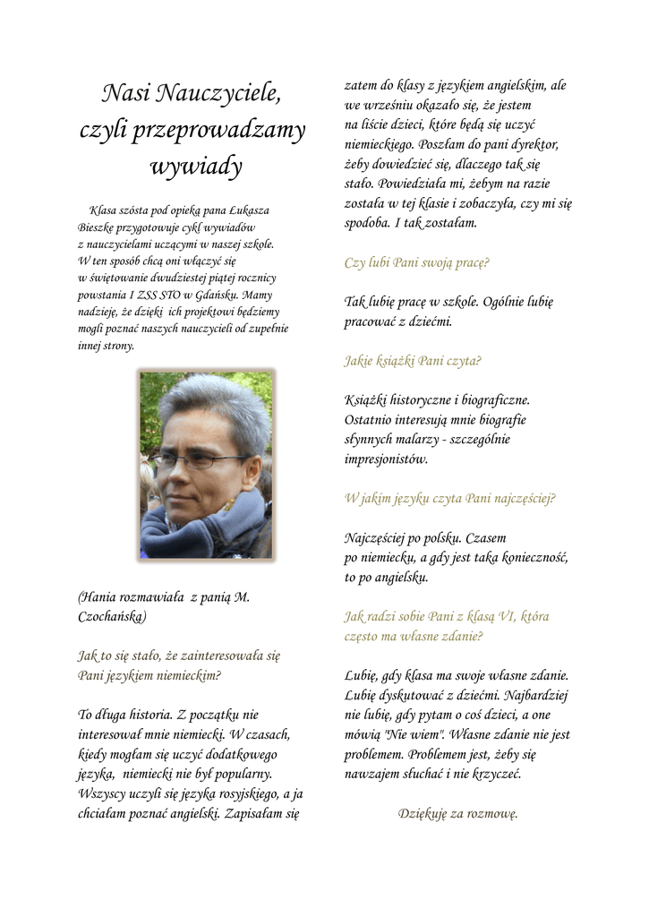 Nasi Nauczyciele, czyli przeprowadzamy wywiady Klasa szósta pod opieką pana Łukasza Bieszke przygotowuje cykl wywiadów z nauczycielami uczącymi w naszej szkole. W ten sposób chcą oni włączyć się w świętowanie dwudziestej piątej rocznicy powstania I ZSS STO w Gdańsku. Mamy nadzieję, że dzięki ich projektowi będziemy mogli poznać naszych nauczycieli od zupełnie innej strony. zatem do klasy z językiem angielskim, ale we wrześniu okazało się, że jestem na liście dzieci, które będą się uczyć niemieckiego. Poszłam do pani dyrektor, żeby dowiedzieć się, dlaczego tak się stało. Powiedziała mi, żebym na razie została w tej klasie i zobaczyła, czy mi się spodoba. I tak zostałam. Czy lubi Pani swoją pracę? Tak lubię pracę w szkole. Ogólnie lubię pracować z dziećmi. Jakie książki Pani czyta? Książki historyczne i biograficzne. Ostatnio interesują mnie biografie słynnych malarzy - szczególnie impresjonistów. W jakim języku czyta Pani najczęściej? Najczęściej po polsku. Czasem po niemiecku, a gdy jest taka konieczność, to po angielsku. (Hania rozmawiała z panią M. Czochańską) Jak to się stało, że zainteresowała się Pani językiem niemieckim? To długa historia. Z początku nie interesował mnie niemiecki. W czasach, kiedy mogłam się uczyć dodatkowego języka, niemiecki nie był popularny. Wszyscy uczyli się języka rosyjskiego, a ja chciałam poznać angielski. Zapisałam się Jak radzi sobie Pani z klasą VI, która często ma własne zdanie? Lubię, gdy klasa ma swoje własne zdanie. Lubię dyskutować z dziećmi. Najbardziej nie lubię, gdy pytam o coś dzieci, a one mówią "Nie wiem". Własne zdanie nie jest problemem. Problemem jest, żeby się nawzajem słuchać i nie krzyczeć. Dziękuję za rozmowę. Do jakich miejsc chciałaby Pani pojechać? Z miejsc, w których już byłam, bardzo lubię Londyn. Chciałabym odwiedzić Kretę, Maltę lub popłynąć statkiem po Nilu. Dziękuję za rozmowę. (Jaś Rybak rozmawiał z panią Grażyną Niemyjską) Czekamy na kolejne wywiady. Czy w szkole była Pani dobrą uczennicą? Premiera „Śpiąca królewny” Tak, byłam dobrą uczennicą. Lubiłam się uczyć. Czemu zajęła się Pani zawodowo historią? Studiowałam archeologię i myślę, że to było moje powołanie. W związku z koniecznością opiekowania się dwiema córkami, nie mogłam tego kontynuować nauczycielem zostałam zatem nieco z przypadku. 14 października 2014 r. w restauracji „Classic”, w Oliwie odegrano specjalnie dla pracowników naszej szkoły sztukę na motywach znanej baśni Braci Grimm. Reżyserem spektaklu i odtwórczynią jednej z ról była pani od matematyki i jednocześnie wychowawczyni I klasy gimnazjum. Jakie są Pani ulubione okresy historyczne? Kiedyś było to średniowiecze - teraz okres przed wybuchem I wojny światowej. Czy zdarza się Pani nie znać odpowiedzi na pytania uczniów? Co Pani wtedy robi? Każdemu się czasem zdarza. Ważne, żeby wiedzieć, gdzie sprawdzić. Zabawne dialogi, świetna charakteryzacja i kostiumy, zaangażowanie i powaga aktorów sprawiły, że to wydarzenie kulturalne przygotowane specjalnie z okazji Święta Edukacji Narodowej na długo pozostanie w pamięci widzów. (red.)