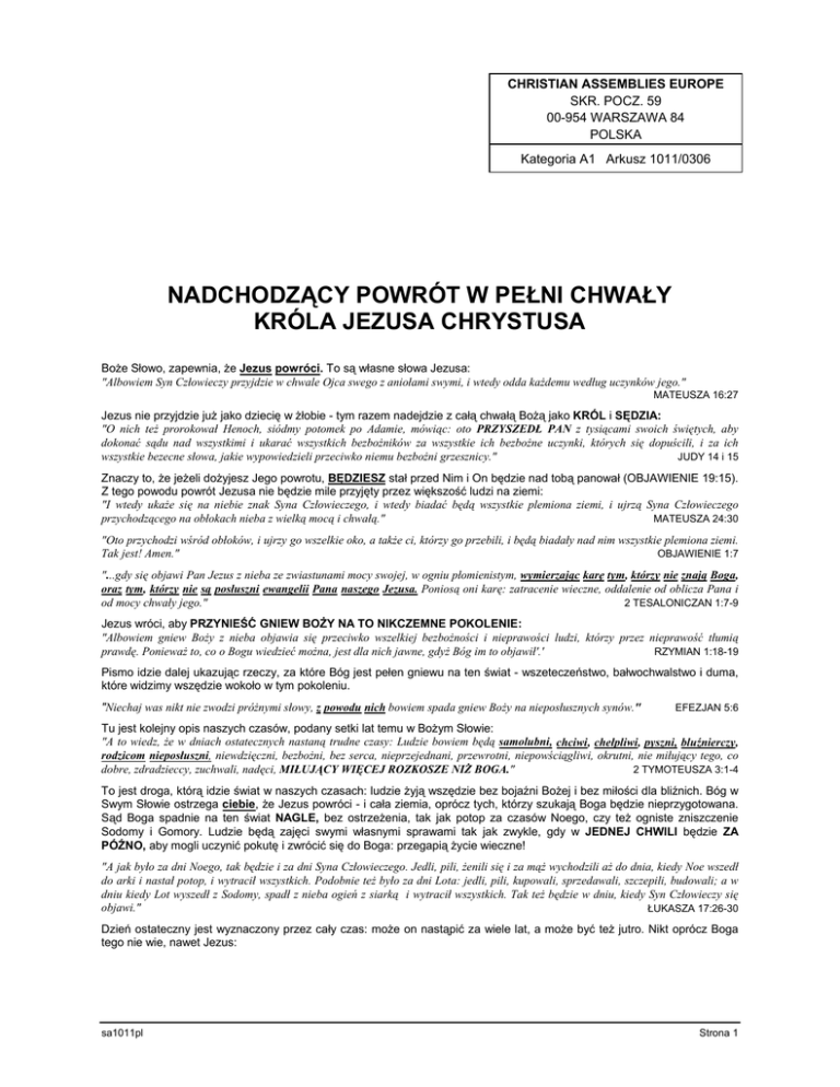 CHRISTIAN ASSEMBLIES EUROPE SKR. POCZ. 59 00-954 WARSZAWA 84 POLSKA Kategoria A1 Arkusz 1011/0306 NADCHODZĄCY POWRÓT W PEŁNI CHWAŁY KRÓLA JEZUSA CHRYSTUSA Boże Słowo, zapewnia, że Jezus powróci. To są własne słowa Jezusa: "Albowiem Syn Człowieczy przyjdzie w chwale Ojca swego z aniołami swymi, i wtedy odda każdemu według uczynków jego." MATEUSZA 16:27 Jezus nie przyjdzie już jako dziecię w żłobie - tym razem nadejdzie z całą chwałą Bożą jako KRÓL i SĘDZIA: "O nich też prorokował Henoch, siódmy potomek po Adamie, mówiąc: oto PRZYSZEDŁ PAN z tysiącami swoich świętych, aby dokonać sądu nad wszystkimi i ukarać wszystkich bezbożników za wszystkie ich bezbożne uczynki, których się dopuścili, i za ich JUDY 14 i 15 wszystkie bezecne słowa, jakie wypowiedzieli przeciwko niemu bezbożni grzesznicy." Znaczy to, że jeżeli dożyjesz Jego powrotu, BĘDZIESZ stał przed Nim i On będzie nad tobą panował (OBJAWIENIE 19:15). Z tego powodu powrót Jezusa nie będzie mile przyjęty przez większość ludzi na ziemi: "I wtedy ukaże się na niebie znak Syna Człowieczego, i wtedy biadać będą wszystkie plemiona ziemi, i ujrzą Syna Człowieczego MATEUSZA 24:30 przychodzącego na obłokach nieba z wielką mocą i chwałą." "Oto przychodzi wśród obłoków, i ujrzy go wszelkie oko, a także ci, którzy go przebili, i będą biadały nad nim wszystkie plemiona ziemi. OBJAWIENIE 1:7 Tak jest! Amen." "...gdy się objawi Pan Jezus z nieba ze zwiastunami mocy swojej, w ogniu płomienistym, wymierzając karę tym, którzy nie znają Boga, oraz tym, którzy nie są posłuszni ewangelii Pana naszego Jezusa. Poniosą oni karę: zatracenie wieczne, oddalenie od oblicza Pana i 2 TESALONICZAN 1:7-9 od mocy chwały jego." Jezus wróci, aby PRZYNIEŚĆ GNIEW BOŻY NA TO NIKCZEMNE POKOLENIE: "Albowiem gniew Boży z nieba objawia się przeciwko wszelkiej bezbożności i nieprawości ludzi, którzy przez nieprawość tłumią RZYMIAN 1:18-19 prawdę. Ponieważ to, co o Bogu wiedzieć można, jest dla nich jawne, gdyż Bóg im to objawił'.' Pismo idzie dalej ukazując rzeczy, za które Bóg jest pełen gniewu na ten świat - wszeteczeństwo, bałwochwalstwo i duma, które widzimy wszędzie wokoło w tym pokoleniu. "Niechaj was nikt nie zwodzi próżnymi słowy, z powodu nich bowiem spada gniew Boży na nieposłusznych synów." EFEZJAN 5:6 Tu jest kolejny opis naszych czasów, podany setki lat temu w Bożym Słowie: "A to wiedz, że w dniach ostatecznych nastaną trudne czasy: Ludzie bowiem będą samolubni, chciwi, chełpliwi, pyszni, bluźnierczy, rodzicom nieposłuszni, niewdzięczni, bezbożni, bez serca, nieprzejednani, przewrotni, niepowściągliwi, okrutni, nie miłujący tego, co 2 TYMOTEUSZA 3:1-4 dobre, zdradzieccy, zuchwali, nadęci, MIŁUJĄCY WIĘCEJ ROZKOSZE NIŻ BOGA." To jest droga, którą idzie świat w naszych czasach: ludzie żyją wszędzie bez bojaźni Bożej i bez miłości dla bliźnich. Bóg w Swym Słowie ostrzega ciebie, że Jezus powróci - i cała ziemia, oprócz tych, którzy szukają Boga będzie nieprzygotowana. Sąd Boga spadnie na ten świat NAGLE, bez ostrzeżenia, tak jak potop za czasów Noego, czy też ogniste zniszczenie Sodomy i Gomory. Ludzie będą zajęci swymi własnymi sprawami tak jak zwykle, gdy w JEDNEJ CHWILI będzie ZA PÓŹNO, aby mogli uczynić pokutę i zwrócić się do Boga: przegapią życie wieczne! "A jak było za dni Noego, tak będzie i za dni Syna Człowieczego. Jedli, pili, żenili się i za mąż wychodzili aż do dnia, kiedy Noe wszedł do arki i nastał potop, i wytracił wszystkich. Podobnie też było za dni Lota: jedli, pili, kupowali, sprzedawali, szczepili, budowali; a w dniu kiedy Lot wyszedł z Sodomy, spadł z nieba ogień z siarką i wytracił wszystkich. Tak też będzie w dniu, kiedy Syn Człowieczy się objawi." ŁUKASZA 17:26-30 Dzień ostateczny jest wyznaczony przez cały czas: może on nastąpić za wiele lat, a może być też jutro. Nikt oprócz Boga tego nie wie, nawet Jezus: sa1011pl Strona 1 Kategoria A1 "NADCHODZĄCY POWRÓT W PEŁNI CHWAŁY KRÓLA JEZUSA CHRYSTUSA" "Ale o tym dniu i godzinie nikt nie wie: ani aniołowie w niebie, ani Syn, tylko Ojciec." MARKA 13:32 Znaczy to, że do ostatniej chwili nie możesz lekceważyć swego zbawienia, gdyż nie znasz dnia, ani godziny - nie wiesz nawet, czy wcześniej nie umrzesz. Są teraz znaki na ziemi, które ostrzegają nas przed powrotem Jezusa: "I ukażę znaki na niebie i na ziemi, krew, ogień i słupy (w hebrajskim 'drzewa palmowe') dymu. Słońce przemieni się w ciemność, a JOELA 3:3-4 księżyc w krew, zanim przyjdzie ów wielki, straszny dzień PANA." Minęło niewiele ponad pięćdziesiąt lat odkąd pierwsze chmury dymu w formie 'grzyba', czy też 'drzewa palmowego' pojawiły się na ziemi. Od tamtego czasu, cały świat stoi na krawędzi katastrofy: w każdej chwili cała ludzkość naszej planety może zostać unicestwiona. Oto parę innych pism mówiących o tym co się wydarzy, w ten czy inny sposób: "Bo oto nadchodzi dzień, który PALI JAK PIEC. Wtedy wszyscy zuchwali i wszyscy, którzy czynią zło, STANĄ SIĘ CIERNIEM ..." MALACHIASZA 3:19 "A dzień Pański nadejdzie jak złodziej; wtedy niebiosa z trzaskiem przeminą, a ŻYWIOŁY ROZPALONE STOPNIEJĄ, ziemia i dzieła 2 PIOTRA 3:10 ludzkie na niej spłoną." "Zabitych przez PANA będzie w owym dniu od krańca ziemi po kraniec; nie będzie się ich opłakiwać ani zbierać, ani grzebać, będą jako gnój na roli. " JEREMIASZA 25:33 "A taka będzie plaga, jaką PAN dotknie wszystkie ludy, które wystąpiły zbrojnie przeciwko Jeruzalemowi: ciało każdego kto stoi jeszcze na nogach, będzie gnić, jego oczy będą gnić w oczodołach, a język zgnije w jego ustach." ZACHARIASZA 14:12 "Wkoło zatacza się ziemia jak pijany i kołysze się jak budka nocna. Zaciążyło na niej jej przestępstwo, tak że upadnie i już nie IZAJASZA 24:20 powstanie." Ludzie zawsze chcą wi