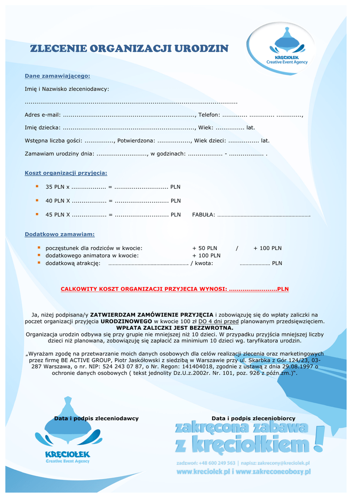 ZLECENIE ORGANIZACJI URODZIN Dane zamawiającego: Imię i Nazwisko zleceniodawcy: .............................................................................................................. Adres e-mail: ...................................................................., Telefon: ............. ............. ............., Imię dziecka: ...................................................................., Wiek: ............... lat. Wstępna liczba gości: ..............., Potwierdzona: ................., Wiek dzieci: ................ lat. Zamawiam urodziny dnia: .........................., w godzinach: .................. - .................. . Koszt organizacji przyjęcia: § 35 PLN x .................. = ............................ PLN § 40 PLN X .................. = ............................ PLN § 45 PLN X .................. = ............................ PLN FABUŁA: ………………………………………………………. Dodatkowo zamawiam: § § § poczęstunek dla rodziców w kwocie: + 50 PLN dodatkowego animatora w kwocie: + 100 PLN dodatkową atrakcję: ………………………………………………. / kwota: / + 100 PLN ………………… PLN CALKOWITY KOSZT ORGANIZACJI PRZYJECIA WYNOSI: .........................PLN Ja, niżej podpisana/y ZATWIERDZAM ZAMÓWIENIE PRZYJĘCIA i zobowiązuję się do wpłaty zaliczki na poczet organizacji przyjęcia URODZINOWEGO w kwocie 100 zł DO 4 dni przed planowanym przedsięwzięciem. WPŁATA ZALICZKI JEST BEZZWROTNA. Organizacja urodzin odbywa się przy grupie nie mniejszej niż 10 dzieci. W przypadku przyjścia mniejszej liczby dzieci niż planowana, zobowiązuję się zapłacić za minimium 10 dzieci wg. taryfikatora urodzin. „Wyrażam zgodę na przetwarzanie moich danych osobowych dla celów realizacji zlecenia oraz marketingowych przez firmę BE ACTIVE GROUP, Piotr Jaskółowski z siedzibą w Warszawie przy ul. Skarbka z Gór 124/23, 03287 Warszawa, o nr. NIP: 524 243 07 87, o Nr. Regon: 141404018, zgodnie z ustawą z dnia 29.08.1997 o ochronie danych osobowych ( tekst jednolity Dz.U.z.2002r. Nr. 101, poz. 926 z późn.zm.)“. Data i podpis zleceniodawcy Data i podpis zleceniobiorcy 1