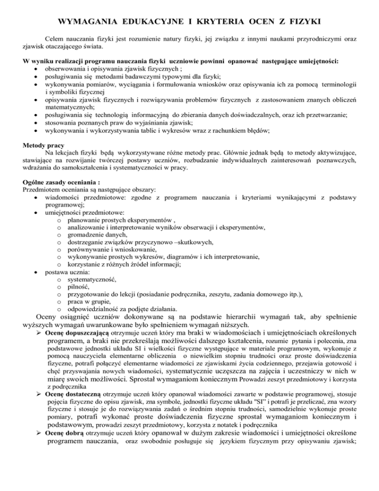 WYMAGANIA EDUKACYJNE I KRYTERIA OCEN Z FIZYKI Celem nauczania fizyki jest rozumienie natury fizyki, jej związku z innymi naukami przyrodniczymi oraz zjawisk otaczającego świata. W wyniku realizacji programu nauczania fizyki uczniowie powinni opanować następujące umiejętności: obserwowania i opisywania zjawisk fizycznych ; posługiwania się metodami badawczymi typowymi dla fizyki; wykonywania pomiarów, wyciągania i formułowania wniosków oraz opisywania ich za pomocą terminologii i symboliki fizycznej opisywania zjawisk fizycznych i rozwiązywania problemów fizycznych z zastosowaniem znanych obliczeń matematycznych; posługiwania się technologią informacyjną do zbierania danych doświadczalnych, oraz ich przetwarzanie; stosowania poznanych praw do wyjaśniania zjawisk; wykonywania i wykorzystywania tablic i wykresów wraz z rachunkiem błędów; Metody pracy Na lekcjach fizyki będą wykorzystywane różne metody prac. Głównie jednak będą to metody aktywizujące, stawiające na rozwijanie twórczej postawy uczniów, rozbudzanie indywidualnych zainteresowań poznawczych, wdrażania do samokształcenia i systematyczności w pracy. Ogólne zasady oceniania : Przedmiotem oceniania są następujące obszary: wiadomości przedmiotowe: zgodne z programem nauczania i kryteriami wynikającymi z podstawy programowej; umiejętności przedmiotowe: o planowanie prostych eksperymentów , o analizowanie i interpretowanie wyników obserwacji i eksperymentów, o gromadzenie danych, o dostrzeganie związków przyczynowo –skutkowych, o porównywanie i wnioskowanie, o wykonywanie prostych wykresów, diagramów i ich interpretowanie, o korzystanie z różnych źródeł informacji; postawa ucznia: o systematyczność, o pilność, o przygotowanie do lekcji (posiadanie podręcznika, zeszytu, zadania domowego itp.), o praca w grupie, o odpowiedzialność za podjęte działania. Oceny osiągnięć uczniów dokonywane są na podstawie hierarchii wymagań tak, aby spełnienie wyższych wymagań uwarunkowane było spełnieniem wymagań niższych. Ocenę dopuszczającą otrzymuje uczeń który ma braki w wiadomościach i umiejętnościach określonych programem, a braki nie przekreślają możliwości dalszego kształcenia, rozumie pytania i polecenia, zna podstawowe jednostki układu SI i wielkości fizyczne występujące w materiale programowym, wykonuje z pomocą nauczyciela elementarne obliczenia o niewielkim stopniu trudności oraz proste doświadczenia fizyczne, potrafi połączyć elementarne wiadomości ze zjawiskami życia codziennego, przejawia gotowość i chęć przyswajania nowych wiadomości, systematycznie uczęszcza na zajęcia i uczestniczy w nich w miarę swoich możliwości. Sprostał wymaganiom koniecznym Prowadzi zeszyt przedmiotowy i korzysta z podręcznika Ocenę dostateczną otrzymuje uczeń który opanował wiadomości zawarte w podstawie programowej, stosuje pojęcia fizyczne do opisu zjawisk, zna symbole, jednostki fizyczne układu "SI” i potrafi je przeliczać, zna wzory fizyczne i stosuje je do rozwiązywania zadań o średnim stopniu trudności, samodzielnie wykonuje proste pomiary, potrafi wykonać proste doświadczenia fizyczne sprostał wymaganiom koniecznym i podstawowym, prowadzi zeszyt przedmiotowy, korzysta z notatek i podręcznika Ocenę dobrą otrzymuje uczeń który opanował w dużym zakresie wiadomości i umiejętności określone programem nauczania, oraz swobodnie posługuje się językiem fizycznym przy opisywaniu zjawisk; wyjaśnia i porównuje związki między poszczególnymi wielkościami fizycznymi, wykonuje pomiary, korzysta z tabel i wykresów, stosuje poznane wzory i prawa w typowych sytuacjach zadaniowych, potrafi wykonać zaplanowane doświadczenie z fizyki, rozwiązywać problemy, sprostał wymaganiom na niższe oceny. Prowadzi zeszyt przedmiotowy, korzysta z notatek, podręcznika i dodatkowych lektur Ocenę bardzo dobrą otrzymuje uczeń który w wysokim stopniu opanował treści programowe oraz swobodnie posługuje się terminologią fizyczną ; zdobytą wiedzę stosuje w nowych sytuacjach, na podstawie tabeli pomiarowej potrafi sporządzić wykresy i przeprowadzić analizę sytuacji, opisuje zjawiska fizyczne i rozwiązuje problemy, przeprowadza i analizuje doświadczenia, proponuje różne metody rozwiązań sytuacji zadaniowych, potrafi poprawnie rozumować w kategoriach przyczynowo – skutkowych wykorzystując wiedzę przewidzianą w podstawie programowej, wykorzystuje poznane prawa fizyczne do interpretacji przy rozwiązywaniu zadań obliczeniowych i problemowych, prowadzi zeszyt przedmiotowy, korzysta z podręcznika, dodatkowych źródeł informacji i lektury Ocenę celującą otrzymuje uczeń który potrafi stosować wiadomości w sytuacjach nietypowych (problemowych), umie formułować problemy i dokonuje analizy lub syntezy nowych zjawisk, biegle rozwiązuje w sposób nietypowy zadania i problemy o podwyższonym stopniu trudności, potrafi udowodnić swoje zdanie używając przekonywującej argumentacji, będącej skutkiem samodzielnie nabytej wiedzy, osiąga sukcesy w konkursach poza szkolnych ( na szczeblu rejonowym i wojewódzkim ), doskonale posługuje się terminologią fizyczną, zna nowe osiągnięcia z zakresu fizyki, sprostał wymaganiom na niższe oceny. Rozwija swoje zainteresowania, Narzędzia sprawdzania wiedzy i umiejętności ucznia obejmują : odpowiedzi ustne - obowiązuje materiał z trzech ostatnich lekcji, w przypadku zapowiedzianych powtórek z całego działu, kartkówki z bieżącego materiału / do 3 lekcji wstecz /, pisemne sprawdziany po każdej zamkniętej partii materiału –zapowiadane przynajmniej z tygodniowym wyprzedzeniem, prace domowe – wyrywkowo, praca i aktywność indywidualna na lekcji, prace nadobowiązkowe zlecane przez nauczyciela ( np. przygotowanie referatu, prezentacji ), w przypadku pracy w grupie wszyscy uzyskują taką samą ocenę cyfrową. Prace klasowe (sprawdziany) – są