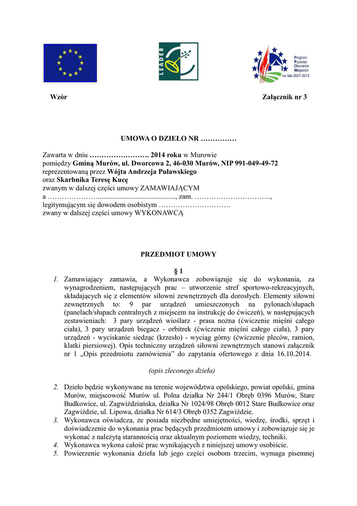 Wzór Załącznik nr 3 UMOWA O DZIEŁO NR …………… Zawarta w dniu ……………………. 2014 roku w Murowie pomiędzy Gminą Murów, ul. Dworcowa 2, 46-030 Murów, NIP 991-049-49-72 reprezentowaną przez Wójta Andrzeja Puławskiego oraz Skarbnika Teresę Kucę zwanym w dalszej części umowy ZAMAWIAJĄCYM a …………………..........................................., zam. ………………………….., legitymującym się dowodem osobistym ………………………… zwany w dalszej części umowy WYKONAWCĄ PRZEDMIOT UMOWY §1 1. Zamawiający zamawia, a Wykonawca zobowiązuje się do wykonania, za wynagrodzeniem, następujących prac – utworzenie stref sportowo-rekreacyjnych, składających się z elementów siłowni zewnętrznych dla dorosłych. Elementy siłowni zewnętrznych to: 9 par urządzeń umieszczonych na pylonach/słupach (panelach/słupach centralnych z miejscem na instrukcję do ćwiczeń), w następujących zestawieniach: 3 pary urządzeń wioślarz - prasa nożna (ćwiczenie mięśni całego ciała), 3 pary urządzeń biegacz - orbitrek (ćwiczenie mięśni całego ciała), 3 pary urządzeń - wyciskanie siedząc (krzesło) - wyciąg górny (ćwiczenie pleców, ramion, klatki piersiowej). Opis techniczny urządzeń siłowni zewnętrznych stanowi załącznik nr 1 „Opis przedmiotu zamówienia” do zapytania ofertowego z dnia 16.10.2014. (opis zleconego dzieła) 2. Dzieło będzie wykonywane na terenie województwa opolskiego, powiat opolski, gmina Murów, miejscowość Murów ul. Polna działka Nr 244/1 Obręb 0396 Murów, Stare Budkowice, ul. Zagwiździańska, działka Nr 1024/98 Obręb 0012 Stare Budkowice oraz Zagwiździe, ul. Lipowa, działka Nr 614/3 Obręb 0352 Zagwiździe. 3. Wykonawca oświadcza, że posiada niezbędne umiejętności, wiedzę, środki, sprzęt i doświadczenie do wykonania prac będących przedmiotem umowy i zobowiązuje się je wykonać z należytą starannością oraz aktualnym poziomem wiedzy, techniki. 4. Wykonawca wykona całość prac wynikających z niniejszej umowy osobiście. 5. Powierzenie wykonania dzieła lub jego części osobom trzecim, wymaga pisemnej zgody Zamawiającego. TERMIN I SPOSÓB WYKONANIA UMOWY oraz PRAWA I OBOWIĄZKI STRON §2 Prace określone w § 1 ust. 1 niniejszej umowy Wykonawca zobowiązuje się wykonać w terminie od dnia …………………………. roku do dnia …………………………. roku. §3 Wykonawca zaopatruje się we wszelkie materiały potrzebne do wykonania przedmiotowej umowy. Koszt zakupu tych materiałów, jak również opłat i świadczeń niezbędnych dla wykonania umowy jest uwzględniony w kwocie wynagrodzenia za wykonanie dzieła. §4 1. Przekazanie wykonanego zgodnie z niniejszą umową dzieła nastąpi poprzez zgłoszenie Zamawiającemu zakończenia prac i umożliwienia protokolarnego odbioru dzieła. 2. Zamawiający dokona odbioru prac w terminie 7 dni od zgłoszenia dzieła do odbioru przez Wykonawcę lub w przypadku odbiorów częściowych odpowiedniej jego części. Odbiór stwierdza się protokołem, z zaznaczeniem że dzieło przyjmowane jest bez zastrzeżeń. Gdy dzieło zawiera wady uniemożliwiające normalne korzystanie z niego, Zamawiający złoży na piśmie zastrzeżenia i odmówi odbioru. 3. Jeżeli dzieło zawiera wady, nie uniemożliwiające korzystania z niego, ale wymagające uzupełnień i poprawek, Zamawiający wzywa na piśmie Wykonawcę do usunięcia wad wyznaczając w tym celu Wykonawcy stosowny termin. 4. Jeśli wady dają się usunąć Wykonawca zobowiązuje się wykonać niezbędne prace celem usunięcia wad dzieła w wyznaczonym przez Zamawiającego terminie, bez prawa żądania dodatkowego wynagrodzenia za te czynności. Usunięcie wad w wyznaczonym terminie, powoduje, że Zamawiający dokonuje odbioru dzieła w trybie ust. 2 zd. 1 i 2. 5. Jeśli wady są tego rodzaju, że nie dają się usunąć poprzez wykonanie dodatkowych prac, Zamawiający może według własnego wyboru żądać odpowiedniego obniżenia wynagrodzenia, jeżeli wady nie uniemożliwiają korzystanie z przedmiotu dzieła; zaś w przypadku wad uniemożliwiających skorzystanie z przedmiotu dzieła odstąpić od umowy albo żądać ponownego wykonania umowy, bez prawa do dodatkowego wynagrodzenia. 1. 2. §5 Za niewykonanie lub nienależyte wykonanie zobowiązań niepieniężnych wynikających z niniejszej umowy strony zastrzegają kary umowne. Kara umowna należy się Zamawiającemu od Wykonawcy w przypadku: a) opóźnienia w wykonaniu prac wynikających z umowy, opóźnienia w usuwaniu wad, w wysokości 1% kwoty wynagrodzenia umownego brutto za każdy dzień opóźnienia; 3. 4. 5. b) w przypadku niewykonania prac, odmowy usunięcia wad lub odstąpienia od umowy z przyczyn za które odpowiedzialność ponosi Wykonawca, w wysokości 10%wynagrodzenia umownego brutto. Kara umowna należy się Wykonawcy od Zamawiającego w przypadku: a) opóźnienia w odbiorze częściowym lub ostatecznym prac, w wysokości 1% wynagrodzenia umownego brutto za każdy dzień opóźnienia; b) w przypadku odstąpienia od umowy z przyczyn za które odpowiedzialność ponosi Zamawiający, w wysokości 10% wynagrodzenia brutto. Strony zastrzegają sobie możliwość żądania i dochodzenia odszkodowania przewyższającego wysokość zastrzeżonych kar umownych, w razie zaistnienia wyższej niż wielkość kary umownej szkody rzeczywistej. Strony nie odpowiadają za niewykonanie lub nienależyte wykonanie umowy, jeżeli jest to spowodowane siłą wyższą. Dla celów niniejszej umowy siłą wyższą jest zdarzenie nadzwyczajne, zewnętrzne i niemożliwe do zapobieżenia i przewidzenia. WYNAGRODZENIE §6 1. Za wykonanie dzieła określonego w § 1 ust. 1 niniejszej umowy Zamawiający zobowiązuje się zapłacić Wykonawcy wynagrodzenie ryczałtowe w kwocie …………. złotych brutto (słownie: ………………….. złotych). 2. Wynagrodzenie obejmuje uzasadniony nakład pracy Wykonawcy or