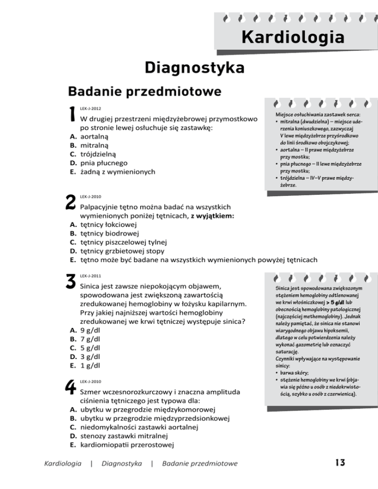 Kardiologia Diagnostyka Badanie przedmiotowe 1 Wpodrugiej przestrzeni międzyżebrowej przymostkowo stronie lewej osłuchuje się zastawkę: LEK-J-2012 A. B. C. D. E. aortalną mitralną trójdzielną pnia płucnego żadną z wymienionych Miejsce osłuchiwania zastawek serca: • mitralna(dwudzielna)–miejsceuderzenia koniuszkowego, zazwyczaj V lewemiędzyżebrzeprzyśrodkowo doliniiśrodkowoobojczykowej; • aortalna–II prawemiędzyżebrze przymostku; • pniapłucnego–II lewemiędzyżebrze przymostku; • trójdzielna–IV–V prawemiędzy żebrze. 2 Palpacyjnie tętno można badać na wszystkich wymienionych poniżej tętnicach, z wyjątkiem: LEK-J-2010 A. B. C. D. E. tętnicy łokciowej tętnicy biodrowej tętnicy piszczelowej tylnej tętnicy grzbietowej stopy tętno może być badane na wszystkich wymienionych powyżej tętnicach 3 Sinica jest zawsze niepokojącym objawem, spowodowana jest zwiększoną zawartością LEK-J-2011 A. B. C. D. E. zredukowanej hemoglobiny w łożysku kapilarnym. Przy jakiej najniższej wartości hemoglobiny zredukowanej we krwi tętniczej występuje sinica? 9 g/dl 7 g/dl 5 g/dl 3 g/dl 1 g/dl 4 Szmer wczesnorozkurczowy i znaczna amplituda ciśnienia tętniczego jest typowa dla: LEK-J-2010 A. B. C. D. E. Sinicajestspowodowanazwiększonym stężeniemhemoglobinyodtlenowanej wekrwiwłośniczkowej>5g/dl lub obecnościąhemoglobinypatologicznej (najczęściejmethemoglobiny).Jednak należypamiętać,żesinicaniestanowi wiarygodnegoobjawuhipoksemii, dlategow celupotwierdzenianależy wykonaćgazometrięluboznaczyć saturację. Czynnikiwpływającenawystępowanie sinicy: • barwaskóry; • stężeniehemoglobinywekrwi(objawiasiępóźnou osóbz niedokrwistością,szybkou osóbz czerwienicą). ubytku w przegrodzie międzykomorowej ubytku w przegrodzie międzyprzedsionkowej niedomykalności zastawki aortalnej stenozy zastawki mitralnej kardiomiopatii przerostowej Kardiologia | Diagnostyka | Badanie przedmiotowe 13 5 LEK-W-2010 Osłabienie głośności I tonu i szmer skurczowy na koniuszku serca z promieniowaniem do lewego dołu pachowego są charakterystyczne dla: A. niedomykalności zastawki mitralnej B. niedomykalności zastawki aortalnej C. niedomykalności zastawki trójdzielnej D. ubytku przegrody międzyprzedsionkowej serca E. przetrwałego przewodu tętniczego 6 LEK-W-2011 Szorstki szmer skurczowy o stopniowo narastającej i następnie zmniejszającej się głośności (crescendo-decrescendo), oddalony od I tonu, najlepiej słyszalny w II prawej przestrzeni międzyżebrowej przy mostku z promieniowaniem w kierunku tętnic szyjnych jest charakterystyczny dla: A. niedomykalności zastawki mitralnej D. zwężenia zastawki aortalnej B. zwężenia zastawki pnia płucnego E. zwężenia zastawki mitralnej C. ubytku przegrody międzykomorowej 7 LEK-W-2012 75-letnia pacjentka z dwumiesięcznym wywiadem bólów w klatce piersiowej, kołatań serca i zawrotów głowy. W badaniu fizykalnym szmer skurczowy crescendo-decrescendo u podstawy serca promieniujący do szyi. Najbardziej prawdopodobna przyczyna to: A. stenoza mitralna D. niedomykalność aortalna B. niedomykalność mitralna E. niedomykalność trójdzielna C. stenoza aortalna 8 LEK-J-2014 U pacjenta skarżącego się na łatwe męczenie oraz duszność wysiłkową w badaniu przedmiotowym stwierdzono głośny kłapiący I ton serca, trzask otwarcia zastawki mitralnej, szmer rozkurczowy typu decrescendo, a także rozkurczowy szmer w II przestrzeni międzyżebrowej po stronie lewej. Co należy podejrzewać? D. zwężenie zastawki mitralnej A. niedomykalność zastawki mitralnej E. żadne z powyższych B. niedomykalność zastawki aortalnej C. zwężenie zastawki płucnej 9 LEK-J-2008 Wskaż właściwe skojarzenie wady zastawkowej ze zmianą fizykalną: a) stenoza aortalna 1. szorstki szmer promieniujący do tętnic szyjnych b) niedomykalność aortalna 2. głośny ton S1 c) stenoza mitralna 3. szmer holosystoliczny nad koniuszkiem d) niedomykalność mitralna promieniujący do pachy 4. budowa ciała przypominająca zespół Marfana Prawidłowa odpowiedź to: A. a-3, b-1, c-4, d-2 C. a-1, b-4, c-2, d-3 D. a-3, b-1, c-2, d-4 B. a-3, b-2, c-1, d-4 E. a-2, b-4, c-1, d-3 14 Kardiologia | Diagnostyka | Badanie przedmiotowe Zwężeniezastawkiaortalnej–szmerskurczowy,crescendodecrescendo,promieniującydotętnicszyjnych. Niedomykalnośćzastawkiaortalnej–szmerrozkurczowy,dużaampitudaciśnieniatętniczego. Zwężeniezastawkimitralnej–szmerrozkurczowy. Niedomykalnośćzastawkimitralnej–szmerskurczowy,holosystoliczny,promieniującydopachy. Niedomykalnośćzastawkiaortalnejmożewystąpićw: przebieguchoróbprzebiegającychz zapaleniemaorty (spondyloartropatieseronegatywne,chorobaTakayasu),zespoleMarfana. 101. Tętno chybkie i wysokie jest spotykane w: zwężeniu zastawki aortalnej LEK-J-2010 2. niedomykalności zastawki aortalnej 3. przetrwałym przewodzie tętniczym (Botalla) 4. zwężeniu zastawki mitralnej Prawidłowa odpowiedź to: A. 1, 2 B. 2, 3 C. 1, 2, 3 D. 1, 2, 3, 4 E. żadna z powyższych 11 Wskaż zdanie fałszywe dotyczące stenozy aortalnej: LEK-W-2011 A. wieloletni bezobjawowy przebieg kliniczny B. typowymi objawami są kołatania serca i bóle dławicowe C. w badaniu klinicznym stwierdza się między innymi szmer skurczowy nad podstawą serca i nad tętnicami szyjnymi D. tętno jest wysokie i chybkie E. w EKG obserwuje się cechy przerostu i przeciążenia lewej komory 12 Wpiersiowej diagnostyce różnicowej bólów w klatce należy uwzględnić: LEK-J-2010 Tętnochybkiei wysokie, tzw.tętnotaranowe(dużaamplituda skurczoworozkurczowa): • niedomykalnośćzastawkiaortalnej (zwaneteżtętnemCorriganalub tętnemmłotawodnego); • przetrwałyprzewódtętniczy; • hiperkineza(anemia,nadczynność tarczycy,gorączka,ciąża). Tętnotwardei małe: • zwężęniezastawkiaortalnej. Tętnodwubitne: • kardiomiopatiaprzerostowazezwężeniemdrogiodpływu. Tętnonitkowate: • wstrząs. Tętnodziwaczne(spa