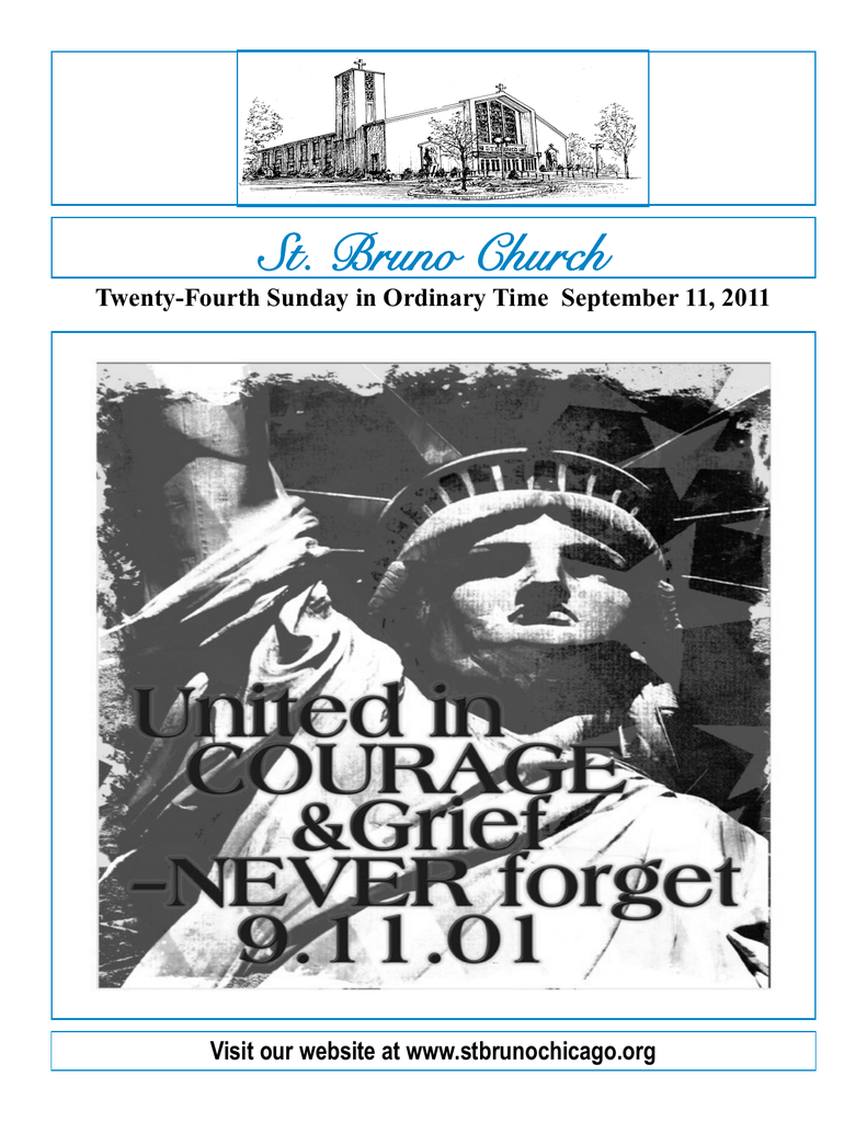 St. Bruno Church Twenty-Fourth Sunday in Ordinary Time September 11, 2011 Visit our website at www.stbrunochicago.org WEEK AT A GLANCE Sunday, September 11 PATRIOTS DAY 12:15 PM Chords for the Lord Monday, September 12 8:00 AM School Mass Tuesday, September 13 6:00 PM Devotions to Our Lady of Guadalupe (Spanish) 7:00 PM Boy Scouts Wednesday, September 14 6:00 PM Religious Education 6:30 PM Bible Study (Spanish) 7:00 PM Devotions to Our Lady of Perpetual Help (Polish) Thursday, September 15 9:00 AM - 6:00 PM Eucharistic Adoration 3:00 PM - 4:00 PM Confessions 5:00 PM - 6:00 PM Confessions 3:00 PM Divine Mercy Devotion (Polish) 4:00 PM Divine Mercy Devotion (English) 5:00 PM Divine Mercy Devotion (Spanish) 7:00 PM CAPS Meeting Friday, September 16 6:30 PM Cub Scouts 6:45 PM BINGO Saturday, September 17 6:00 PM Mexican Night Sunday, September 18 9:00 AM School Family Mass September 11, 2011 Budgeted Weekly Collection Goal $7,800.00 Sunday Collection 09-04-11 $5,091.25 THANK YOU FOR YOUR CONTINUED GENEROSITY. Aaron Xavi Padilla Son of Christina (Lara) Padilla and Edgar Padilla Sayuri Citlali Padilla Daughter of Mariana Chavez and Jose Luis Padilla Ian Gabriel Ramirez Son of Heidi (Ramirez) Ramirez and Herber Ramirez 3rd Publication Katarzyna Kesek and Slawomir Wijas Grace Salanda and Jaime Garcia ARCHER HEIGHTS CIVIC ASSOCIATION MEETING The next general membership meeting of the Archer heights Civic Association will be held on September 14th, at the UNO School , located at 47th & Kildare, starting at 7:30PM. This evening awards will be presented for House Beautiful for several homeowners with the best gardens in the Archer Heights Community. Coffee and cake will be served. Manolo Gael Vazquez Son of Julia (Vazquez) Vazquez and Rolando Vazquez Angel Manuel Fuentes Son of Vanessa Carrasco and Victor Fuentes Sebastian Alexander Guerrero Son of Veronica Carrasco and German Guerrero From the Pastor’s Desk…. Sometimes you hear people say they have let go of ill feelings, that they love everyone - but in the same conversation they mention something a person said to them last year - or twenty years ago. We forget names, we forget birthdays, but we do not forget injuries. We might bury hurts for a time, but they come back. The first step to forgiveness is to acknowledge offenses - what Jesus calls "debts."….. People who have deliberately offended do owe a kind of debt. But like the debtor in today's Gospel they are not likely to pay what they owe. So we have a choice: We can put them in jail, that is, cut them off - or we can release them, forgive the debt…… If we choose to forgive, how do we do it? There is only one way: the cross. We have to take our anger, our injuries, our hurts to the cross. The cross brings healing because when we stand before it, we recognize our guilt. If you or I were the only person who ever existed, Jesus would have died on the cross to bring forgiveness. Our sins have placed Jesus on the cross…… Your sins and mine are like the national debt - beyond imagining. In today's Gospel Jesus says we are like a debtor who owes a "huge amount." The original Greek is "ten thousand talents." In Jesus' time, it would have taken the average worker fifteen years to earn one talent. You get the point: fifteen by ten thousand is a lot of work - maybe what it would take to build the great pyramid. We owe a debt to God that none of us can pay off. Our only hope is the cross. On the cross Jesus cancelled our debt. Fr. Tony __________________________________________________________________________________________________________ Słowo „rozliczenie", które pojawia się w dzisiejszej Ewangelii, przypomina między innym o tym, że sprawiedliwość ma charakter dwustronny i dotyczy każdego z nas. W miarę łatwo przychodzi nam bowiem rozliczać i oceniać innych, sami jednak nie lubimy być przez nikogo oceniani czy rozliczani. Przykład, który ukazuje nam Ewangelia, nie jest więc bynajmniej z dalekiej przeszłości. Pokusa używania dwóch miar, jednej dla siebie, drugiej dla innych, jest wciąż aktualna, a może nawet silniejsza niż dawniej…… Czytając dziś słowo Boże, powinniśmy przede wszystkim pomyśleć, jaka jest nasza odpowiedź na wołanie bliźniego: „miej cierpliwość nade mną". Chodzi przecież o to, by każdy z nas, bez względu na stan posiadania czy władzę, miał taką właśnie wrażliwość na drugiego człowieka, jaką widzimy u króla rozliczającego się ze swymi sługami, oraz byśmy potrafili używać miary miłosierdzia nie tylko w stosunku do siebie, lecz również w stosunku do naszych bliźnich. Ks. Antoni ________________________________________________________________________________________ Si escogemos el perdon, como hacerlo? Hay una sola manera: la cruz. Hay que llevar nuestra colera, nuestros resentimientos, nuestras heridas a la cruz. La cruz trae perdon porque cuando estamos ante ella, reconocemos nuestra culpabilidad. Si tu o yo fuera la unica persona en el mundo, Jesus habria muerto en la cruz para traer perdon. Nuestros pecados han puesto a Jesus en la cruz….. Tus pecados y los mios son como la deuda nacional - imposible de imaginar. Shakespeare dijo, "Usar el hombre segun su merito y quien no seria flagelado?" Shakespeare no querria decir que toda persona habia cometido crimenes contra el estado. Pero lo hemos hecho contra Dios. El es pura bondad. En el evangelio Jesus dice que somos como un hombre que debe "muchos millones." El griego dice "diez mil talentos." Un trabajador tipico tendria que obrar quince años para ganar un talento. Como se puede ver, tenemos una deuda a Dios que jamas podemos pagar. Nuestra unica esperanza es la cruz. En la cruz Jesus ha cancelado nuestra deuda. Padre Antonio There are many things happening in Room 206 this year! First, second grade has now taken over what the sixth graders used to use as a classroom. Secondly, Room 206 has a wonderful library area that is used for read-alouds and mi
