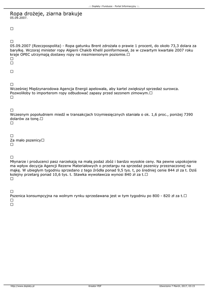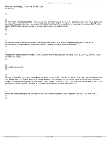 .:: Dopłaty i Fundusze - Portal Informacyjny ::. Ropa drożeje, ziarna brakuje 05.09.2007. 05.09.2007 (Rzeczpospolita) - Ropa gatunku Brent zdrożała o prawie 1 procent, do około 73,3 dolara za baryłkę. Wczoraj minister ropy Algierii Chakib Khelil poinformował, że w czwartym kwartale 2007 roku kraje OPEC utrzymają dostawy ropy na niezmienionym poziomie. Wcześniej Międzynarodowa Agencja Energii apelowała, aby kartel zwiększył sprzedaż surowca. Pozwoliłoby to importerom ropy odbudować zapasy przed sezonem zimowym. Wczesnym popołudniem miedź w transakcjach trzymiesięcznych staniała o ok. 1,6 proc., poniżej 7390 dolarów za tonę. Za mało pszenicy Młynarze i producenci pasz narzekają na małą podaż zbóż i bardzo wysokie ceny. Na pewne uspokojenie ma wpływ decyzja Agencji Rezerw Materiałowych o przetargu na sprzedaż pszenicy przeznaczonej na mąkę. W ubiegłym tygodniu sprzedano z tego źródła ponad 9,5 tys. t, po średniej cenie 844 zł za t. Dziś kolejny przetarg ponad 10,6 tys. t. Stawka wywoławcza wynosi 840 zł za t. Pszenica konsumpcyjna na wolnym rynku sprzedawana jest w tym tygodniu po 800 - 820 zł za t. http://www.doplaty.pl Kreator PDF Utworzono 7 March, 2017, 03:15