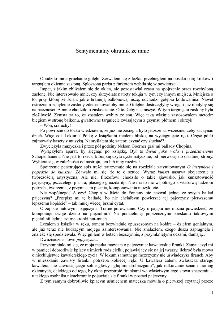 Sentymentalny okrutnik ze mnie Obudziło mnie gruchanie gołębi. Zerwałem się z łóżka, przebiegłem na bosaka parę kroków i targnąłem okienną zasłoną. Spłoszona parka z furkotem wzbiła się w powietrze. Impet, z jakim zbliżałem się do okien, nie pozostawiał czasu na spojrzenie przez rozchyloną zasłonę. Nie interesowało mnie, czy skrzydlate natręty tokują w tym czy innym miejscu. Mniejsza o to, przy której ze ścian, jakie bramują balkonową niszę, odchodzi gołębia kotłowanina. Nawet ostrożne rozchylenie zasłony zdemaskowałoby mnie. Gołębie dostrzegłyby wroga i już miałyby się na baczności. A mnie chodziło o zaskoczenie. O to, żeby nastraszyć. W tym targnięciu zasłony była złośliwość. Zemsta za to, że zostałem wybity ze snu. Więc taką właśnie zastosowałem metodę: biegiem w stronę balkonu, gwałtowne targnięcie zwisającym z gzymsu płótnem i okrzyk: – Won, sraluchy! Po powrocie do łóżka wiedziałem, że już nie zasnę, a było jeszcze za wcześnie, żeby zaczynać dzień. Więc co? Lektura? Półkę z książkami miałem blisko, na wyciągnięcie ręki. Część półki zajmowały kasety z muzyką. Namyślałem się zatem: czytać czy słuchać? Zwyciężyła muzyczka i przez pół godziny Nelson Goerner grał mi ballady Chopina. Wyłączyłem aparat, by sięgnąć po książkę. Był to Świat jako wola i przedstawienie Schopenhauera. Nie jest to rzecz, którą się czyta systematycznie, od pierwszej do ostatniej strony. Wybiera się, w zależności od nastroju, ten lub inny rozdział. Spojrzenie penetrujące spis treści zatrzymuje się na rozdziale zatytułowanym O instynkcie i popędzie do kunsztu. Zdawało mi się, że to o sztuce. Wyraz kunszt nasuwa skojarzenie z twórczością artystyczną. Ale nie, filozofowi chodziło o takie zjawisko, jak kunsztowność pajęczyny, pszczelego plastra, ptasiego gniazda itp. Nie ma to nic wspólnego z właściwą ludziom potrzebą tworzenia, z przymusem pisania, komponowania muzyki etc. Nic wspólnego? A czyż Chopin w liście do Fontany nie nazwał jednej ze swych ballad pajęczyną? „Przepisz mi tę balladę, bo nie chciałbym powierzać tej pajęczyny pierwszemu lepszemu kopiście” – tak mniej więcej brzmi cytat. O zapisie nutowym: pajęczyna. Trafne porównanie. Czy o pająku nie można powiedzieć, że komponuje swoje dzieło na pięciolinii? Na podzielonej poprzecznymi kreskami taktowymi pięciolinii lądują czarne kropki nut-much. Leżałem z książką w ręku, tomem bezwładnie opuszczonym na kołdrę – dziełem genialnym, ale już teraz nie budzącym mojego zainteresowania. Nie znalazłem, czego dusza zapragnęła i znaleźć się spodziewała. Więc gniłem w betach bezczynnie, z przymkniętymi oczami, dumając. Dwuznaczne słowo pajęczyna... Przypomniało mi się, że moja matka mawiała o pajęczynie: kawalerskie firanki. Zamajaczył mi w pamięci dobrotliwie kpiący uśmiech rodzicielki, pojawiający się na jej twarzy, ilekroć była mowa o niechlujstwie kawalerskiego życia. W lokum samotnego mężczyzny nie uświadczysz firanek. Aby w mieszkaniu zawisły firanki, potrzeba kobiecej ręki. U kawalera zatem, zwłaszcza starego kawalera, nie zawracającego sobie głowy „głupimi drobiazgami”, jak odkurzanie ścian i framug okiennych, dalekiego od tego, by okna przystroić firankami we właściwym tego słowa znaczeniu – u takiego osobnika nieuchronnie pojawiają się firanki w postaci pajęczyny. Z tym samym dobrotliwie kpiącym uśmiechem mateczka mówiła o pierwszej czytanej przeze 1 mnie książce i reakcji, jaką w jej ośmio- czy dziewięcioletnim synalku wzbudzały perypetie głównego bohatera. Był nim Pinokio, drewniana kukiełka, którą matka nazywała patykiem: – Płakałeś nad tym patykiem – wspominała. – Uczuciowy byłeś. Inna moja wczesna lektura: Tajemnica skrzydlatego serca. Ależ bym chciał tę książkę teraz mieć! Poważny, hiperintelektualny Schopenhauer zostałby z miejsca odłożony na półkę, a na kołdrę sfrunęłoby infantylne Skrzydlate serce. Niestety, straciłem je, i to z własnej winy. Głupi pomysł strzelił mi do głowy – aby podarować czytadełko swojej kuzynce. Była młodsza ode mnie, a ja już „kawaler”. Zdawało mi się, że już nigdy nie zachce mi się tej dziecinnej powiastki, więc – dać ją niejako w spadku „szkrabowi”. A tak by się chciało staremu piernikowi wrócić do niektórych scen, choćby tej, jakże zabawnej a wzruszającej, z panem sędzią w roli głównej. Oto pan sędzia, właściciel położonej wśród sosen willi, jegomość dostojny, acz zachowujący się jak sztubak. Zamiast skorzystać z furtki, przełazi przez płot. Chłopcom, którzy byli świadkami tych gimnastycznych wyczynów, wyjaśnia z zażenowaniem: ptaki uwiły gniazdo w takim miejscu, że otwarcie furtki spowodowałoby zniszczenie owej kunsztownej konstrukcji. Pan sędzia, miłośnik ptactwa i całej przyrody, stał się dobrowolnym niewolnikiem skrzydlatej gawiedzi. Furkot gołębich skrzydeł wyrwał mnie z sielskich wspomnień. Uczułem rozdrażnienie. Czemu to draństwo uczepiło się mojego balkonu, skoro tyle innych lodżii pokrywa fasadę dziesięciopiętrowego bloku?! Wylazłem z łóżka i podkradłem się do okien. I znowu, podobnie jak godzinę wcześniej, furkotowi podbitej w górę zasłony odpowiedział furkot ptasich skrzydeł. Tym razem nie udało się natrętów całkiem przepędzić. Spłoszone przefrunęły z jednego krańca balkonu na drugi. I tyle. Jakiś bezczelny upór w gadzinach. Przekroczyłem próg balkonowych drzwi, a parka, obserwując mnie, dreptała po drugiej stronie balustrady, bocząc się, lecz nie kwapiąc do odlotu. Rozejrzawszy się odkryłem przyczynę ptasiej namolności. Na posadzce, w załomie dwu ścian pojawił się zalążek gniazda. Z niemałym kunsztem zdążyło gołębie stadło ułożyć w krąg kilkanaście cienkich, wiotkich gałązek. Podszed