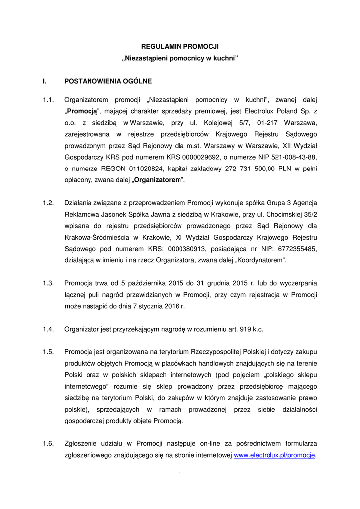 REGULAMIN PROMOCJI „Niezastąpieni pomocnicy w kuchni” I. POSTANOWIENIA OGÓLNE 1.1. Organizatorem promocji „Niezastąpieni pomocnicy w kuchni”, zwanej dalej „Promocją”, mającej charakter sprzedaży premiowej, jest Electrolux Poland Sp. z o.o. z siedzibą zarejestrowana w w Warszawie, rejestrze przy ul. Kolejowej przedsiębiorców 5/7, Krajowego 01-217 Warszawa, Rejestru Sądowego prowadzonym przez Sąd Rejonowy dla m.st. Warszawy w Warszawie, XII Wydział Gospodarczy KRS pod numerem KRS 0000029692, o numerze NIP 521-008-43-88, o numerze REGON 011020824, kapitał zakładowy 272 731 500,00 PLN w pełni opłacony, zwana dalej „Organizatorem”. 1.2. Działania związane z przeprowadzeniem Promocji wykonuje spółka Grupa 3 Agencja Reklamowa Jasonek Spółka Jawna z siedzibą w Krakowie, przy ul. Chocimskiej 35/2 wpisana do rejestru przedsiębiorców prowadzonego przez Sąd Rejonowy dla Krakowa-Śródmieścia w Krakowie, XI Wydział Gospodarczy Krajowego Rejestru Sądowego pod numerem KRS: 0000380913, posiadająca nr NIP: 6772355485, działająca w imieniu i na rzecz Organizatora, zwana dalej „Koordynatorem”. 1.3. Promocja trwa od 5 października 2015 do 31 grudnia 2015 r. lub do wyczerpania łącznej puli nagród przewidzianych w Promocji, przy czym rejestracja w Promocji może nastąpić do dnia 7 stycznia 2016 r. 1.4. Organizator jest przyrzekającym nagrodę w rozumieniu art. 919 k.c. 1.5. Promocja jest organizowana na terytorium Rzeczypospolitej Polskiej i dotyczy zakupu produktów objętych Promocją w placówkach handlowych znajdujących się na terenie Polski oraz w polskich sklepach internetowych (pod pojęciem „polskiego sklepu internetowego” rozumie się sklep prowadzony przez przedsiębiorcę mającego siedzibę na terytorium Polski, do zakupów w którym znajduje zastosowanie prawo polskie), sprzedających w ramach prowadzonej przez siebie działalności gospodarczej produkty objęte Promocją. 1.6. Zgłoszenie udziału w Promocji następuje on-line za pośrednictwem formularza zgłoszeniowego znajdującego się na stronie internetowej www.electrolux.pl/promocje. 1 1.7. Celem Promocji jest promocja wskazanych w punkcie 2.1. niniejszego regulaminu produktów, których producentem lub dystrybutorem jest Organizator (zwanych dalej „Produktami”), służąca zwiększeniu ich sprzedaży. II. WARUNKI UCZESTNICTWA W PROMOCJI I ZGŁOSZENIE UDZIAŁU W PROMOCJI 2.1. Promocją objętych jest 7 modeli robotów kuchennych z serii Kitchen Assistent marki Electrolux: EKM4000, EKM4100, EKM4200, EKM4300, EKM4400, EKM4500, EKM4900. 2.2. Promocja jest przeznaczona wyłącznie dla osób fizycznych, które spełniają wszystkie poniższe warunki: a) ukończyły 18. rok życia; b) posiadają miejsce zamieszkania na terytorium Rzeczypospolitej Polskiej; c) posiadają pełną zdolność do czynności prawnych; d) kupują Produkty jako konsumenci w rozumieniu art. 221 kodeksu cywilnego (ustawa z dn. 16 kwietnia 1964 r. Kodeks cywilny, tekst jedn. Dz. U. z 2014 r. poz.121 z pózn. zm.). W Promocji mogą zatem uczestniczyć osoby fizyczne będące przedsiębiorcami, jeżeli zakup Produktów nie ma bezpośredniego związku z prowadzona przez nich działalnością gospodarcza lub zawodowa; e) w okresie od 5 października 2015 r. do 7 stycznia 2016 r. dokonają zgłoszenia do Promocji Produktu zakupionego przez siebie w czasie trwania Promocji tj. od 5 października 2015 do 31 grudnia 2015 r., na stronie internetowej www.electrolux.pl/promocje wypełniając dostępny na tej stronie formularz zgłoszeniowy i podając następujące dane: imię, nazwisko, adres zamieszkania lub adres do korespondencji (miejscowość, ulica, numer domu lub lokalu, kod pocztowy), numer telefonu kontaktowego, adres e-mail, numer dowodu zakupu (paragonu lub faktury), jak również model zakupionego urządzenia oraz jego numer seryjny. W ramach rejestracji konieczne jest przesłanie skanu dowodu zakupu Produktu (paragonu fiskalnego lub faktury). Do ukończenia rejestracji niezbędne jest podanie wszystkich powyższych danych oraz przesłanie skanu paragonu/faktury. Z momentem zatwierdzenia formularza rejestracyjnego, osoba 2 spełniająca wszystkie warunki, o których mowa w niniejszym punkcie 2.2., staje się uczestnikiem Promocji (dalej jako: „Uczestnik”). 2.3. Uczestnik, który spełnił warunek opisany w punkcie 2.2. niniejszego regulaminu i otrzymał jedną z nagród, o których mowa w punkcie 3.2., może brać udział w Promocji kolejny raz, jednak każdorazowo powinien wypełnić ponownie formularz online na stronie www.electrolux.pl/promocje zgłaszając Produkt dotąd nie zgłoszony w ramach Promocji. 2.4. W Promocji nie mogą uczestniczyć właściciele (współwłaściciele), wspólnicy, lub osoby zatrudnione w jakiejkolwiek formie prawnej (na podstawie umowy o pracę, umowy zlecenia etc.) w punktach sprzedaży detalicznej lub hurtowej, prowadzących sprzedaż Produktów Organizatora oraz członkowie ich rodzin. 2.5. Przez członków rodziny, o których mowa w punkcie 2.4., rozumie się: wstępnych, zstępnych, rodzeństwo, małżonków, małżonków rodzeństwa, rodziców małżonków, kuzynów i osoby pozostające w stosunku przysposobienia. 2.6. Udział w Promocji i podanie związanych z udziałem danych jest całkowicie dobrowolne. 2.7. Uczestnik, który dokonał zgłoszenia udziału w Promocji, otrzyma informację o przeprowadzaniu weryfikacji prawidłowości jego zgłoszenia. 2.8. Podstawą uznania zgłoszenia za nieprawidłowe i odmowy przyznania nagrody może być m.in. podanie w zgłoszeniu danych lub dołączenie dowodów zakupu, dotyczących zakupionych Produktów, zbieżnych z danymi Produktów/dowodami zakupu zgłoszonymi w ramach Promocji przez tą samą lub inną osobę. W przypadku dokonania zgłoszenia w oparciu o te same dane dotyczące Produktów/te same dowody zakupu przez różne osoby, Organizator dokona weryfikacji posiadania przez zgłaszających się oryginałów do